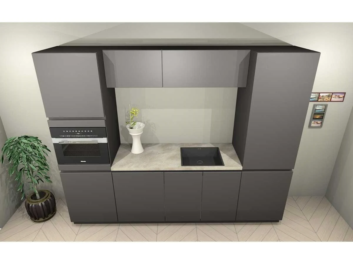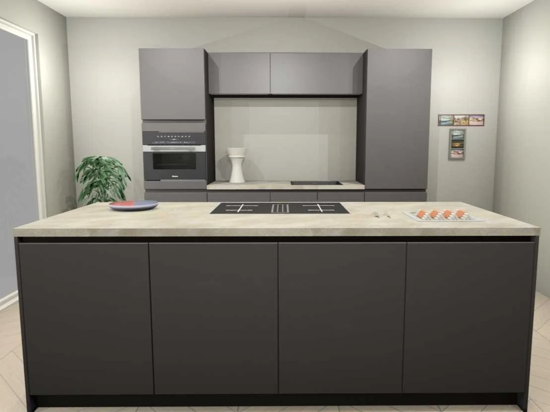 Miele KMDA7473FR-U Inductiekookplaat inclusief afzuigsysteem, 4 kookzones, 2 flex zones, 80cm. Let op! Staat niet opgesteld in de showroom, enkel via 3D tekening; wordt geleverd ongebruikt in doos. Let op! Excl. Kraan en accessoires. Nee Merk: Häcker Concept130 Model: TOP SOFT-GL grafiet mat lak Type keukenopstelling: Eiland Lengte: 270cm Breedte: 60cm Hoogte: 218cm Gootsteen: Reginox amsterdam 50 pure black Pure opbouw Werkblad hoogte: 92cm Aanrechtblad: HPL kalksteen repro (115) 3.8cm Softclose: true Oven: Miele H7240BMCLST Compacte multifunctionele oven met magnetronfunctie PureLine, inhoud 43 liter, nis 45cm Vaatwasser: Miele G5150SCVI Volledig integreerbare vaatwasmachine met 5 reinigingsprogramma's waaronder QuickPowerWash, 3 opties, capaciteit 14 couverts, geluidsniveau 45 dB(A) Lengte kookeiland: 244cm Breedte kookeiland: 100cm Hoogte kookeiland: 92cm Plintkleur: grafiet mat Hoofdkleur: grafiet mat lak Style: Modern greeploos Kleur: grafiet mat lak