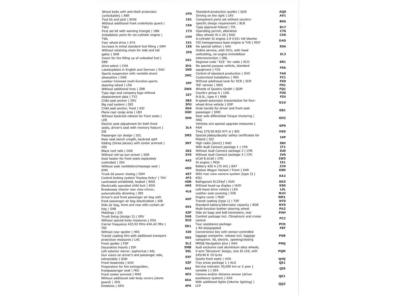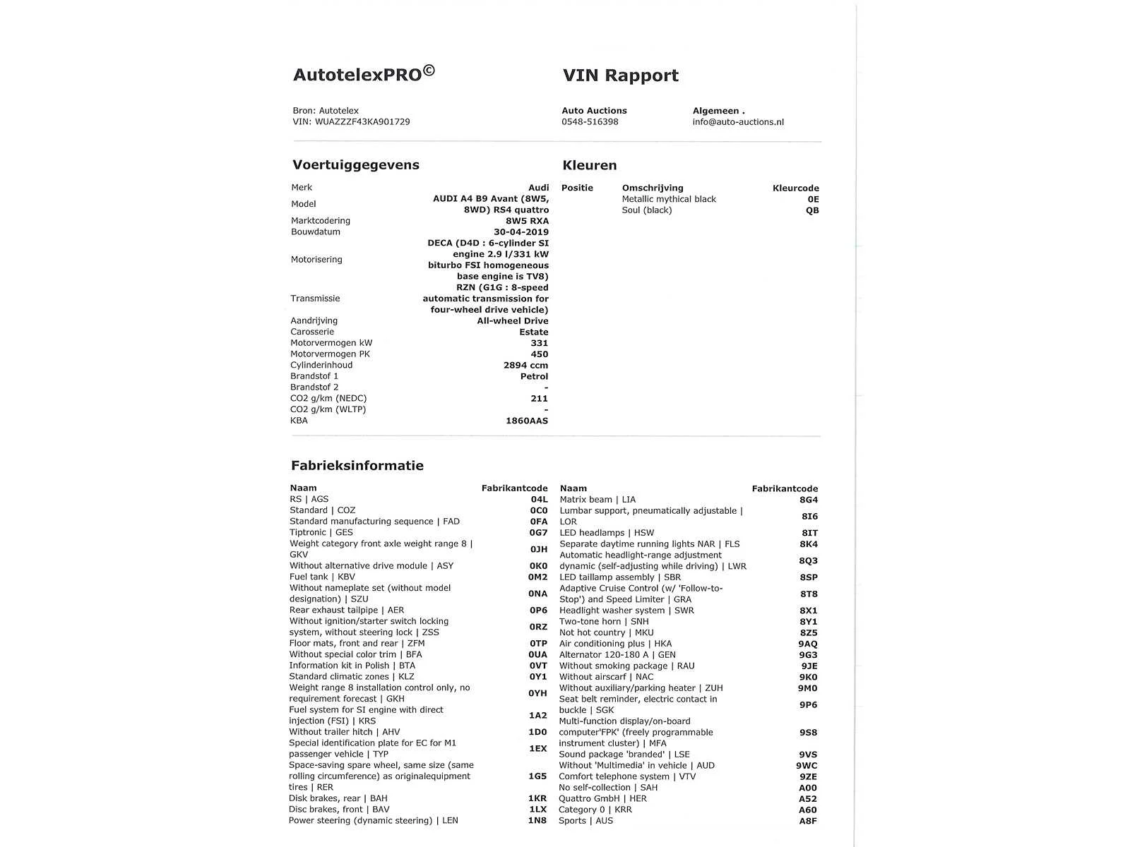 Voor export dient u de bpm als borg te betalen en krijgt u deze later terug zodra wij deze ontvangen hebben van de belastingdienst. Tussen de afbeeldingen en in de bijlage vindt u het VIN Rapport met Fabrieksinformatie en Opties en Accessoires. Voor vragen kunt u mailen naar info@auto-auctions.nl No Kenteken: P-072-RN Merk: Audi Model: RS4 Avant Type: 2.9 TFSI quattro Afgelezen kilometerstand: 122925km Cilinderinhoud: 2894cc Vermogen (kW): 331kW Brandstof: Benzine Chassisnummer: WUAZZZF43KA901729 NAP status: Geen oordeel Datum eerste toelating: 2019-05-21 Datum eerste toelating (NL): 2022-05-18 APK vervaldatum: 2027-06-04 Vermogen (pk): 450hp Aandrijving: Vierwielaandrijving Aantal zitplaatsen: 5 Maximaal trekgewicht ongeremd: 750kg Maximaal trekgewicht geremd: 1900kg Kleur: Zwart Transmissie: Automaat Emissieklasse: 6 Aantal deuren: 4 Aantal sleutels: 2 Ledig gewicht: 1730kg Bruto BPM (NL): 18483€ Rest BPM: 5400€ Aantal cilinders: 6 Carrosserie: Stationwagen Onderhoudshistorie: Niet Aanwezig Carfax Link: https://was.carfax.eu/v0/api/ccdid/5100016408/svc/201/vinreg/P072RN/checksum/eyJhbGciOiJIUzI1NiIsInR5cCI6IkpXVCJ9.eyJleHAiOjE3NTg1NDgyNzR9.yU8nEb7Eu03qdBwjDqP7M8xOl5Jgl5zvJq3sZ1TGb9Q Start en rijdt: Ja