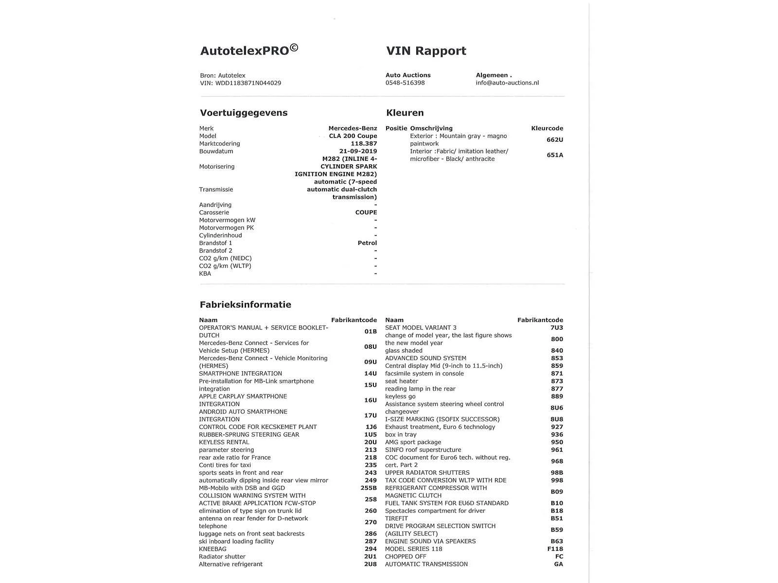 Let op deze auto is niet aanwezig op de kijkdag zonder afspraak als u deze auto wilt bezichtigen op de kijkdag maak dan eerst afspraak met ons via info@auto-auctions.nl dan zorgen wij dat deze auto bij ons staat op de kijkdag. Voor vragen kunt u mailen naar info@auto-auctions.nl No Kenteken: G-294-FV Merk: Mercedes-Benz Model: CLA-klasse Type: 200 Business Solution AMG Afgelezen kilometerstand: 55587km Cilinderinhoud: 1332cc Vermogen (kW): 120kW Brandstof: Benzine Chassisnummer: WDD1183871N044029 NAP status: Logisch Datum eerste toelating: 2019-09-21 Datum eerste toelating (NL): 2019-09-21 APK vervaldatum: 2025-09-21 Vermogen (pk): 163hp Aantal zitplaatsen: 5 Maximaal trekgewicht ongeremd: 710kg Maximaal trekgewicht geremd: 1600kg Kleur: Mountain Grey Transmissie: Automaat Emissieklasse: 6 Aantal deuren: 4 Ledig gewicht: 1320kg Bruto BPM (NL): 6003€ Rest BPM: 1854€ Aantal cilinders: 4 Carrosserie: Sedan Onderhoudshistorie: Digitaal Carfax Link: https://was.carfax.eu/v0/api/ccdid/5100016408/svc/201/vinreg/G294FV/checksum/eyJhbGciOiJIUzI1NiIsInR5cCI6IkpXVCJ9.eyJleHAiOjE3NjAyODAzMDZ9.i9aBdhtFTDDl4kkXkU-NS7vGDFg_gA8Mn2tXHl-M0MQ Start en rijdt: Ja