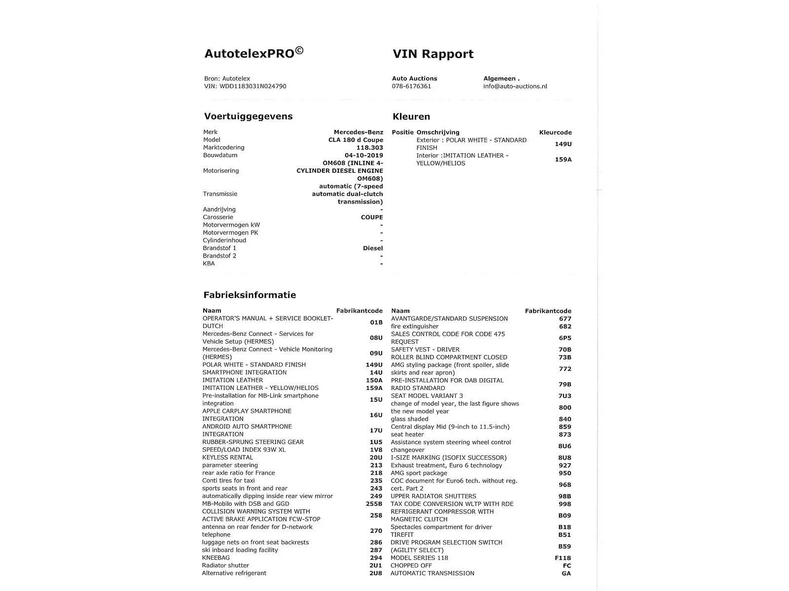 Voor vragen kunt u mailen naar info@auto-auctions.nl Achteruitrijcamera is kapot en er is een stukje afgebroken van de koplamp No Kenteken: GVT-84-P Merk: Mercedes-Benz Model: CLA-klasse Type: 180 d Prem. Plus Afgelezen kilometerstand: 205657km Cilinderinhoud: 1461cc Vermogen (kW): 85kW Brandstof: diesel Chassisnummer: WDD1183031N024790 NAP status: Geen oordeel Datum eerste toelating: 2019-10-04 Datum eerste toelating (NL): 2024-12-05 APK vervaldatum: 2025-10-04 Vermogen (pk): 116hp Aantal zitplaatsen: 5 Maximaal trekgewicht ongeremd: 745kg Maximaal trekgewicht geremd: 1400kg Kleur: wit Transmissie: Automaat Emissieklasse: 6 Aantal deuren: 4 Aantal sleutels: 2 Ledig gewicht: 1390kg Bruto BPM (NL): 985€ Rest BPM: 320€ Aantal cilinders: 4 Carrosserie: sedan Onderhoudshistorie: Digitaal Carfax Link: https://was.carfax.eu/v0/api/ccdid/5100016408/svc/201/vinreg/GVT84P/checksum/eyJhbGciOiJIUzI1NiIsInR5cCI6IkpXVCJ9.eyJleHAiOjE3NTExMDUzNzB9.VrFx17JA0Qdj0RX7seoI6_eyAAWd0qD5s9dj2Bb55qQ