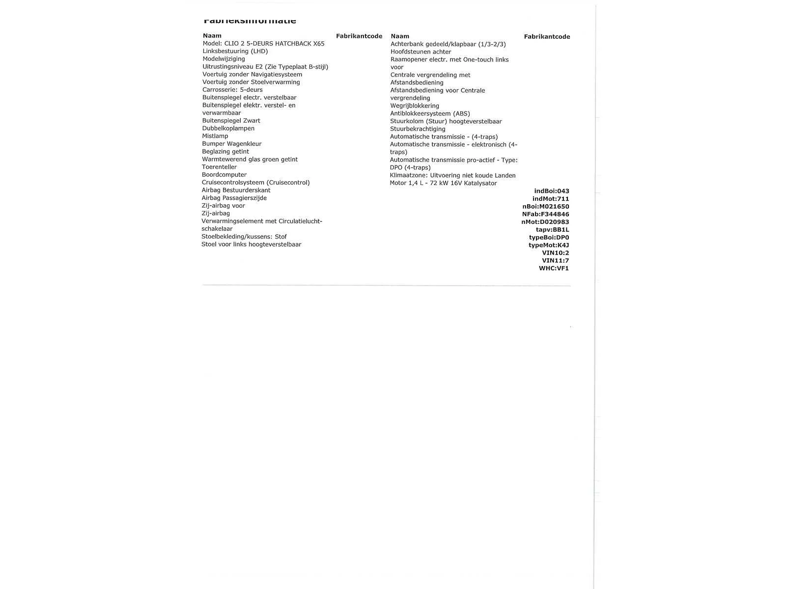 Voor vragen kunt u mailen naar info@auto-auctions.nl No Kenteken: 44-LJ-FN Merk: Renault Model: Clio Type: 1.4-16V Expression Afgelezen kilometerstand: 279632km Cilinderinhoud: 1390cc Vermogen (kW): 72kW Brandstof: Benzine Chassisnummer: VF1BB1L0A27903071 NAP status: Onlogisch Datum eerste toelating: 2003-01-17 Datum eerste toelating (NL): 2003-01-17 APK vervaldatum: 2025-03-28 Vermogen (pk): 98hp Energielabel: D Aantal zitplaatsen: 5 Maximaal trekgewicht ongeremd: 550kg Maximaal trekgewicht geremd: 1200kg Kleur: groen Transmissie: Automaat Emissieklasse: 3 Aantal deuren: 4 Aantal sleutels: 1 Ledig gewicht: 1005kg Bruto BPM (NL): 3005€ Aantal cilinders: 4 Carrosserie: hatchback CO2-uitstoot NEDC: 174 Onderhoudshistorie: Niet Aanwezig Carfax Link: https://was.carfax.eu/v0/api/ccdid/5100016408/svc/201/vinreg/44LJFN/checksum/eyJhbGciOiJIUzI1NiIsInR5cCI6IkpXVCJ9.eyJleHAiOjE3NjQzMjk0Nzl9.AF9U-ZFjCycJDnrJ-Oi6sLdcLuX6UVHF6clHFBYdZD0 Start en rijdt: Ja