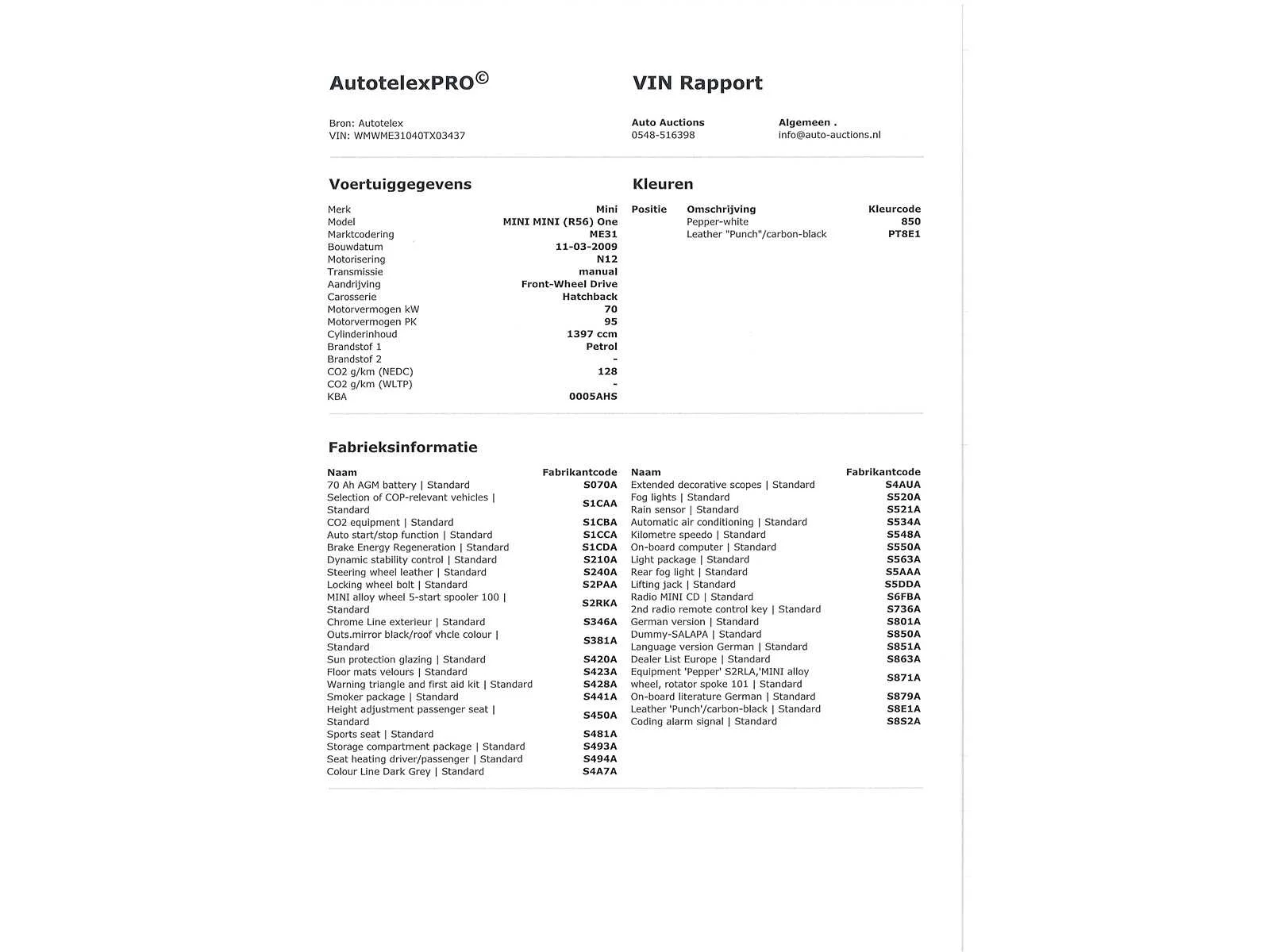 Voor vragen kunt u mailen naar info@auto-auctions.nl Let op de Accu van de auto is leeg, En het motor lampje brand, en de auto heeft ook hagelschade. No Kenteken: Duitse kenteken papieren Merk: Mini Cooper Model: One R56 Afgelezen kilometerstand: 175610km Cilinderinhoud: 1397cc Vermogen (kW): 70kW Brandstof: Benzine Chassisnummer: WMWME31040TX03437 Datum eerste toelating: 27-03-2009 Vermogen (pk): 95hp Aantal zitplaatsen: 4 Transmissie: Handgeschakeld Aantal deuren: 2 Aantal sleutels: 2 Aantal cilinders: 4 Carrosserie: Hatcback Onderhoudshistorie: Gedeeltelijk Aanwezig Start en rijdt: Ja