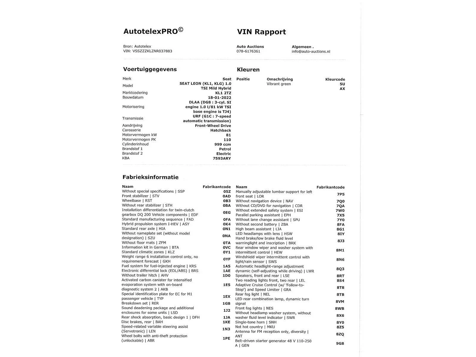 Duitse kenteken papieren. Indien gewenst kunnen wij het gehele import proces voor u verzorgen, RDW invoer, BPM taxatie, Douane afwikkeling, stalling etc. Voor deze auto zijn de totale invoerkosten inclusief de BPM €1.795.- Dus voor €1.795.- boven op uw aankoopprijs verzorgen wij het NL kenteken voor u. (This option is only for Dutch buyers) Voor vragen kunt u mailen naar info@auto-auctions.nl No Kenteken: Duitse kenteken papieren Merk: Seat Model: Leon Type: 1.0 eTSI MHEV Afgelezen kilometerstand: 41880km Cilinderinhoud: 999cc Vermogen (kW): 81kW Brandstof: Benzine Chassisnummer: VSSZZZKLZNR037883 Datum eerste toelating: 24-02-2022 Vermogen (pk): 110hp Kleur: Asphalt Blue Transmissie: Automaat Aantal deuren: 5 Aantal sleutels: 2 Carrosserie: Hatchback Nationaliteit documenten: Duitse kenteken papieren Onderhoudshistorie: Digitaal volledig aanwezig Start en rijdt: Ja