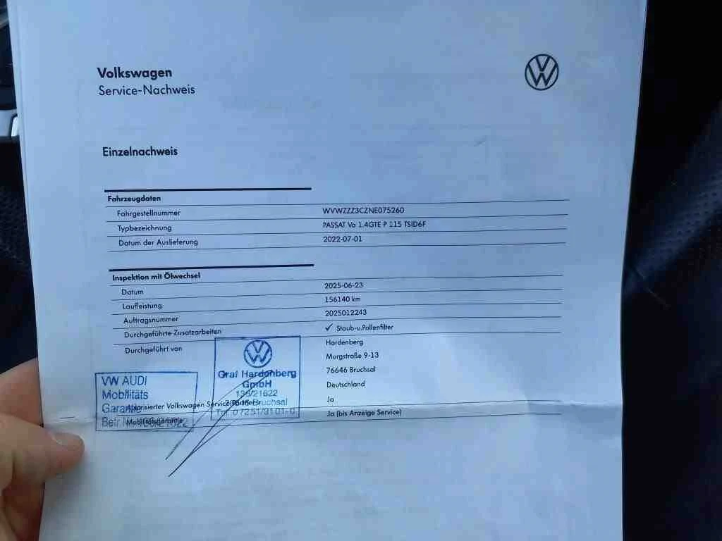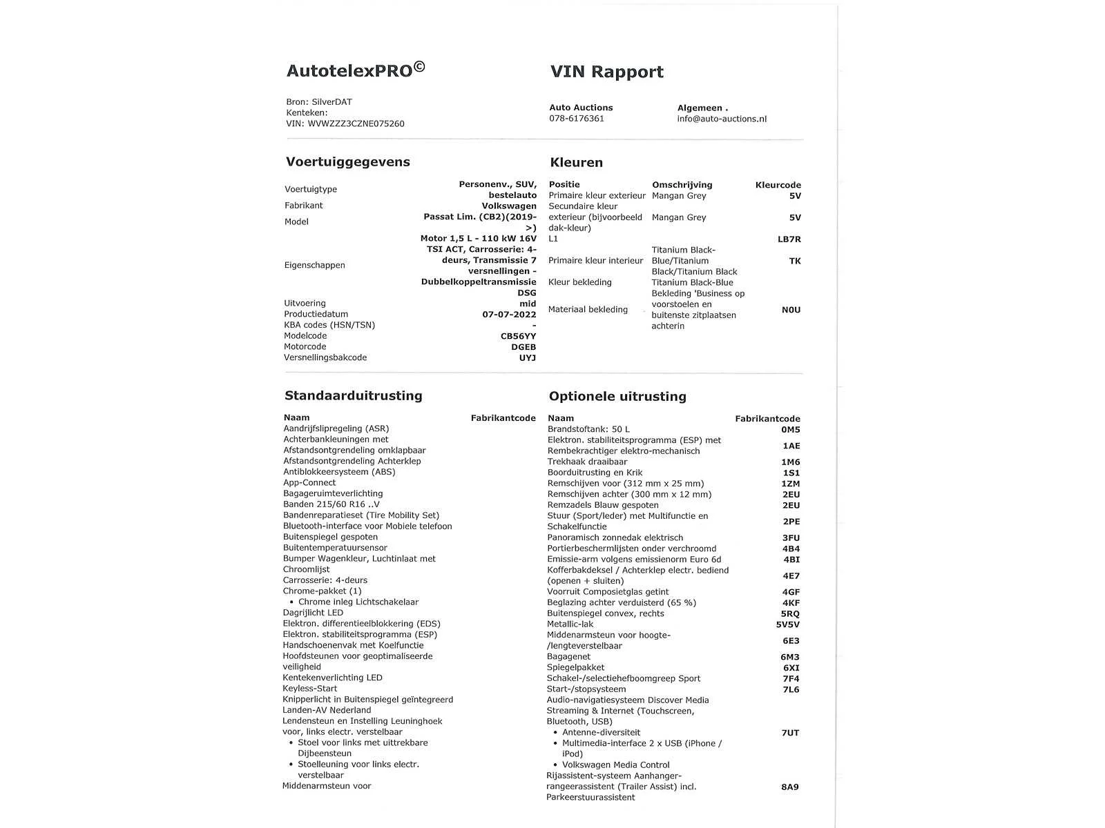 Duitse kenteken papieren. Indien gewenst kunnen wij het gehele import proces voor u verzorgen, RDW invoer, BPM taxatie, Douane afwikkeling, stalling etc. Voor deze auto zijn de totale invoerkosten inclusief de BPM €1.195.- Dus voor €1.195.- boven op uw aankoopprijs verzorgen wij het NL kenteken voor u. (This option is only for Dutch buyers) Voor vragen kunt u mailen naar info@auto-auctions.nl No Kenteken: Duitse kenteken papieren Merk: Volkswagen Model: Passat Type: Variant GTE 1.4 TSI PHEV Afgelezen kilometerstand: 156723km Cilinderinhoud: 1395cc Vermogen (kW): 160kW Brandstof: Hybride Benzine Chassisnummer: WVWZZZ3CZNE075260 Datum eerste toelating: 24-06-2022 Vermogen (pk): 218hp Aantal zitplaatsen: 5 Kleur: Mangang Grey Metallic Transmissie: Automaat Aantal deuren: 5 Aantal sleutels: 2 Velgmaat: 17 Aantal cilinders: 4 Carrosserie: Stationwagen Nationaliteit documenten: Duitse kenteken papieren Onderhoudshistorie: Digitaal volledig aanwezig Start en rijdt: Ja oplaadkabel : Aanwezig