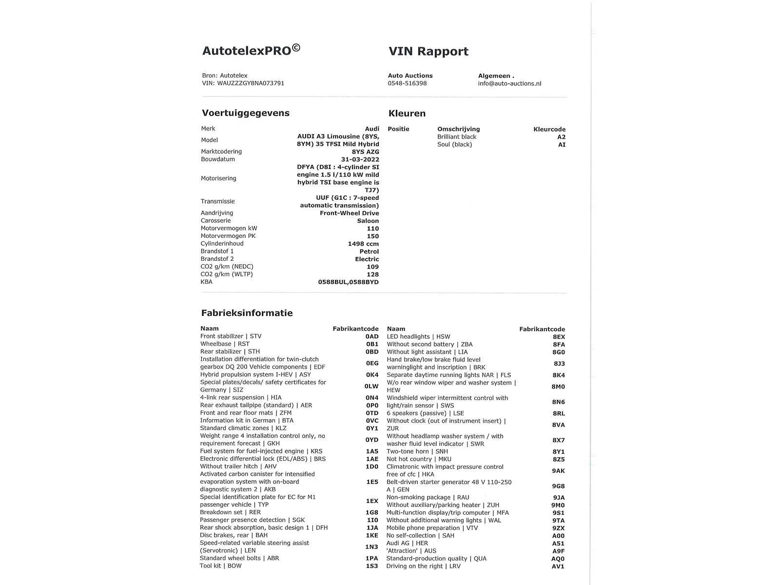 Duitse kenteken papieren. Indien gewenst kunnen wij het gehele import proces voor u verzorgen, RDW invoer, BPM taxatie, Douane afwikkeling, stalling etc. Voor deze auto zijn de totale invoerkosten inclusief de BPM €1.750.- Dus voor €1.750.- boven op uw aankoopprijs verzorgen wij het NL kenteken voor u. (This option is only for Dutch buyers) Voor vragen kunt u mailen naar info@auto-auctions.nl No Kenteken: Duitse kenteken papieren Merk: Audi Model: A3 Limousine Type: 35 TFSI Afgelezen kilometerstand: 56443km Cilinderinhoud: 1498cc Vermogen (kW): 110kW Brandstof: Benzine Chassisnummer: WAUZZZGY8NA073791 Datum eerste toelating: 09-06-2022 Vermogen (pk): 150hp Aantal zitplaatsen: 5 Kleur: Brilliant Black Transmissie: Automaat Aantal deuren: 5 Aantal sleutels: 2 Velgmaat: 16 Aantal cilinders: 4 Carrosserie: Sedan Nationaliteit documenten: Duitse kenteken papieren Onderhoudshistorie: Digitaal volledig aanwezig Start en rijdt: Ja