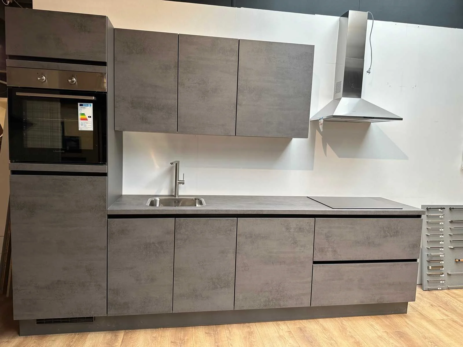 “Laurus” LCA60 keramische kookplaat 60cm zwart glas; “zonder kraan en accessoires. Let op! wordt geleverd ongebruikt in doos; Nee Merk: Nobilia Model: Riva decor beton schiefergrijs mat Type keukenopstelling: recht Lengte: 300cm Breedte: 50cm Hoogte: 217cm Gootsteen: Reginox colorado rvs spoelbak Werkblad hoogte: 91cm Aanrechtblad: HPL kunststof decor beton schiefergrijs Koelkast: Laurus koeler 88cm, sleepdeur systeem Softclose: true Oven: Laurus LEB inbouwbakoven 60cm Afzuigkap: Elica Missydt90 rvs kleur 90cm Vaatwasser: Laurus LSV604 volledig geïntegreerd vaatwasser Plintkleur: beton schiefergrijs mat Hoofdkleur: beton schiefergrijs mat Style: modern Kleur: beton schiefergrijs mat