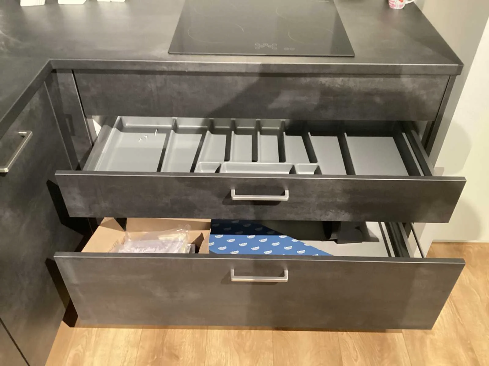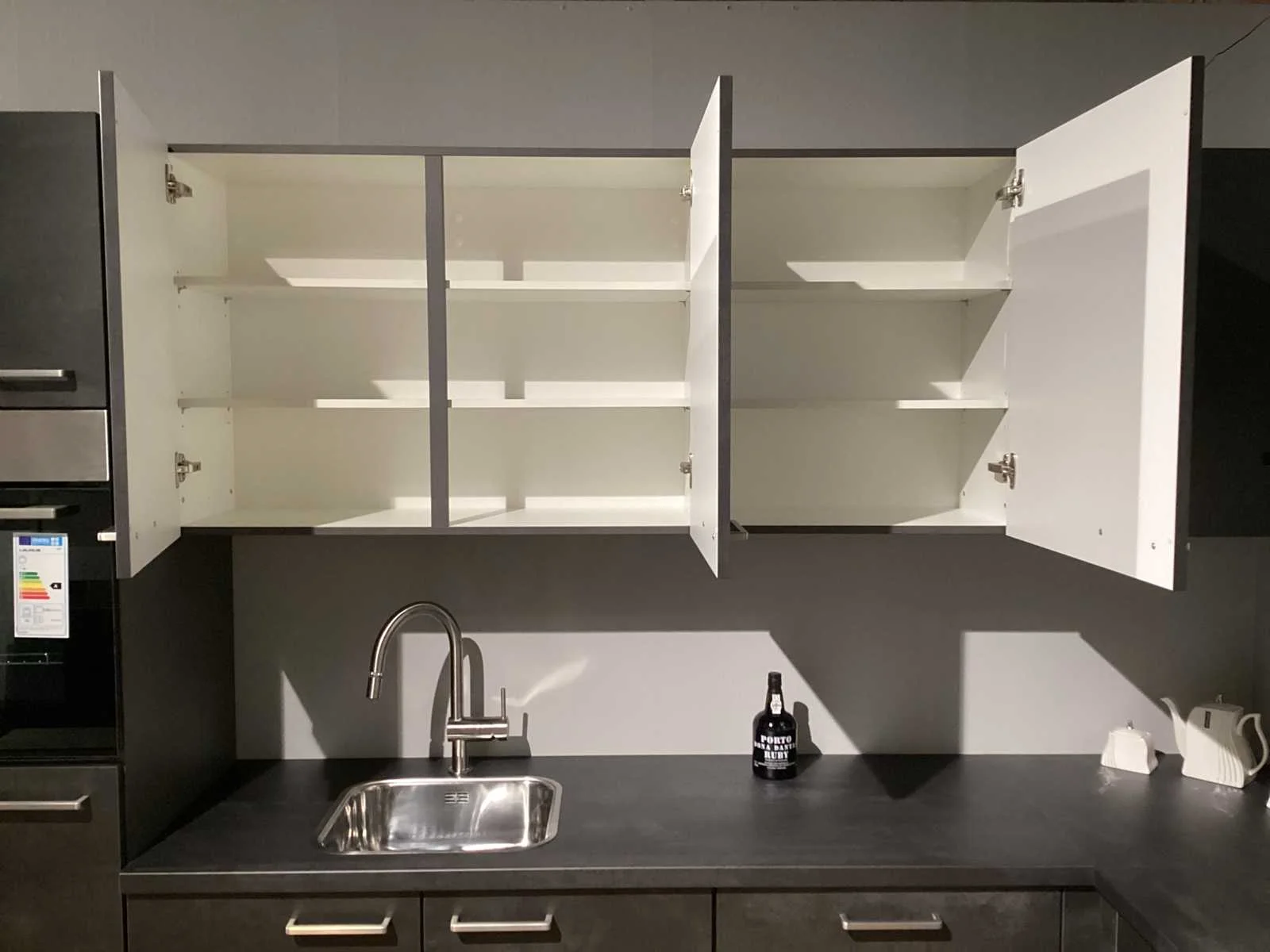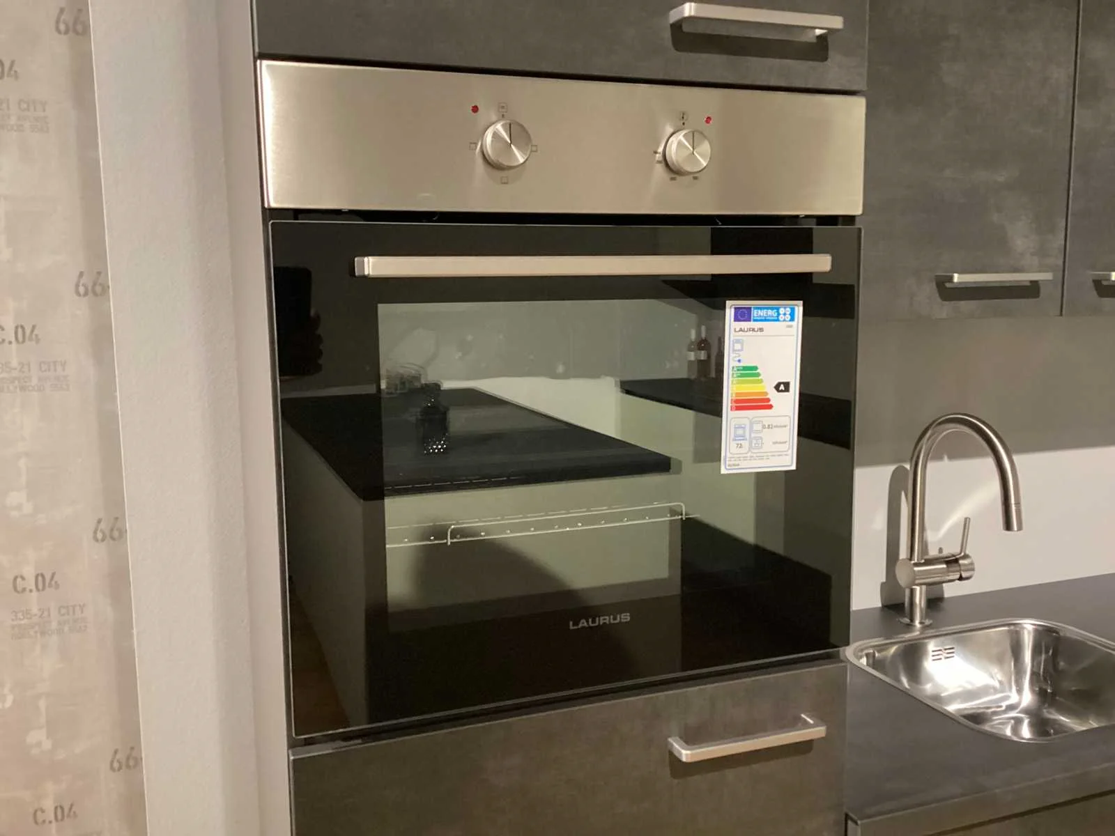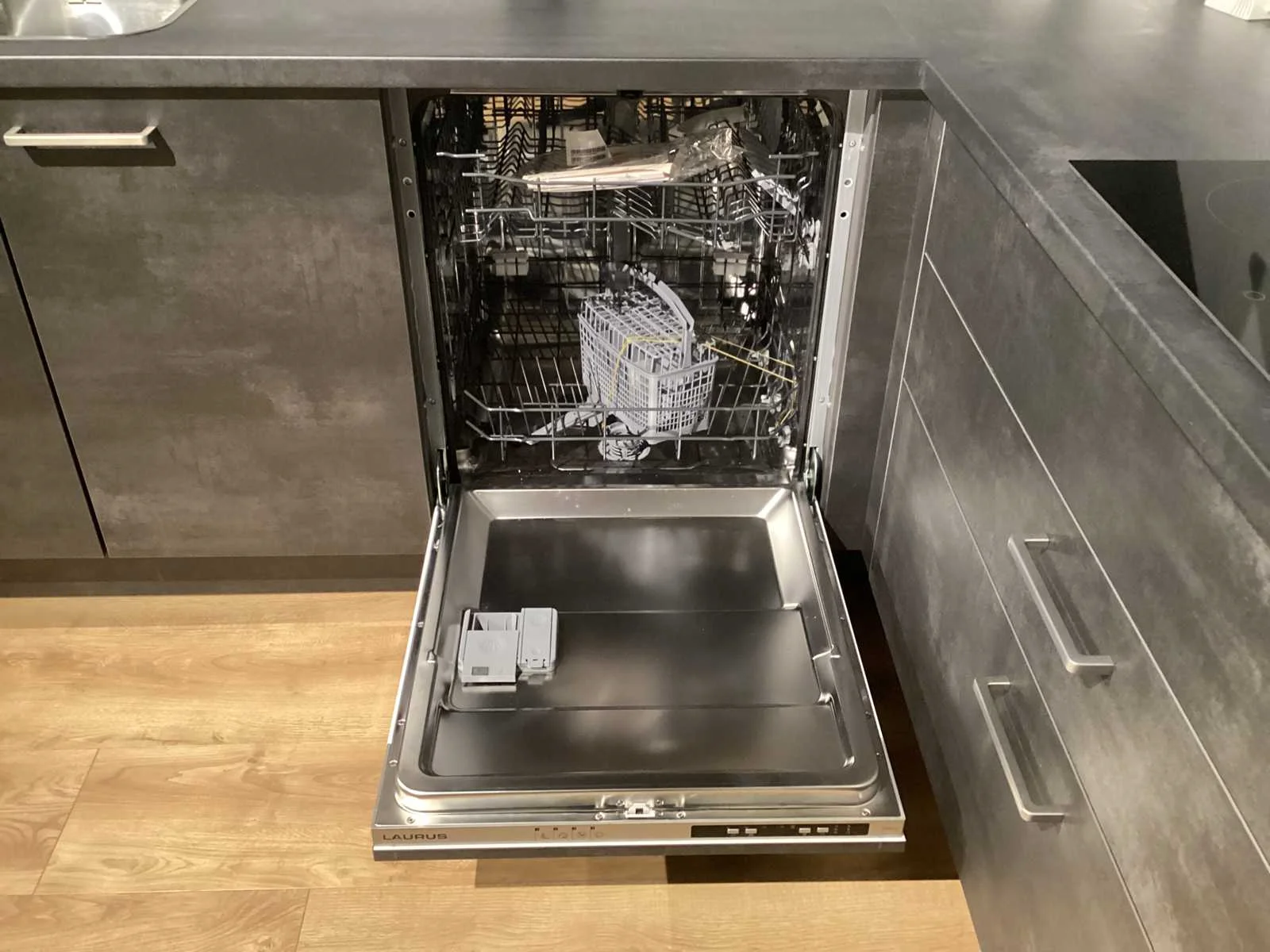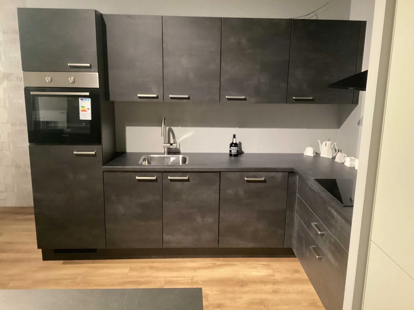 Dit betreft een showroom keuken niet gebruikt. Koper dient dit zelf te demonteren, keuken staat op de eerste verdieping, geen lift aanwezig, wel een vaste trap. Let op! Zonder kraan en accessoires Keramische kookplaat, Laurus LCA600, 60cm, 4 kookzones. Nee Merk: Nobilia Model: Laser decor zwart beton Type keukenopstelling: Hoek keuken Lengte: 285-187cm Breedte: 60cm Hoogte: 217cm Gootsteen: Reginox Colorado opbouw Werkblad hoogte: 91cm Aanrechtblad: HPL 378 decor zwart beton Koelkast: Laurus lks88e koelkast 88cm Softclose: true Oven: Laurus bakoven LEB3 60cm Afzuigkap: Elica missy BL90-D zwart wandschouwkap 90 cm Vaatwasser: Laurus LSV604 volledig geïntegreerd vaatwasser Plintkleur: decor zwart beton Hoofdkleur: decor zwart beton Kleur: decor zwart beton