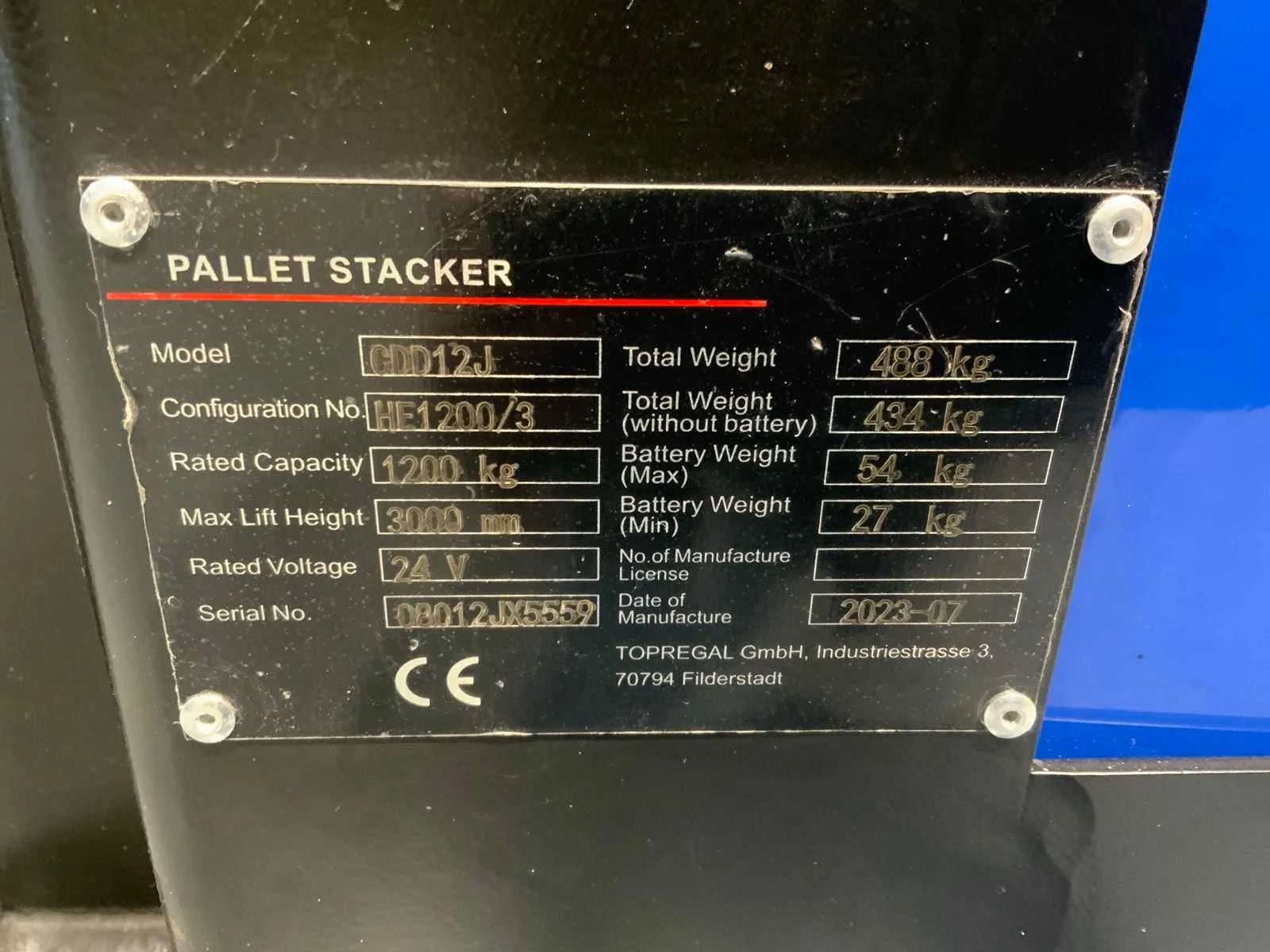 Duplex: ingebouwde lader, accu 2025 Nee Merk: HE1200/3 Type: CDD12J Bouwjaar: 2023 Serienummer: 08012jx5559 Hefvermogen: 1200kg Hefhoogte: 3000mm Lepellengte: 1150mm Afgelezen urenstand: 9 Eigen gewicht: 488kg Minimale doorrijhoogte: 2100mm Totale afmeting L: 1830mm Totale afmeting Breedte: 800mm Totale afmeting Hoogte: 2100mm