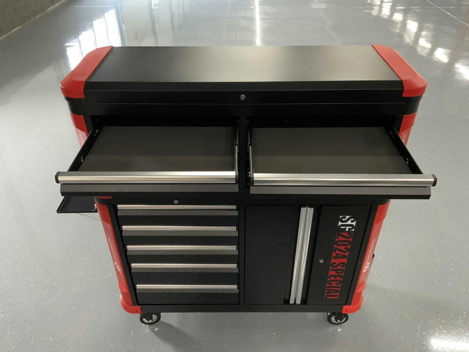 13 Laden, 9 gevuld, 327 pcs gereedschap. Kar met afneembare topbox Top box met 8 laden en boven klep Kar met 5 laden en kast met dubbele openslaande deuren Hoeken schuin afgewerkt met bumpers Stevig kunststof handvaten 2 zwenkwielen waarvan 2 geremd Hoge kwaliteit cilinder sloten Mat zwart afgewerkt met rode accenten Nee Merk: Stahlgruppe Type: XL PRO Deluxe Bouwjaar: 2025 Aantal laden: 13 Met inhoud: true