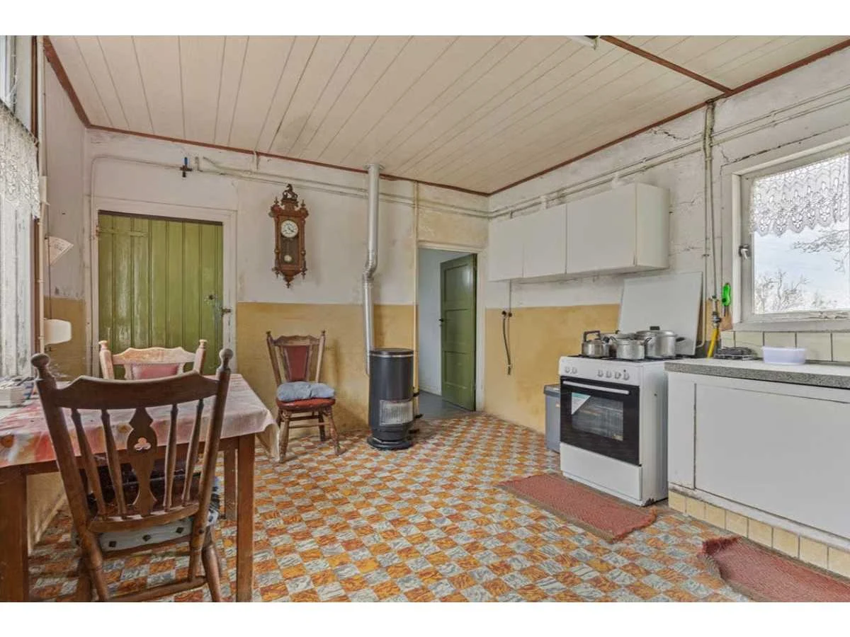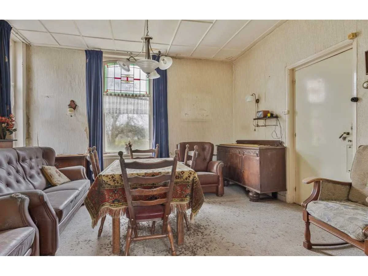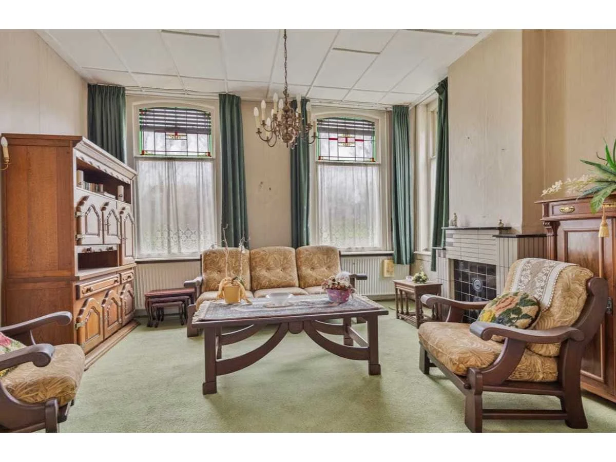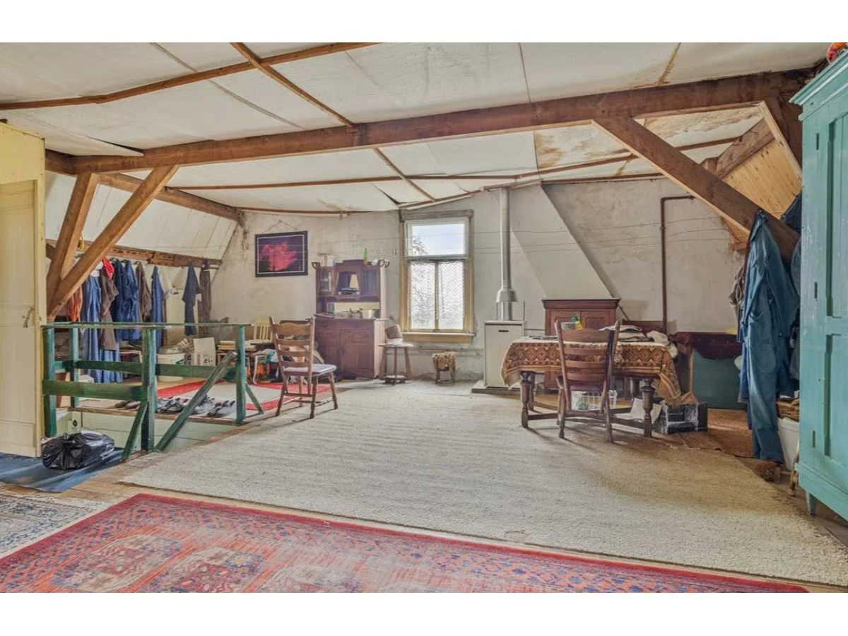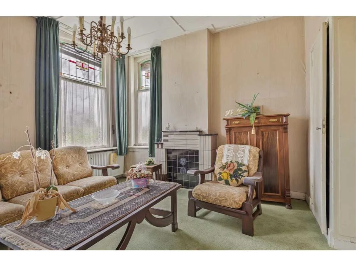 Waar onder: Keukenruimte (kachel, tafel stoelen, keukenapparatuur, pannen, antieke klok); hal (kapstok/kast, hoge stoel, kast, hanglamp); woonkamer (3-zits bank, 2x fauteuils, salontafel, 2x houten kast, bijzettafels, hanglamp); eetkamer (eettafel, stoelen, fauteuil, hanglamp, servieskast met servies); overloop (stoelen, heren en vrouwen kleding, kachel, 5x houten kast met inhoud, tafel, stoelen); 3 slaapkamers (3x bed, kasten, wanddecoratie), Nee