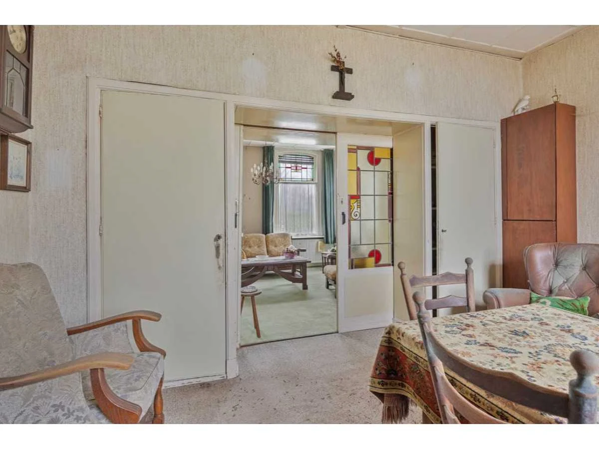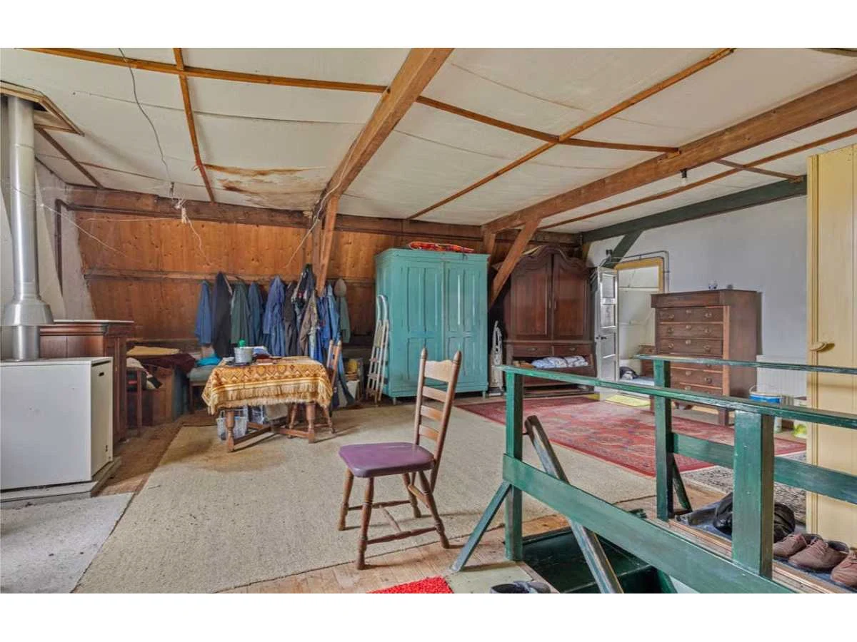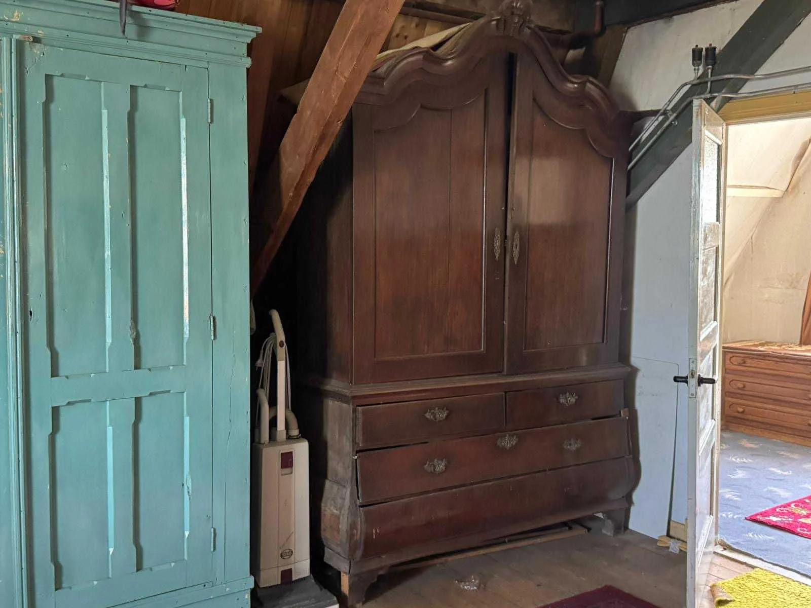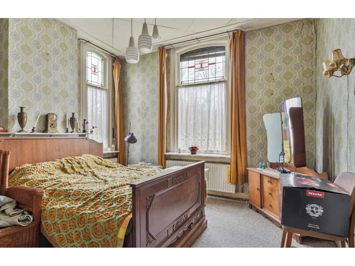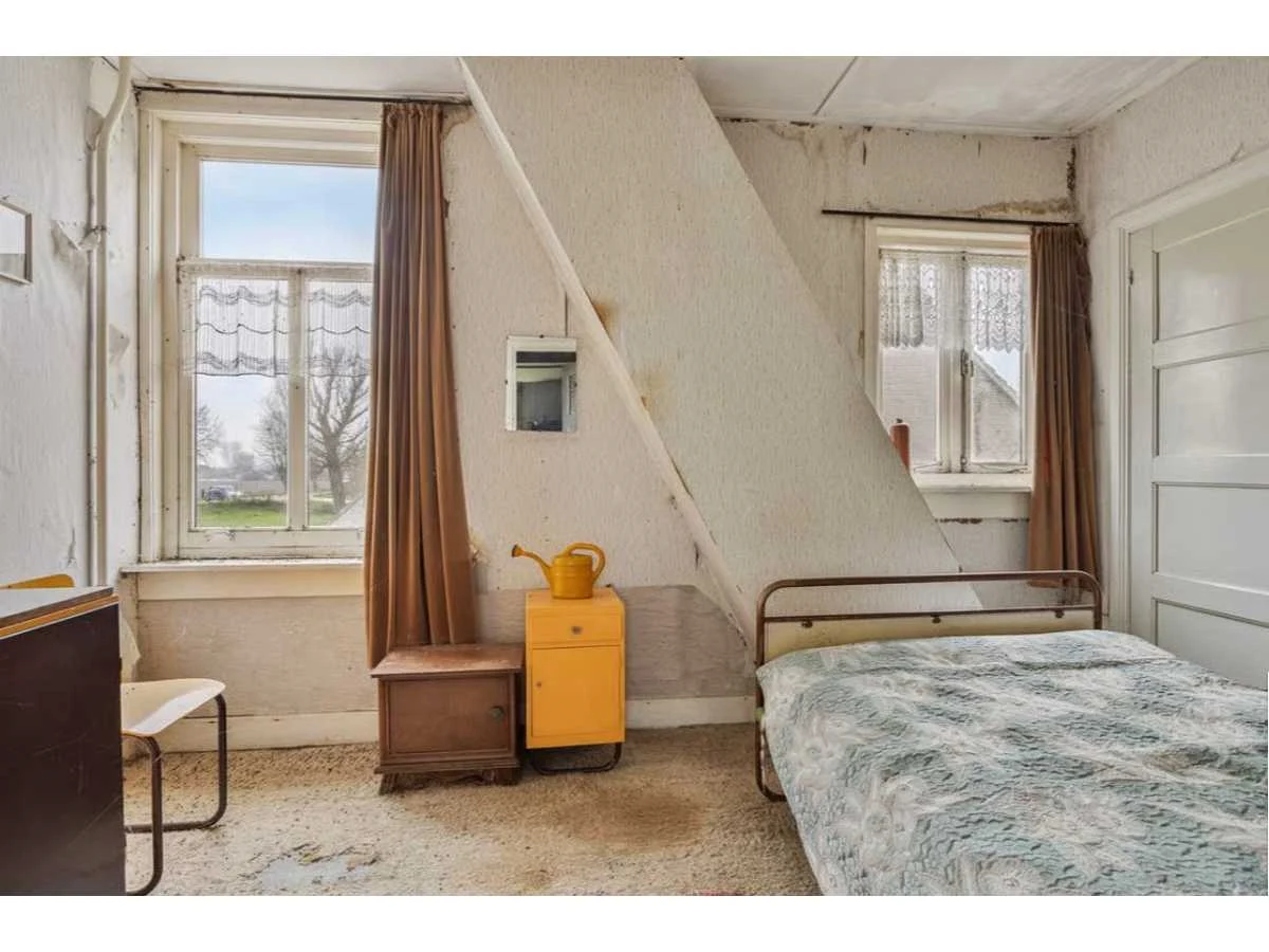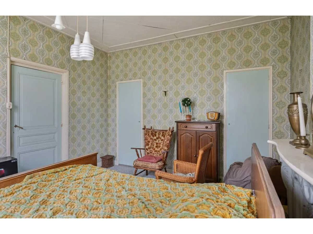 Waar onder: Keukenruimte (kachel, tafel stoelen, keukenapparatuur, pannen, antieke klok); hal (kapstok/kast, hoge stoel, kast, hanglamp); woonkamer (3-zits bank, 2x fauteuils, salontafel, 2x houten kast, bijzettafels, hanglamp); eetkamer (eettafel, stoelen, fauteuil, hanglamp, servieskast met servies); overloop (stoelen, heren en vrouwen kleding, kachel, 5x houten kast met inhoud, tafel, stoelen); 3 slaapkamers (3x bed, kasten, wanddecoratie), Nee