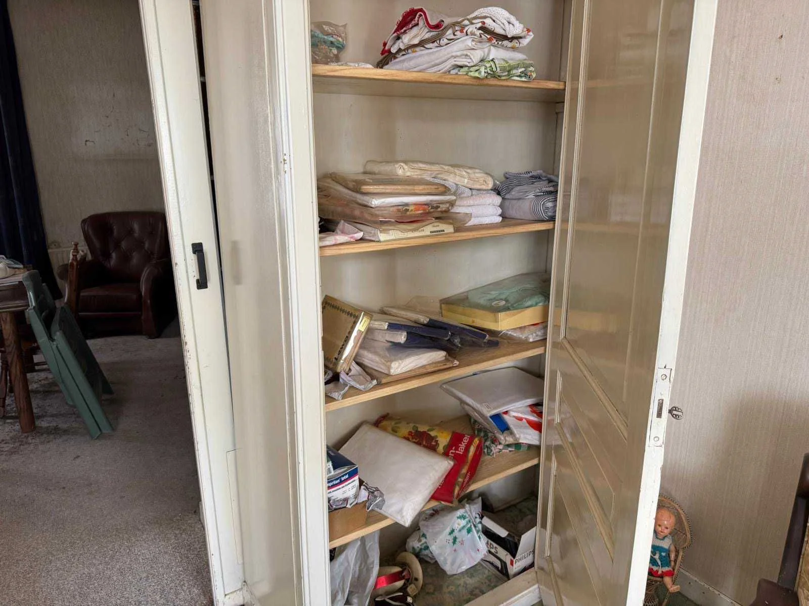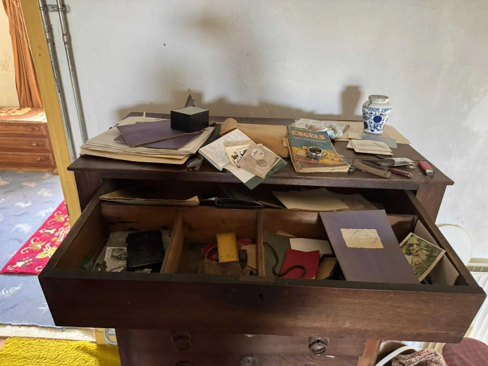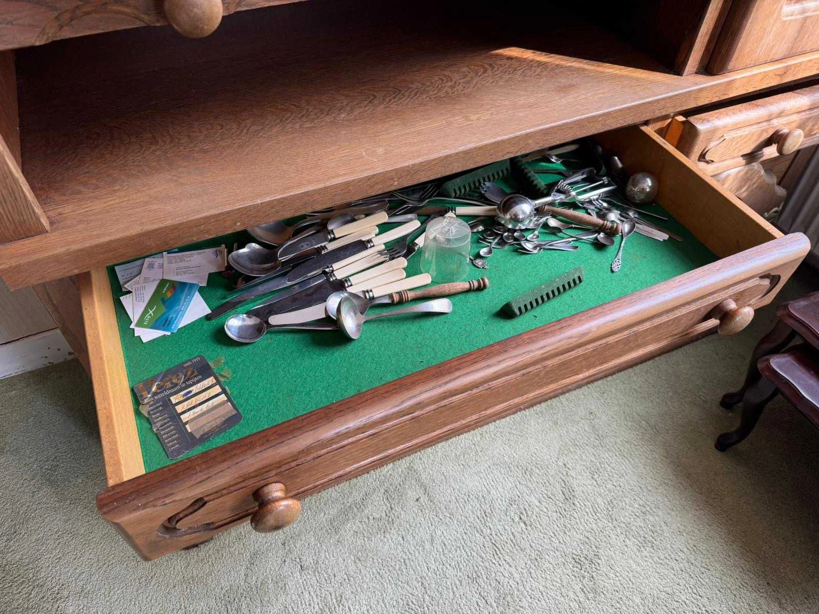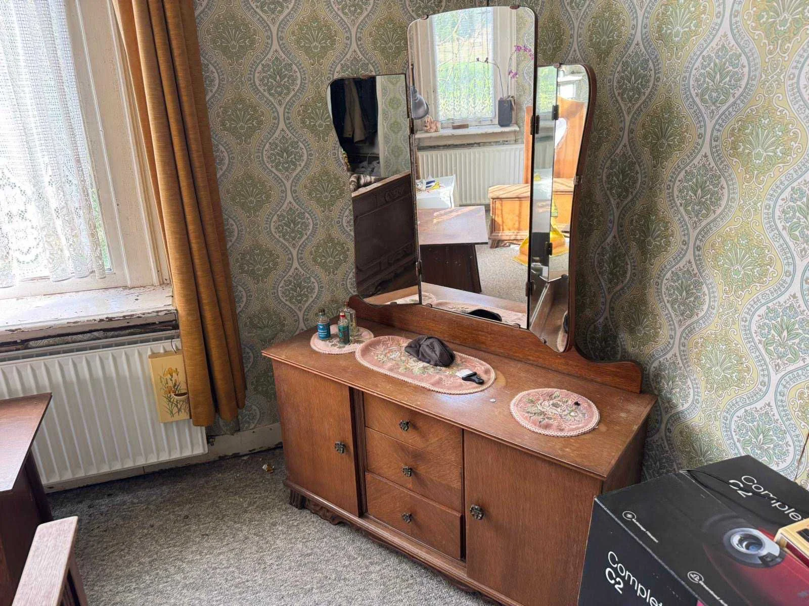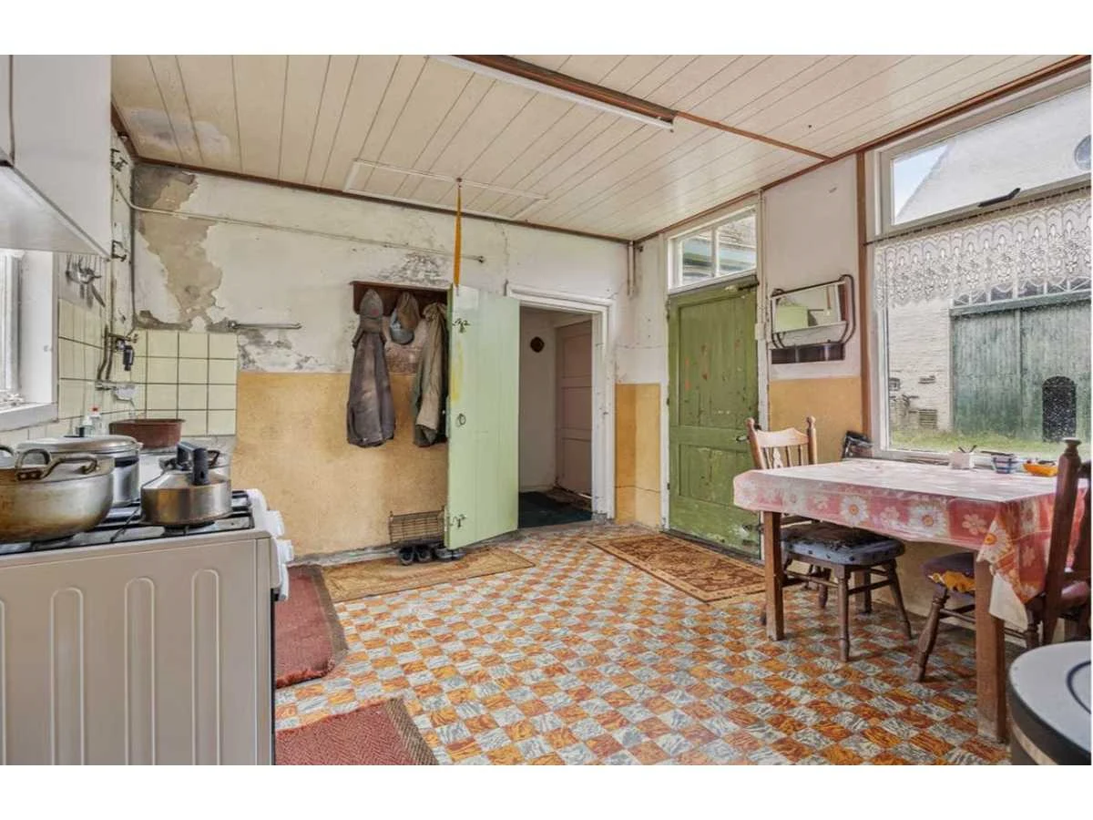 Waar onder: Keukenruimte (kachel, tafel stoelen, keukenapparatuur, pannen, antieke klok); hal (kapstok/kast, hoge stoel, kast, hanglamp); woonkamer (3-zits bank, 2x fauteuils, salontafel, 2x houten kast, bijzettafels, hanglamp); eetkamer (eettafel, stoelen, fauteuil, hanglamp, servieskast met servies); overloop (stoelen, heren en vrouwen kleding, kachel, 5x houten kast met inhoud, tafel, stoelen); 3 slaapkamers (3x bed, kasten, wanddecoratie), Nee