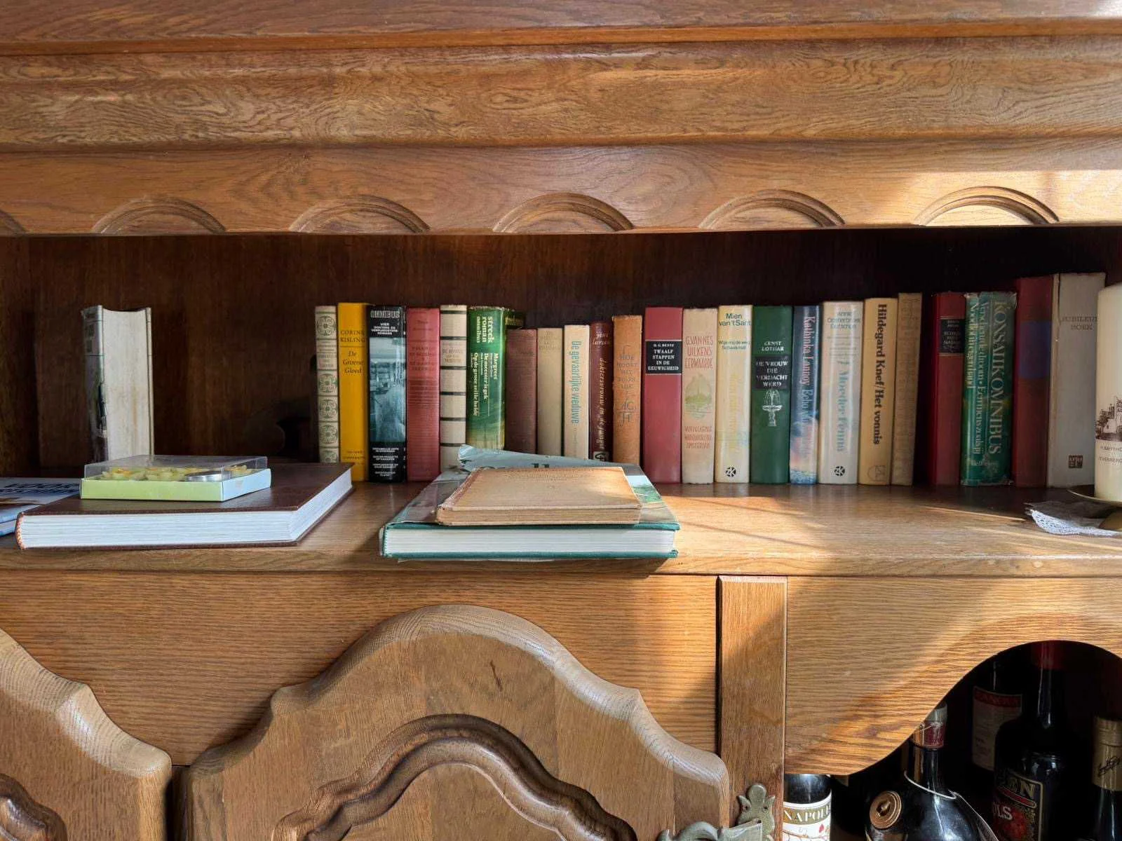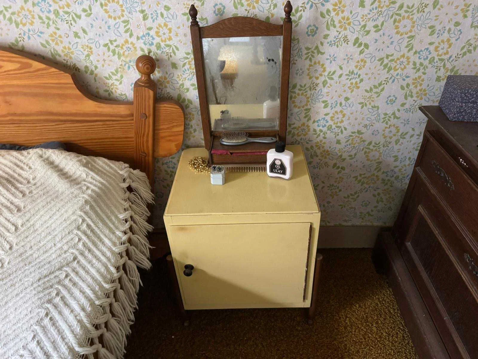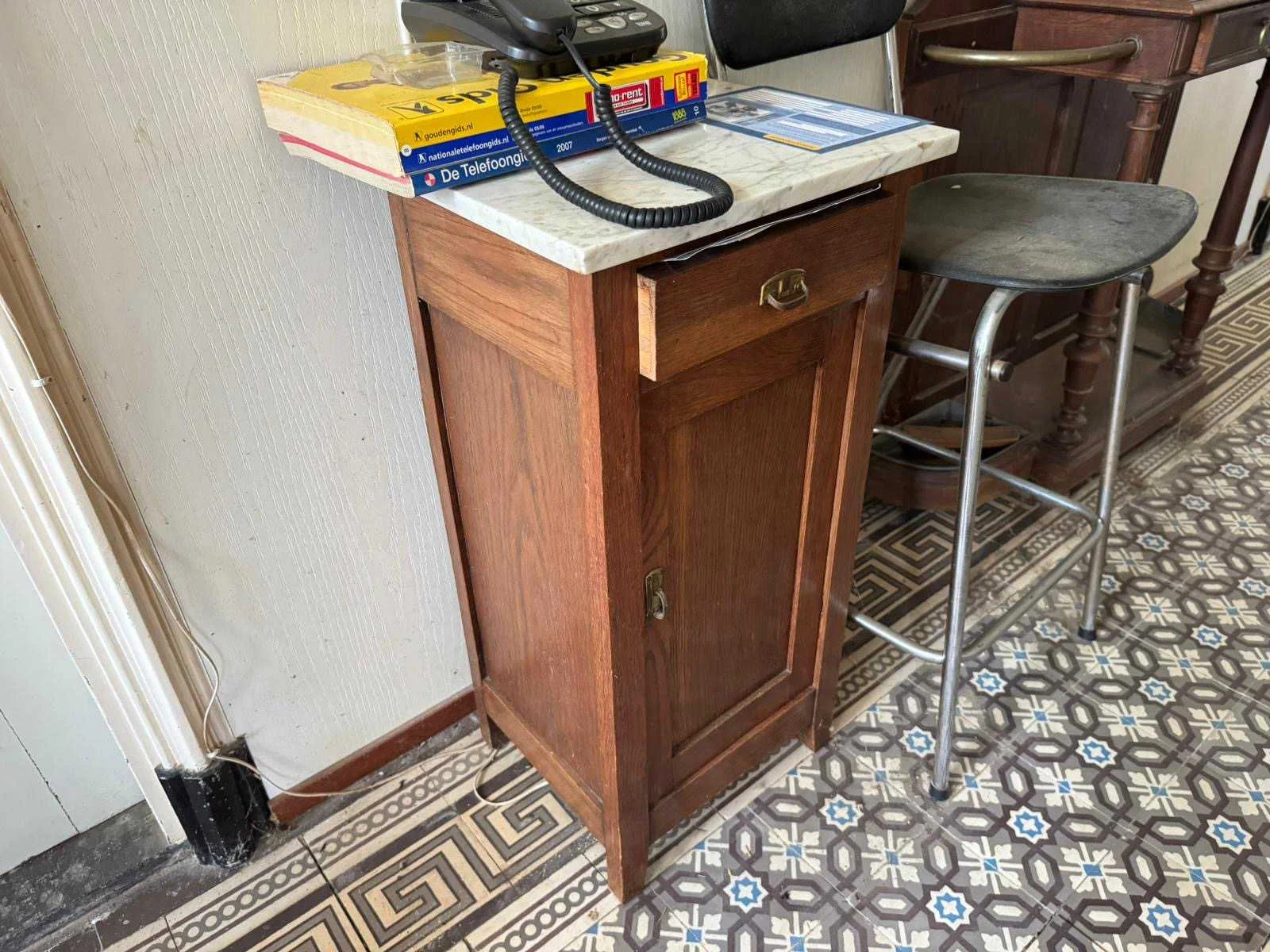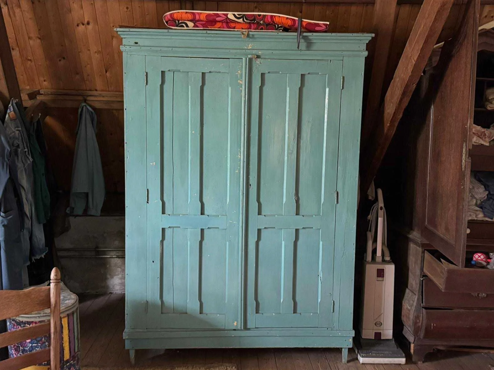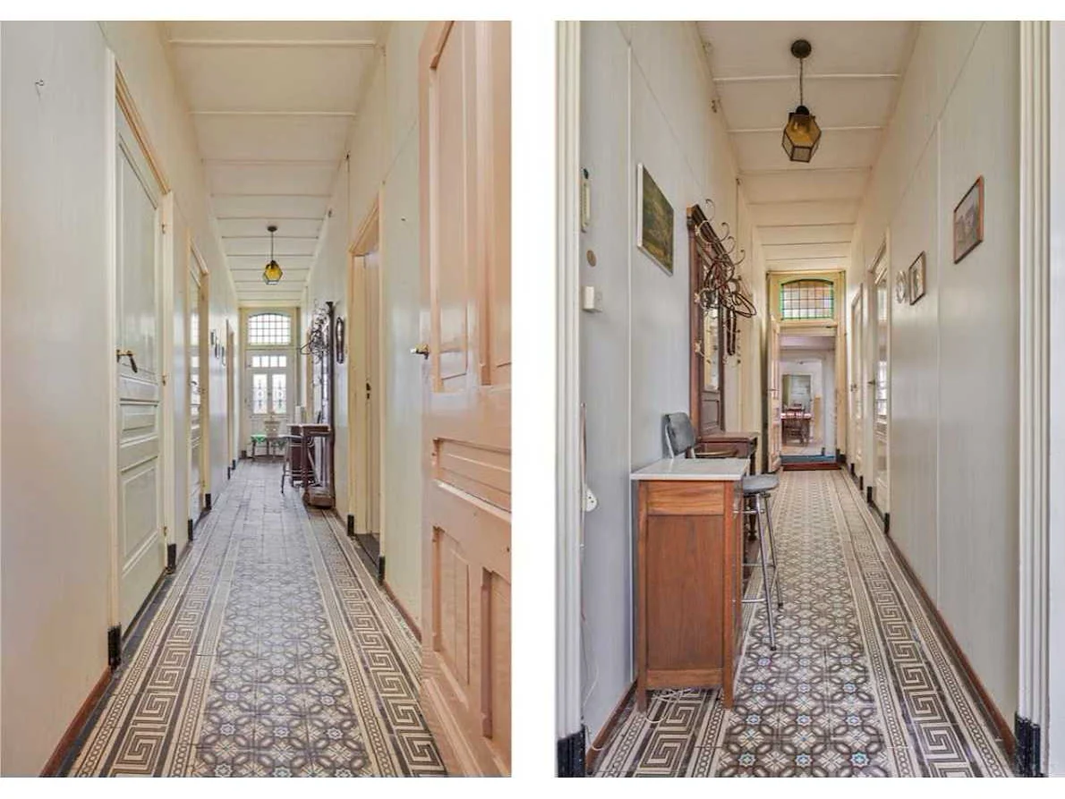 Waar onder: Keukenruimte (kachel, tafel stoelen, keukenapparatuur, pannen, antieke klok); hal (kapstok/kast, hoge stoel, kast, hanglamp); woonkamer (3-zits bank, 2x fauteuils, salontafel, 2x houten kast, bijzettafels, hanglamp); eetkamer (eettafel, stoelen, fauteuil, hanglamp, servieskast met servies); overloop (stoelen, heren en vrouwen kleding, kachel, 5x houten kast met inhoud, tafel, stoelen); 3 slaapkamers (3x bed, kasten, wanddecoratie), Nee