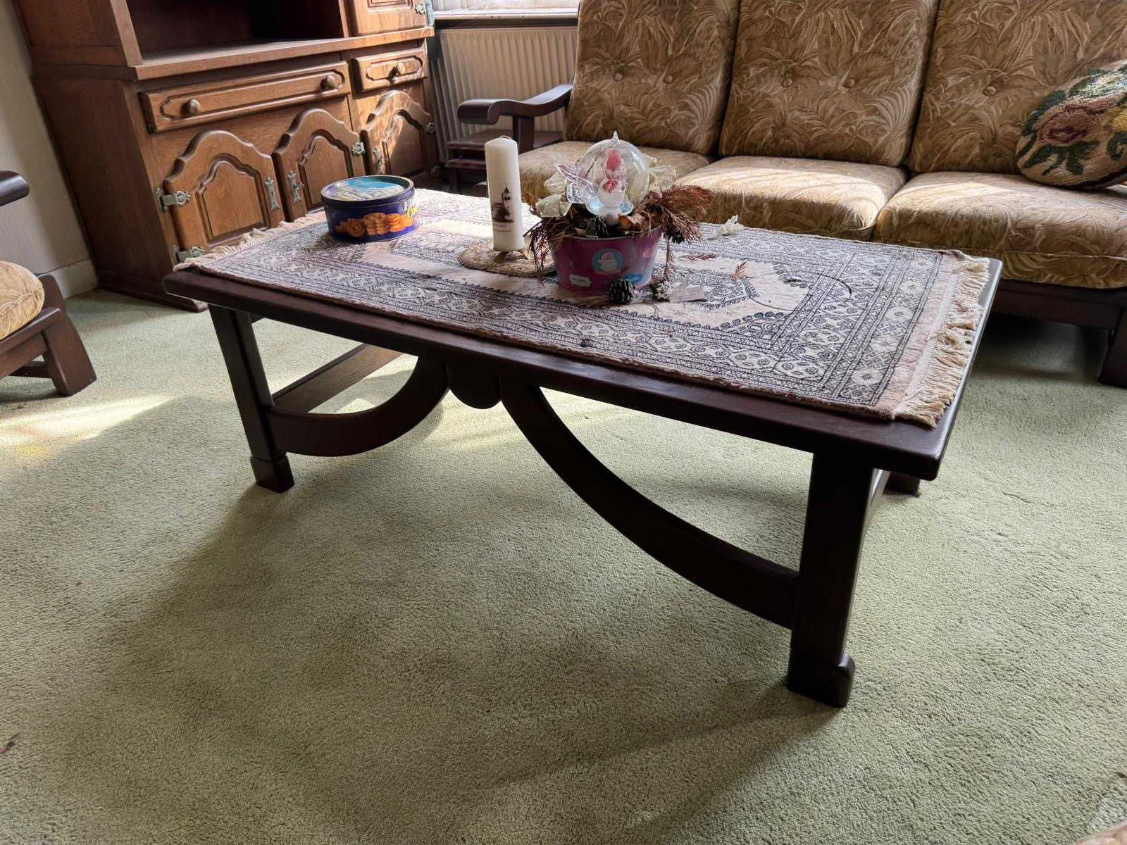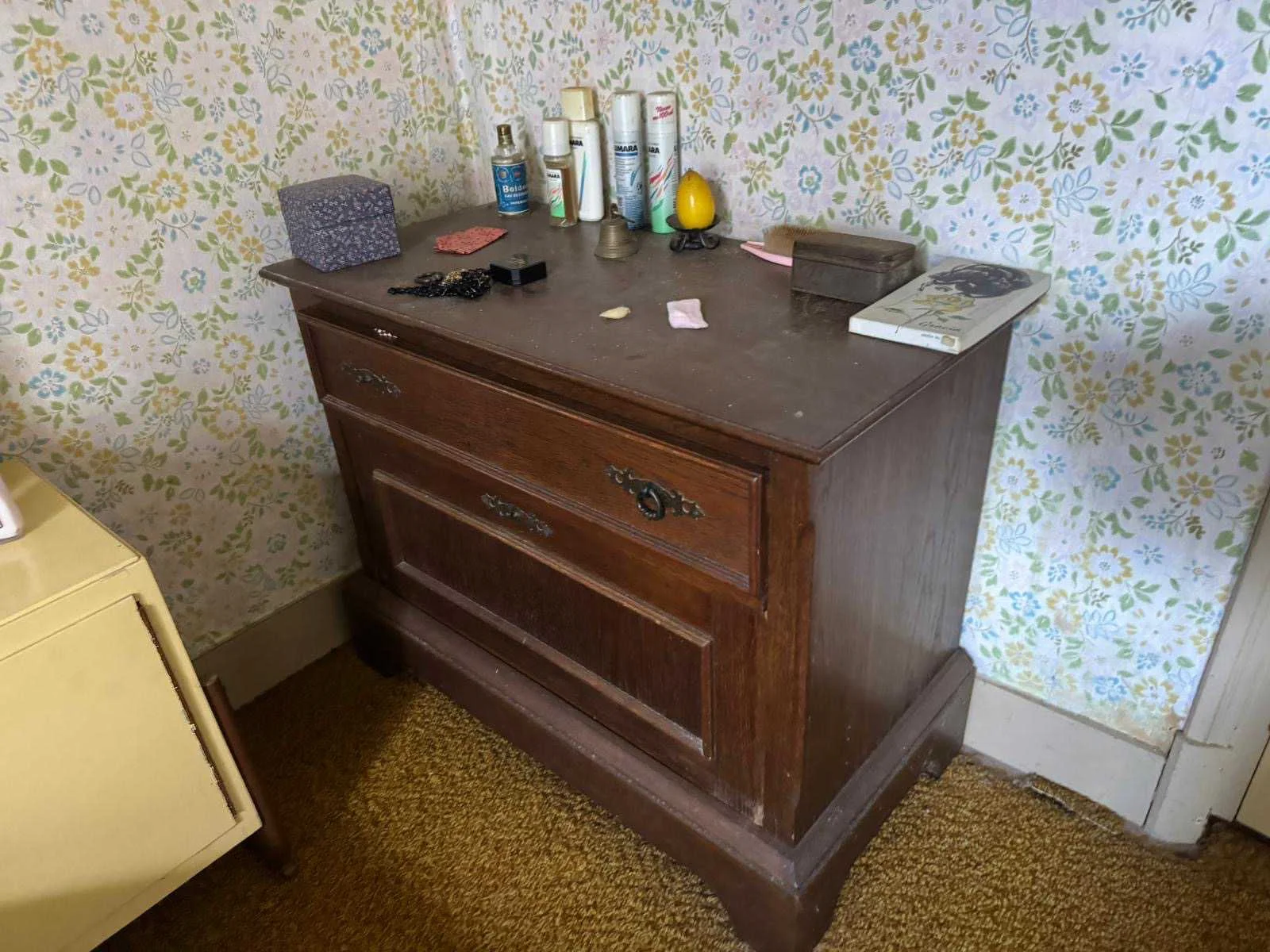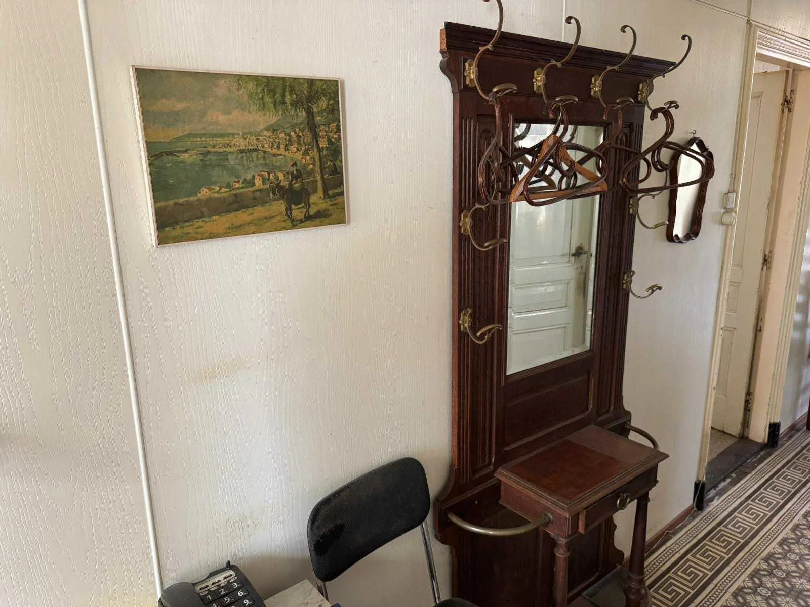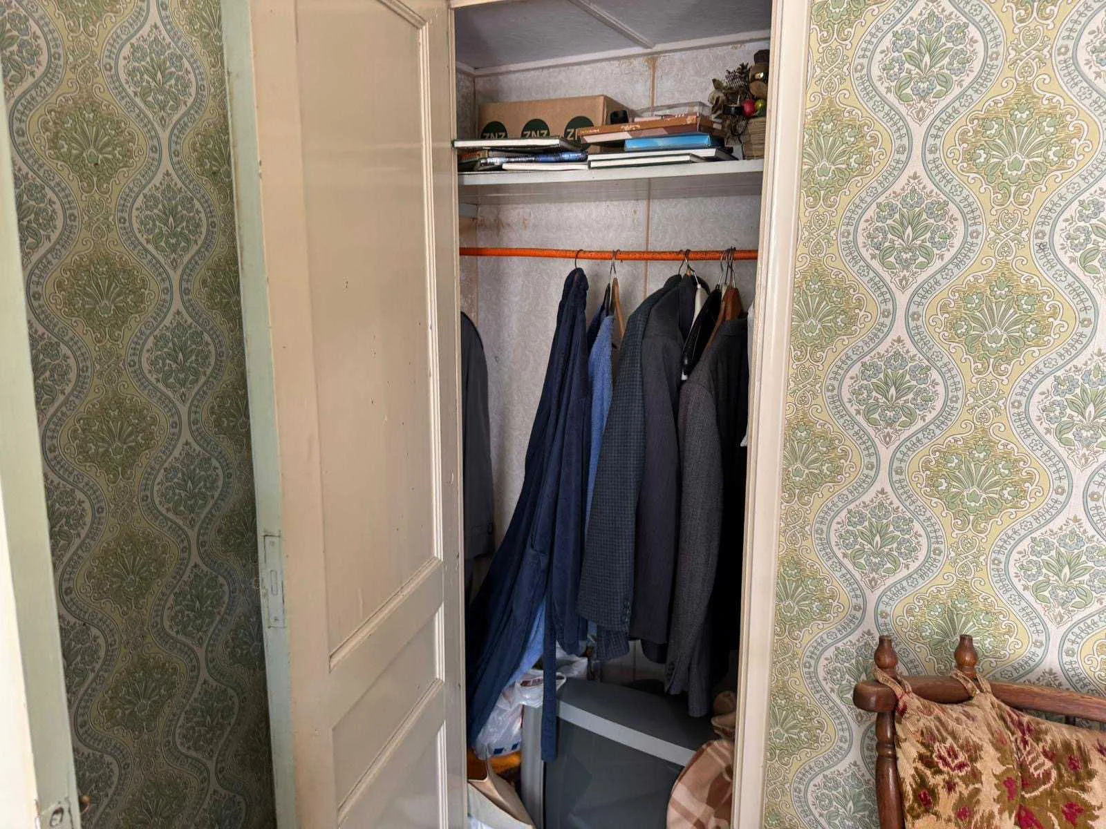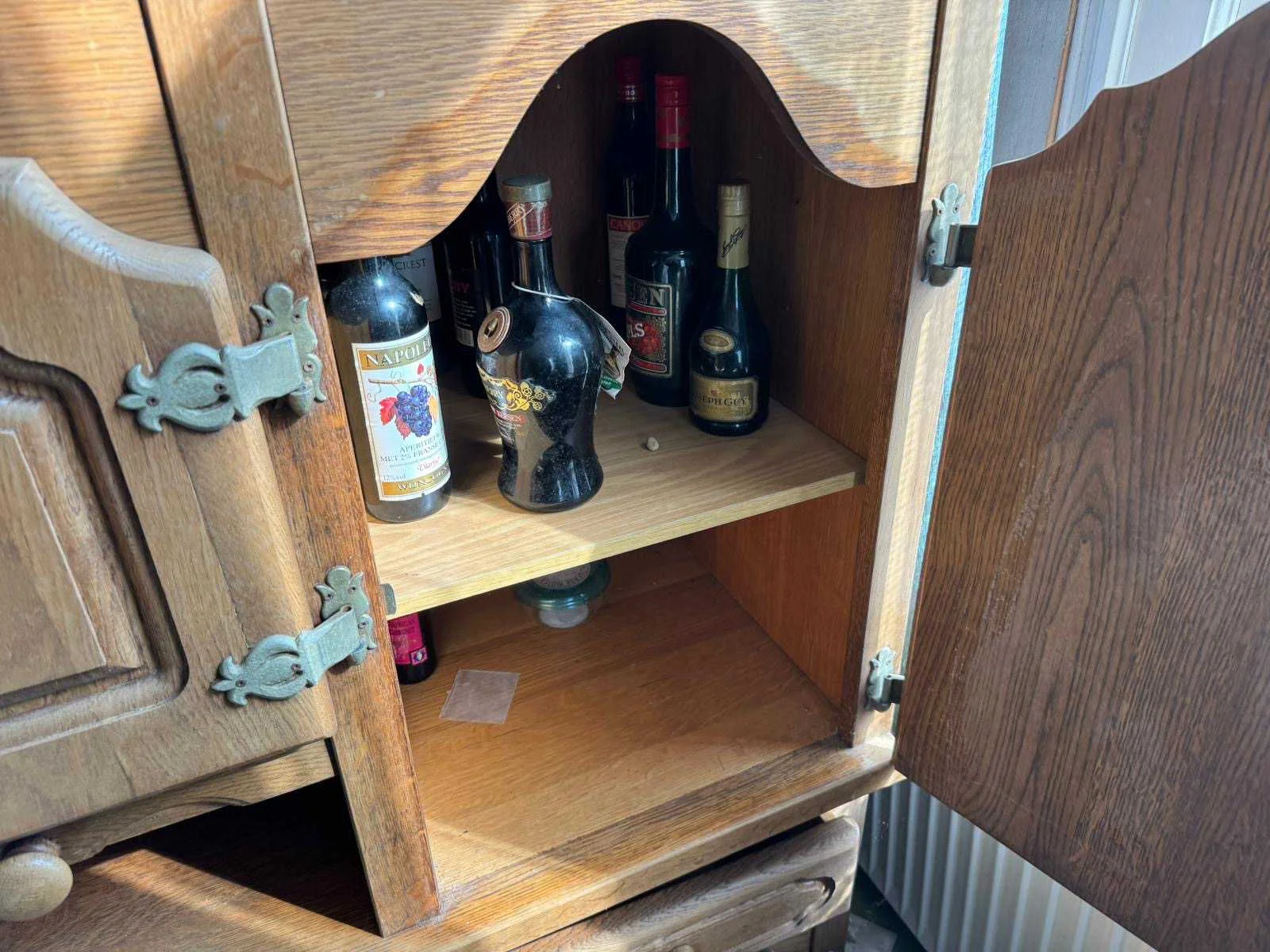 Waar onder: Keukenruimte (kachel, tafel stoelen, keukenapparatuur, pannen, antieke klok); hal (kapstok/kast, hoge stoel, kast, hanglamp); woonkamer (3-zits bank, 2x fauteuils, salontafel, 2x houten kast, bijzettafels, hanglamp); eetkamer (eettafel, stoelen, fauteuil, hanglamp, servieskast met servies); overloop (stoelen, heren en vrouwen kleding, kachel, 5x houten kast met inhoud, tafel, stoelen); 3 slaapkamers (3x bed, kasten, wanddecoratie), Nee