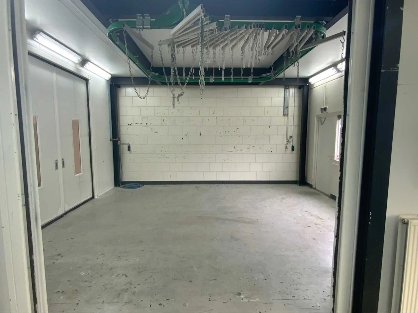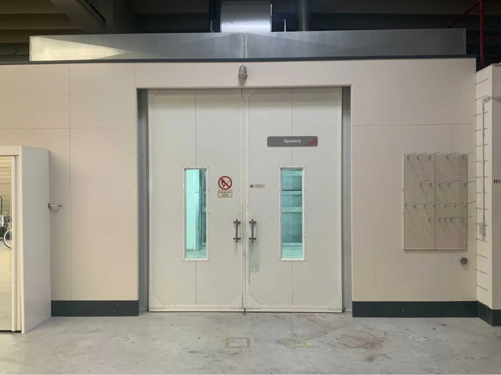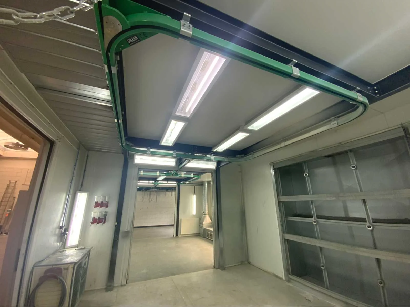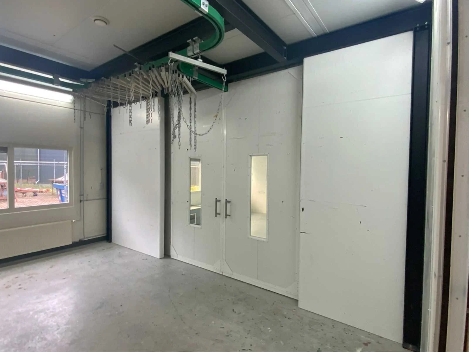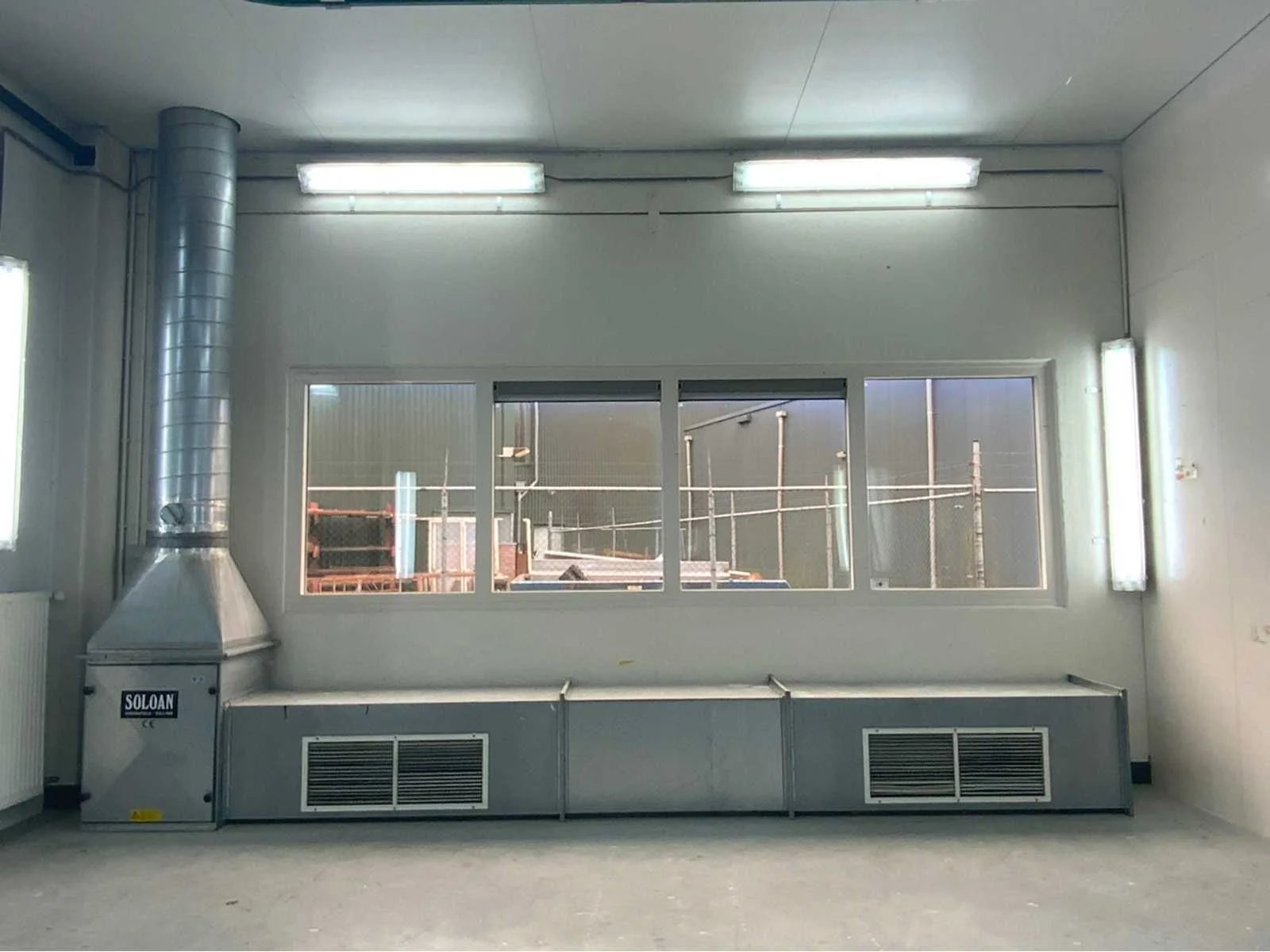Prefab spuitruimte met 2 droogruimtes gekoppeld. Bestaande uit staal constructie met plaatstaal panelen (50mm gevuld met steenwol). Voorwanden en tussenwanden voorzien van schuifdeuren (247x296cm) Achterwand en zijwanden zijn bouwkunding en blijven achter. Soloan 1032 Afzuigwand 300x314cm, 110Kw luchttoevoer/verwarmingsunit gasgestookt, dampafzuiging in middelste droogruimte, afzonderlijke Soloan DDE dampafzuiging ten behoeve van verfaanmaakruimte, Ruimte is voorzien van Soloan S7 railsysteem met 35 kozijnbalkwagens (maximale last 250kg per rol). Overal ruim voldoende verlichting (IP54 beschermd). Alle aan- en afvoer kanalen horen bij het kavel behalve de dakdoorvoeren. Voorzien van bedieningspaneel TR-SD, voorfilter/kleppensectie type K600 (benodigd voor watergedragen spuiten) voorzien van Soloan S4000 Dampafzuiginstallatie. Spuituren: 619 uur. Nee Merk: Soloan Bouwjaar: 2004 Binnen afmeting l: 18000cm Afzuiginstallatie: true Aansluiting: 400V Afmeting l: 18000mm Afmeting b: 6000mm Afmeting h: 3100mm