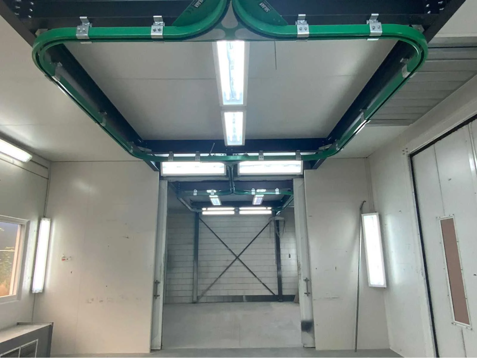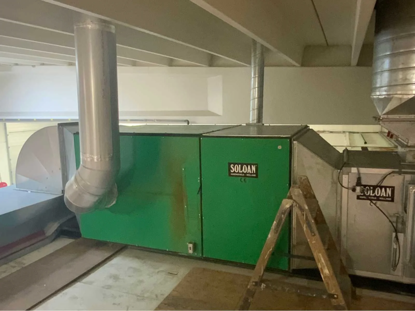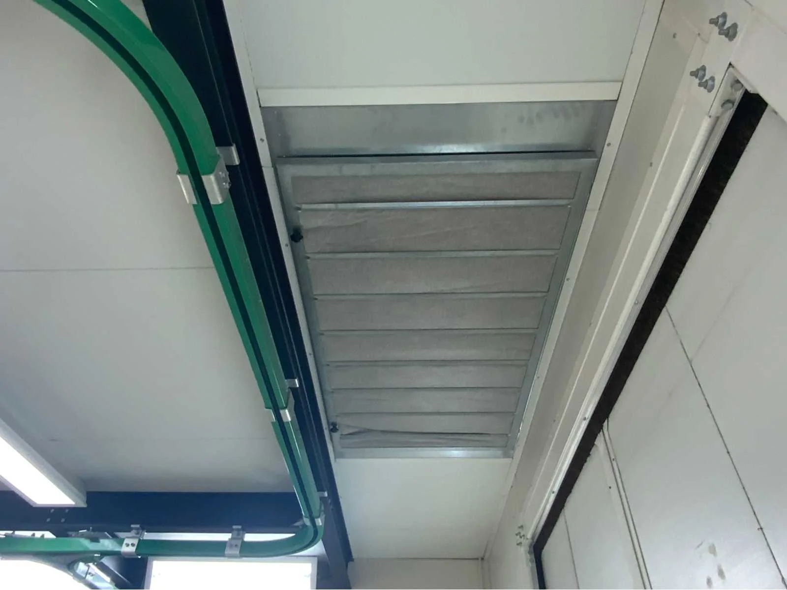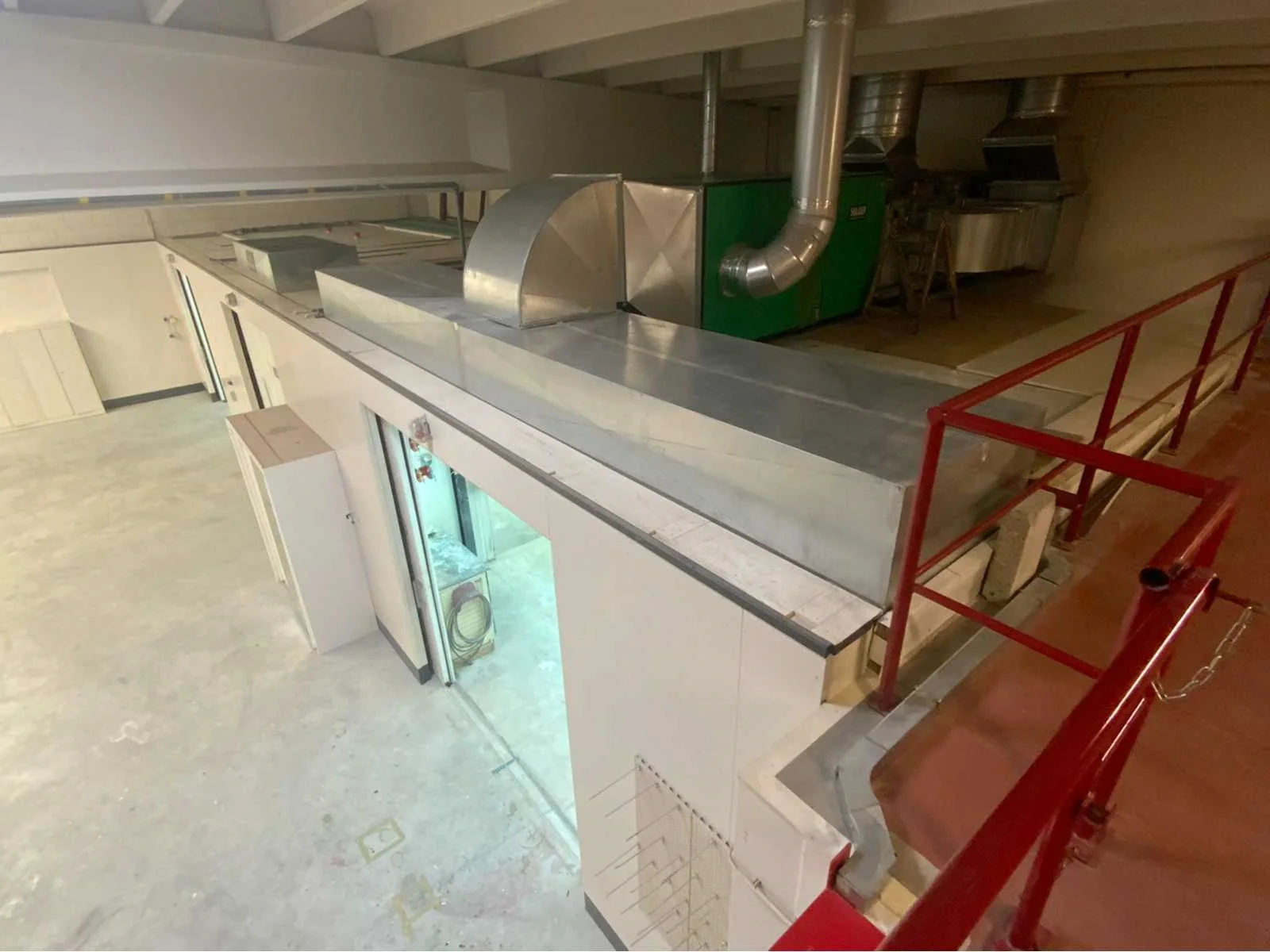 Prefab spuitruimte met 2 droogruimtes gekoppeld. Bestaande uit staal constructie met plaatstaal panelen (50mm gevuld met steenwol). Voorwanden en tussenwanden voorzien van schuifdeuren (247x296cm) Achterwand en zijwanden zijn bouwkunding en blijven achter. Soloan 1032 Afzuigwand 300x314cm, 110Kw luchttoevoer/verwarmingsunit gasgestookt, dampafzuiging in middelste droogruimte, afzonderlijke Soloan DDE dampafzuiging ten behoeve van verfaanmaakruimte, Ruimte is voorzien van Soloan S7 railsysteem met 35 kozijnbalkwagens (maximale last 250kg per rol). Overal ruim voldoende verlichting (IP54 beschermd). Alle aan- en afvoer kanalen horen bij het kavel behalve de dakdoorvoeren. Voorzien van bedieningspaneel TR-SD, voorfilter/kleppensectie type K600 (benodigd voor watergedragen spuiten) voorzien van Soloan S4000 Dampafzuiginstallatie. Spuituren: 619 uur. Nee Merk: Soloan Bouwjaar: 2004 Binnen afmeting l: 18000cm Afzuiginstallatie: true Aansluiting: 400V Afmeting l: 18000mm Afmeting b: 6000mm Afmeting h: 3100mm