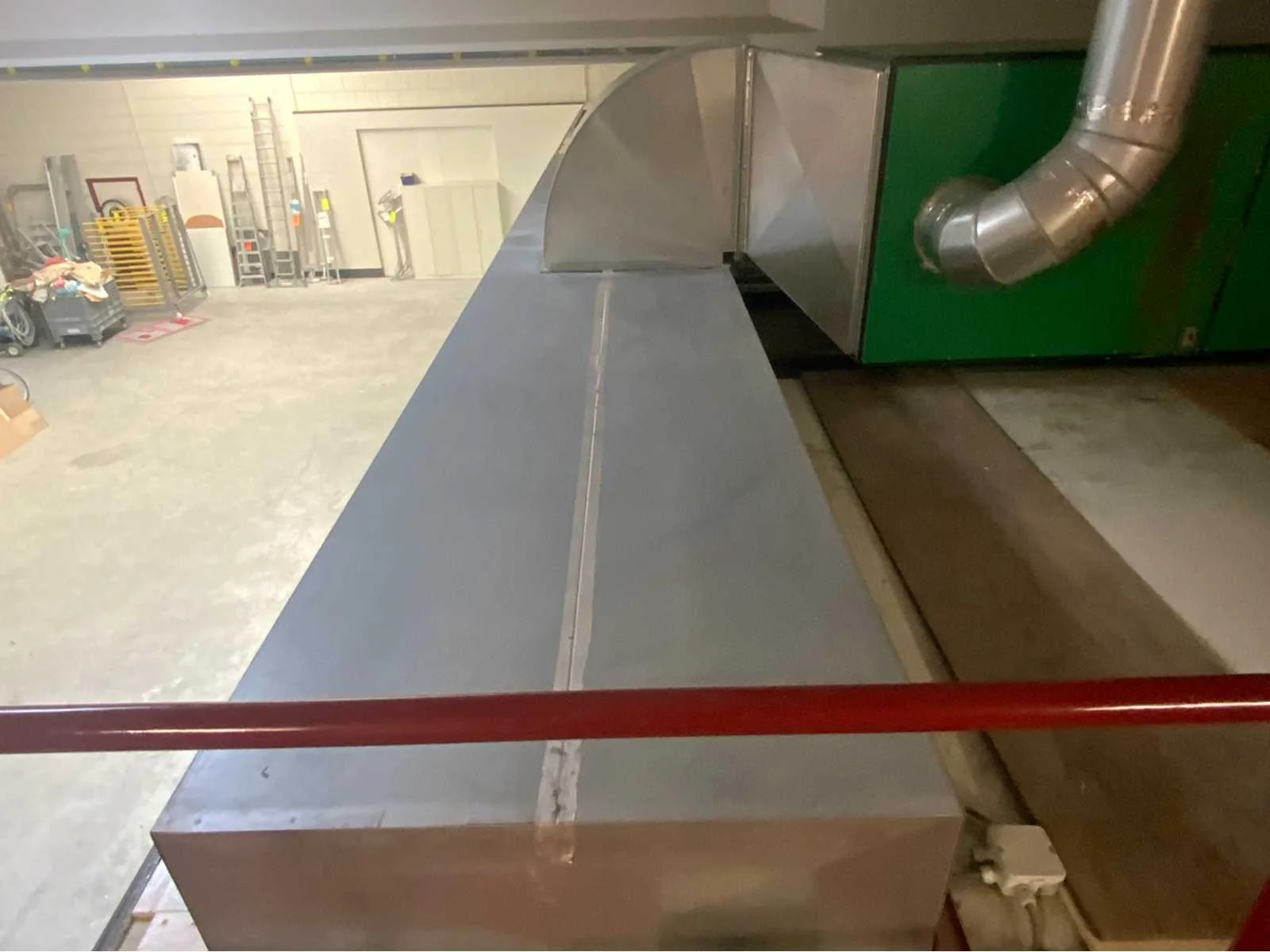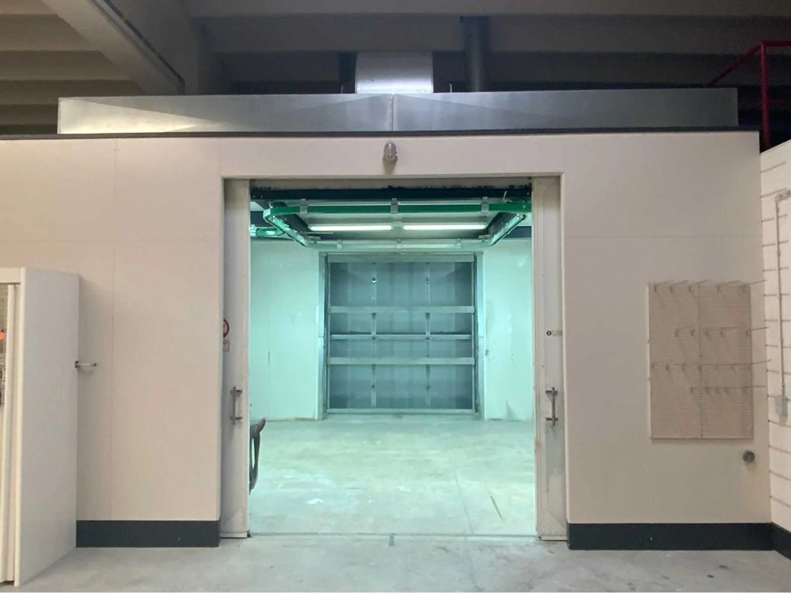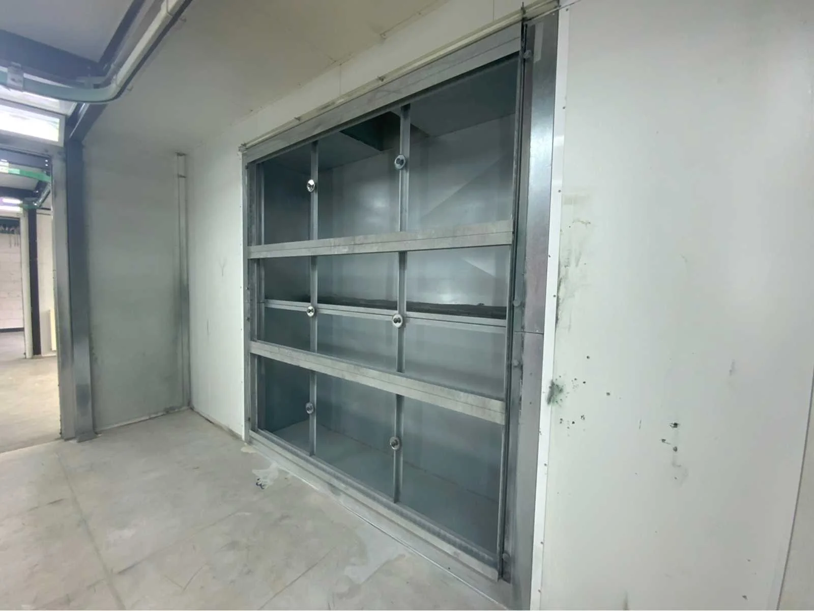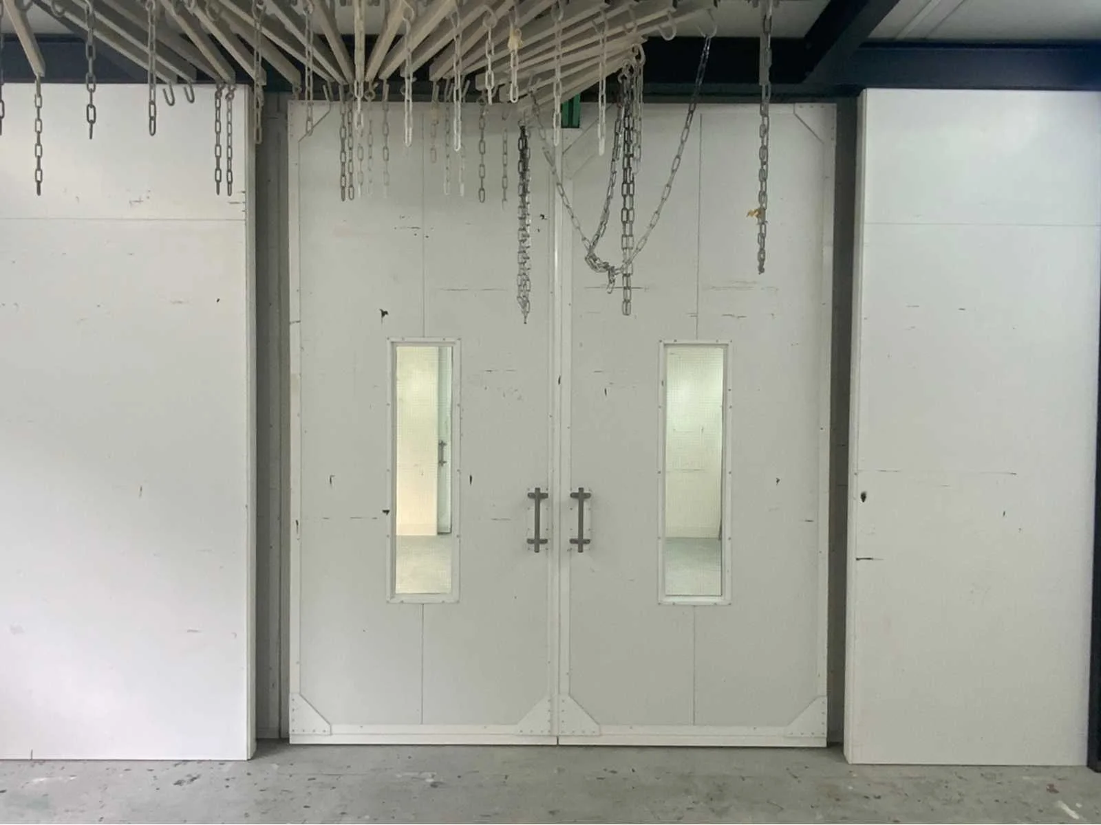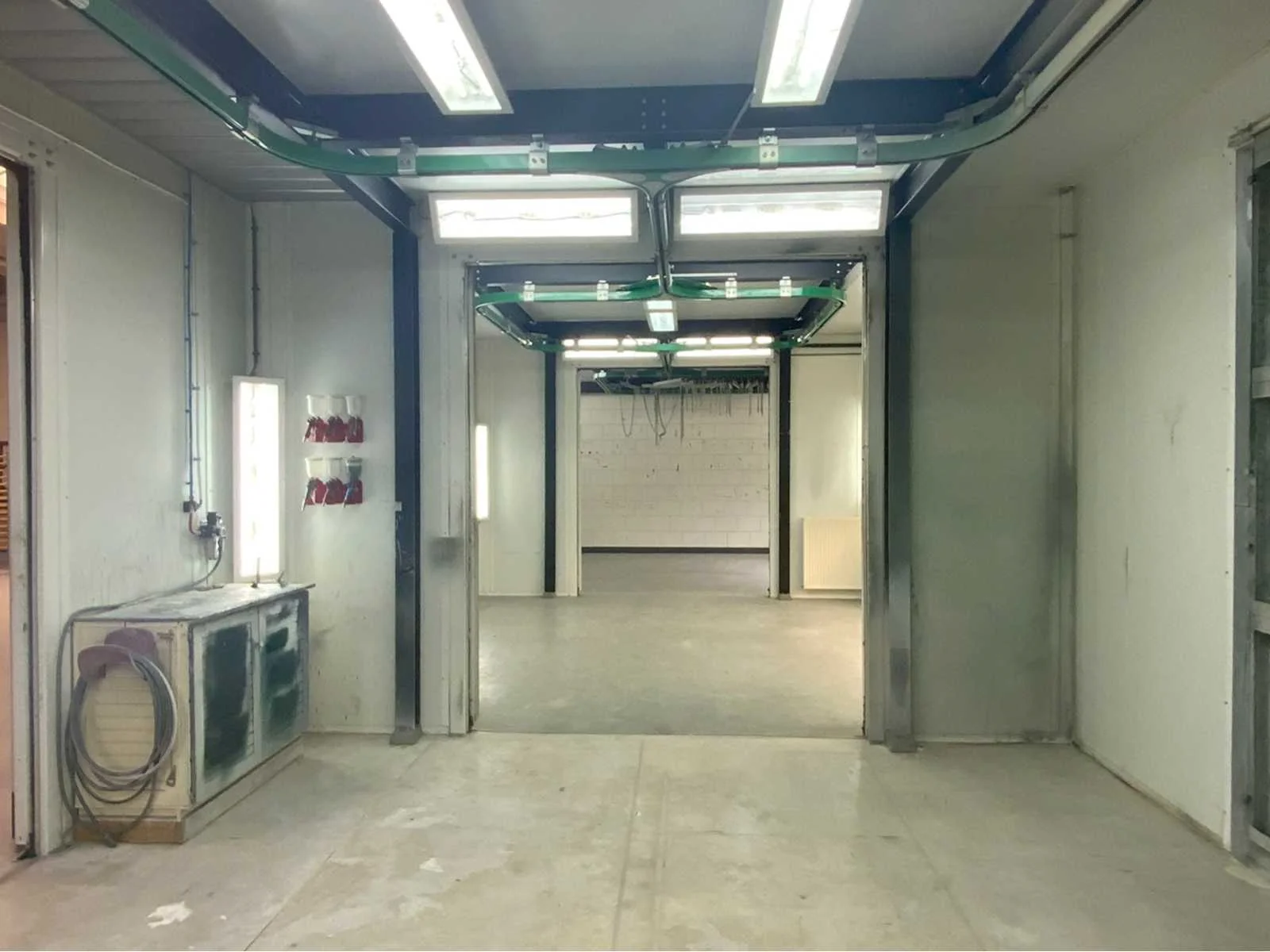 Prefab spuitruimte met 2 droogruimtes gekoppeld. Bestaande uit staal constructie met plaatstaal panelen (50mm gevuld met steenwol). Voorwanden en tussenwanden voorzien van schuifdeuren (247x296cm) Achterwand en zijwanden zijn bouwkunding en blijven achter. Soloan 1032 Afzuigwand 300x314cm, 110Kw luchttoevoer/verwarmingsunit gasgestookt, dampafzuiging in middelste droogruimte, afzonderlijke Soloan DDE dampafzuiging ten behoeve van verfaanmaakruimte, Ruimte is voorzien van Soloan S7 railsysteem met 35 kozijnbalkwagens (maximale last 250kg per rol). Overal ruim voldoende verlichting (IP54 beschermd). Alle aan- en afvoer kanalen horen bij het kavel behalve de dakdoorvoeren. Voorzien van bedieningspaneel TR-SD, voorfilter/kleppensectie type K600 (benodigd voor watergedragen spuiten) voorzien van Soloan S4000 Dampafzuiginstallatie. Spuituren: 619 uur. Nee Merk: Soloan Bouwjaar: 2004 Binnen afmeting l: 18000cm Afzuiginstallatie: true Aansluiting: 400V Afmeting l: 18000mm Afmeting b: 6000mm Afmeting h: 3100mm