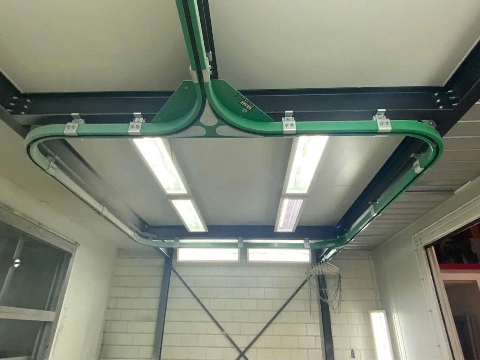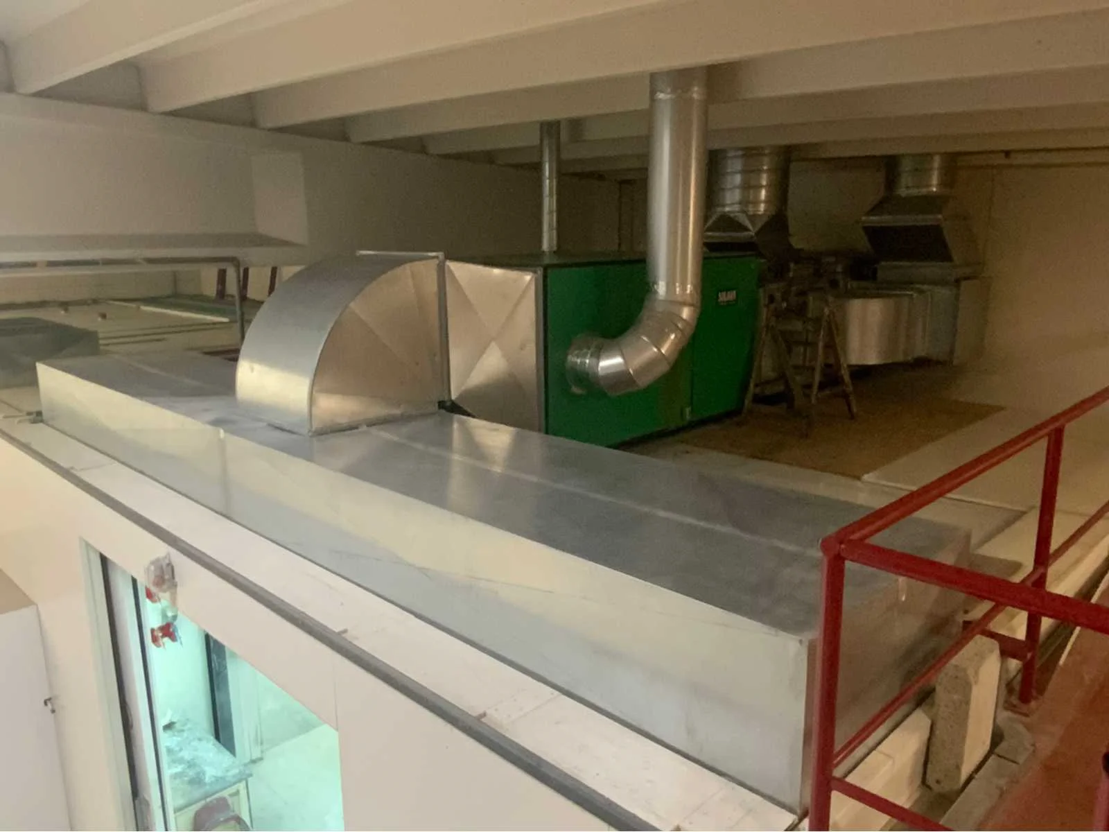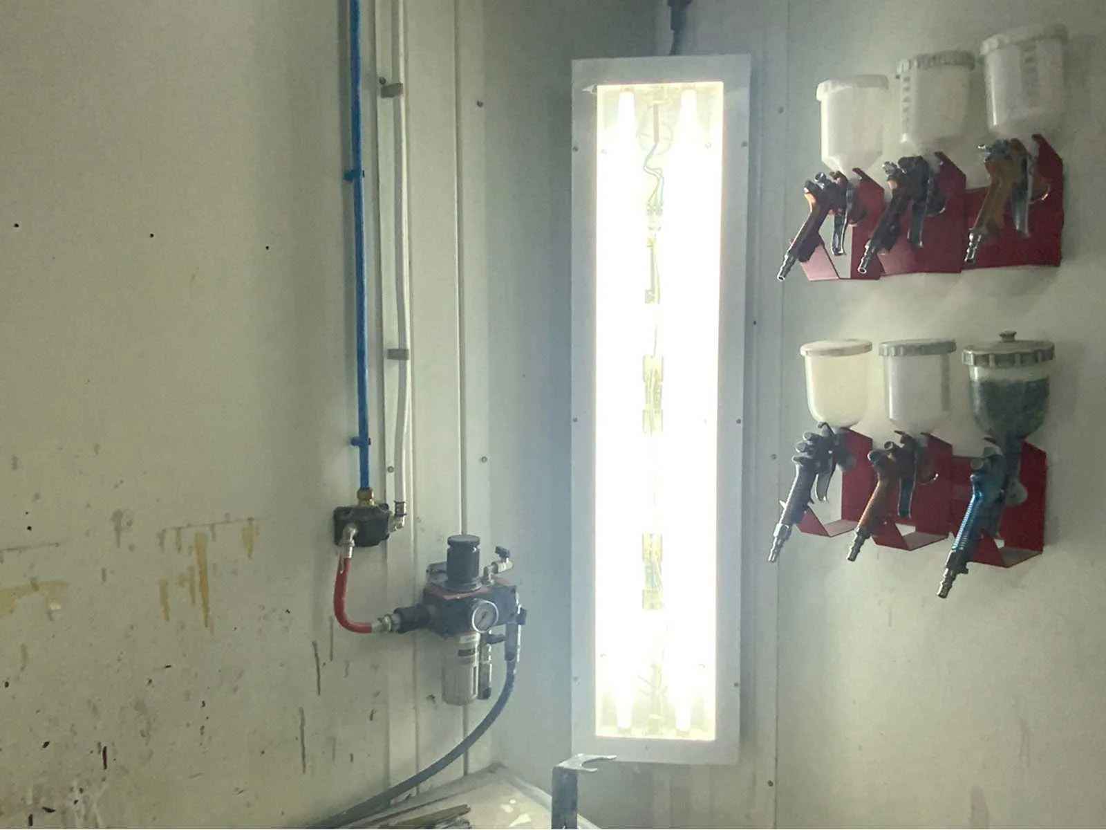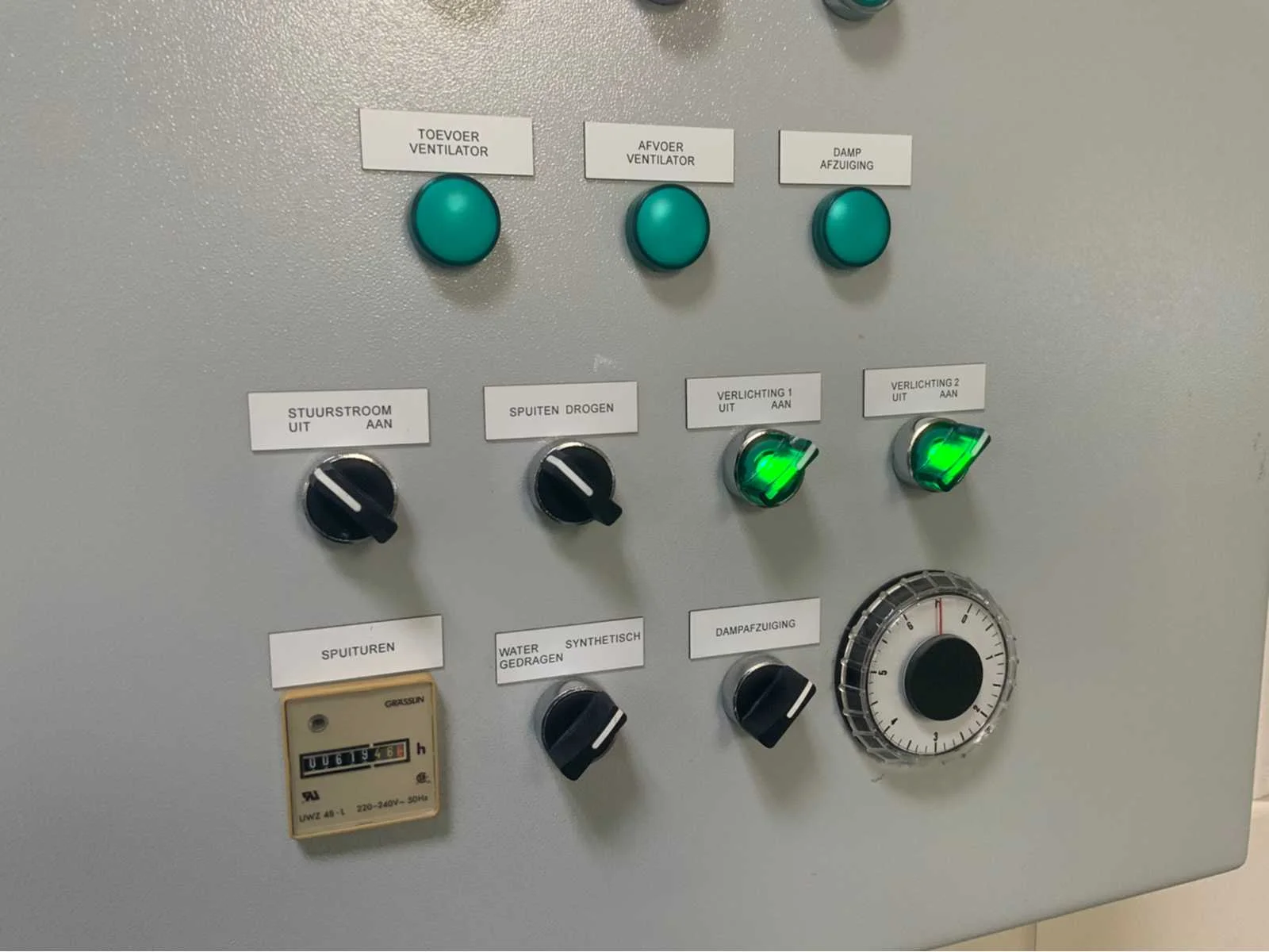 Prefab spuitruimte met 2 droogruimtes gekoppeld. Bestaande uit staal constructie met plaatstaal panelen (50mm gevuld met steenwol). Voorwanden en tussenwanden voorzien van schuifdeuren (247x296cm) Achterwand en zijwanden zijn bouwkunding en blijven achter. Soloan 1032 Afzuigwand 300x314cm, 110Kw luchttoevoer/verwarmingsunit gasgestookt, dampafzuiging in middelste droogruimte, afzonderlijke Soloan DDE dampafzuiging ten behoeve van verfaanmaakruimte, Ruimte is voorzien van Soloan S7 railsysteem met 35 kozijnbalkwagens (maximale last 250kg per rol). Overal ruim voldoende verlichting (IP54 beschermd). Alle aan- en afvoer kanalen horen bij het kavel behalve de dakdoorvoeren. Voorzien van bedieningspaneel TR-SD, voorfilter/kleppensectie type K600 (benodigd voor watergedragen spuiten) voorzien van Soloan S4000 Dampafzuiginstallatie. Spuituren: 619 uur. Nee Merk: Soloan Bouwjaar: 2004 Binnen afmeting l: 18000cm Afzuiginstallatie: true Aansluiting: 400V Afmeting l: 18000mm Afmeting b: 6000mm Afmeting h: 3100mm