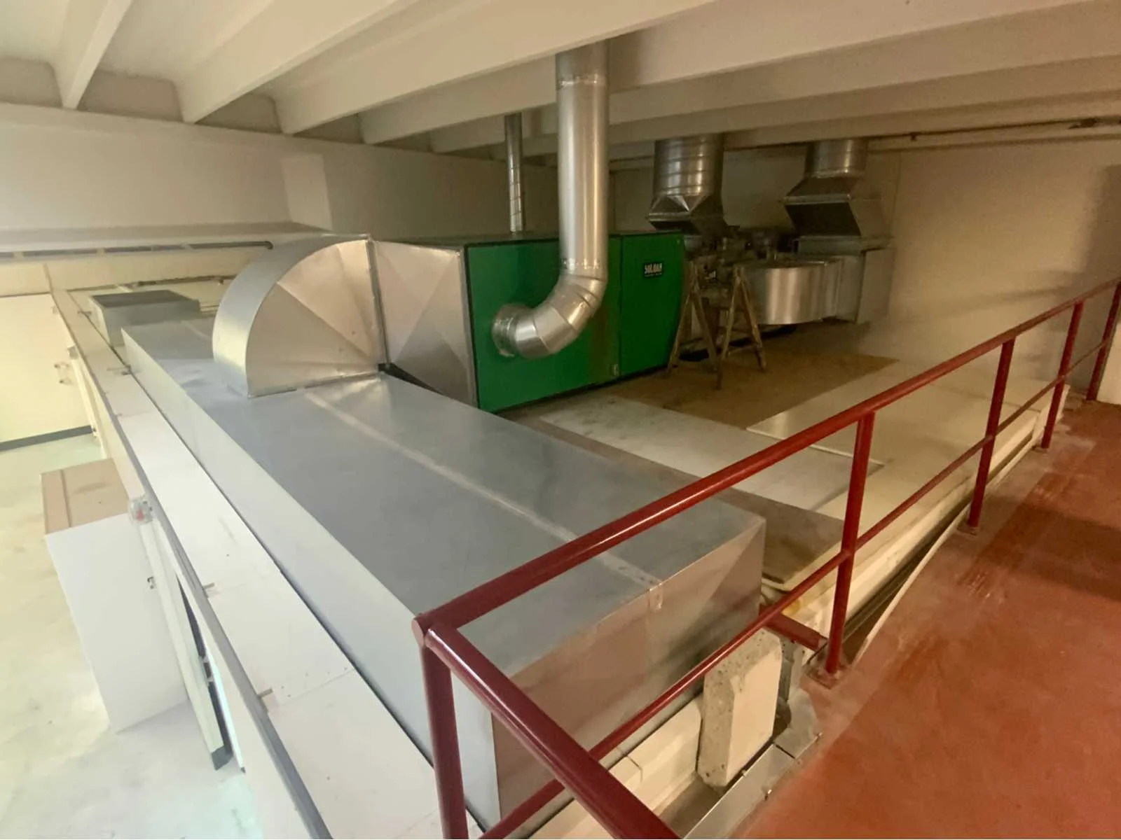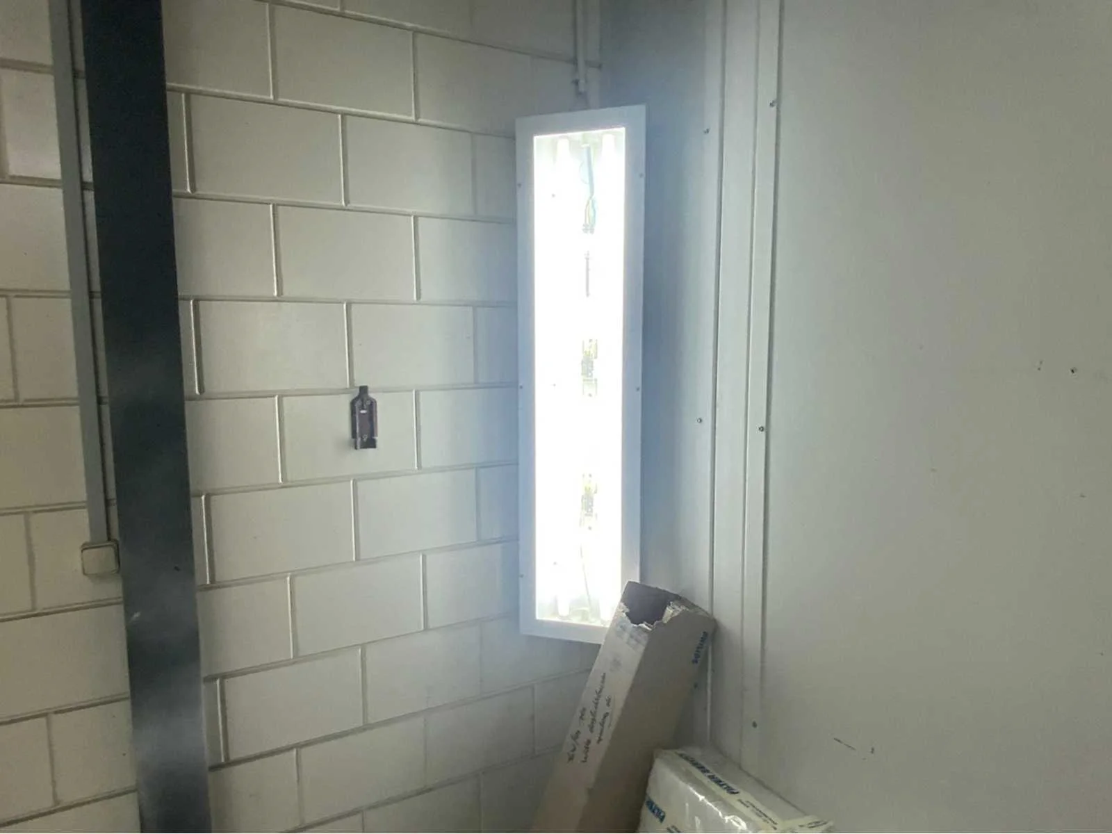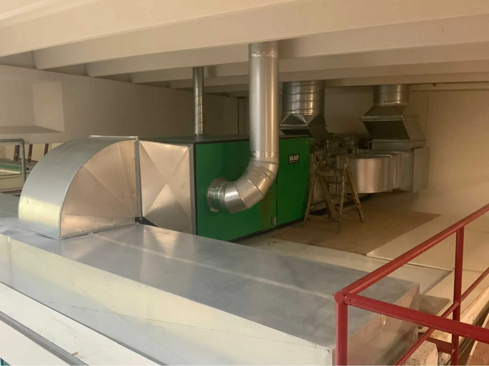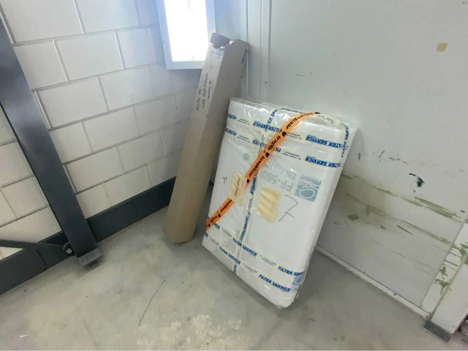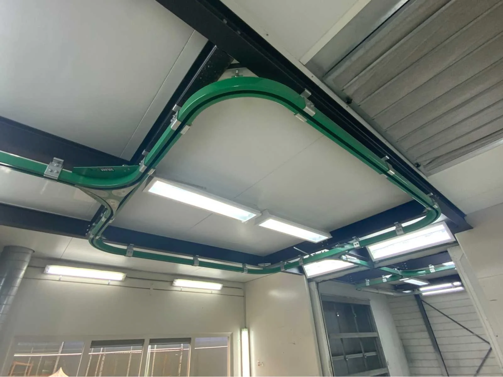 Prefab spuitruimte met 2 droogruimtes gekoppeld. Bestaande uit staal constructie met plaatstaal panelen (50mm gevuld met steenwol). Voorwanden en tussenwanden voorzien van schuifdeuren (247x296cm) Achterwand en zijwanden zijn bouwkunding en blijven achter. Soloan 1032 Afzuigwand 300x314cm, 110Kw luchttoevoer/verwarmingsunit gasgestookt, dampafzuiging in middelste droogruimte, afzonderlijke Soloan DDE dampafzuiging ten behoeve van verfaanmaakruimte, Ruimte is voorzien van Soloan S7 railsysteem met 35 kozijnbalkwagens (maximale last 250kg per rol). Overal ruim voldoende verlichting (IP54 beschermd). Alle aan- en afvoer kanalen horen bij het kavel behalve de dakdoorvoeren. Voorzien van bedieningspaneel TR-SD, voorfilter/kleppensectie type K600 (benodigd voor watergedragen spuiten) voorzien van Soloan S4000 Dampafzuiginstallatie. Spuituren: 619 uur. Nee Merk: Soloan Bouwjaar: 2004 Binnen afmeting l: 18000cm Afzuiginstallatie: true Aansluiting: 400V Afmeting l: 18000mm Afmeting b: 6000mm Afmeting h: 3100mm