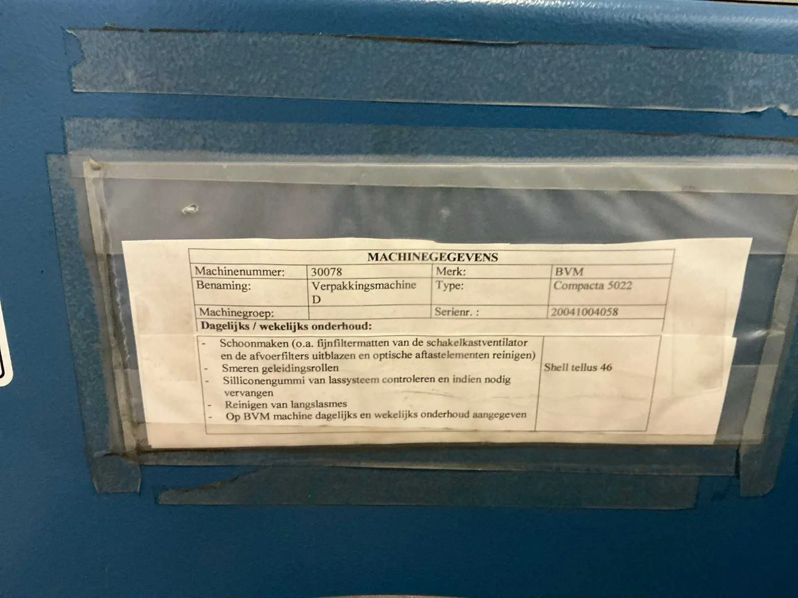 Folie / seal verpakkingsmachine. Onder andere voorzien van: beschermingskast, bedieningspaneel, automatische foliedoorvoer, instelmogelijkheden, aanvoer en afvoer, 380V aansluiting en handleiding. In werkende staat. Nee Merk: BVM Type: Compacta 5022 Bouwjaar: 2004 Serienummer: 20041004058 Aansluiting: 380V Totale afmeting L: 2000mm Totale afmeting Breedte: 2000mm Totale afmeting Hoogte: 1800mm