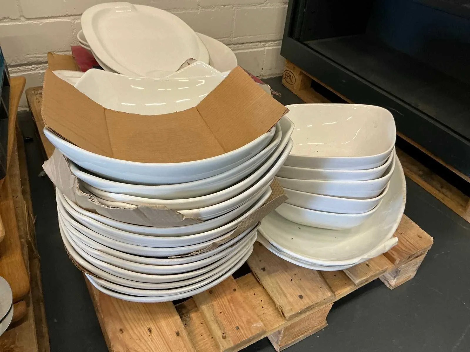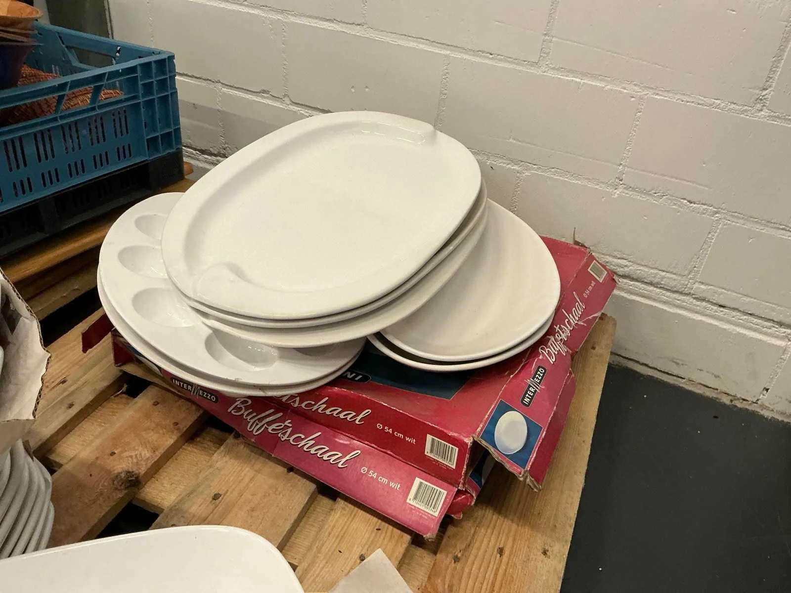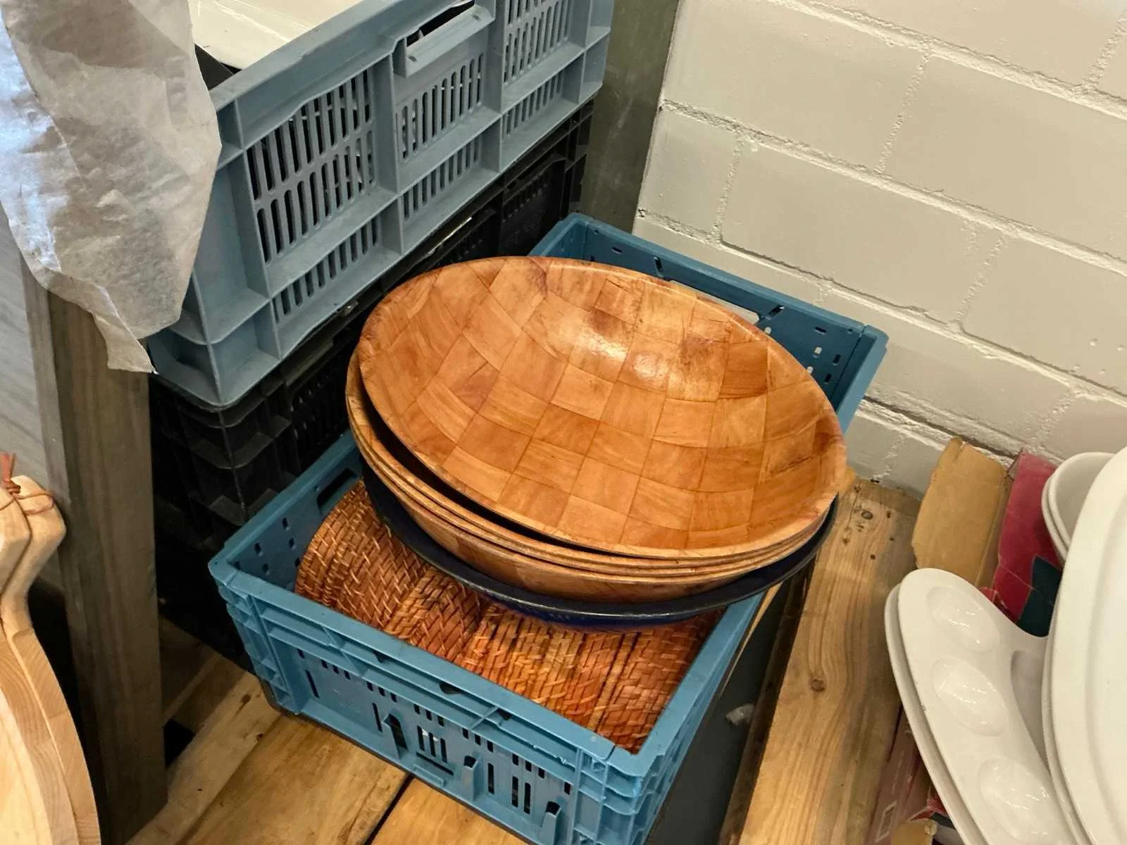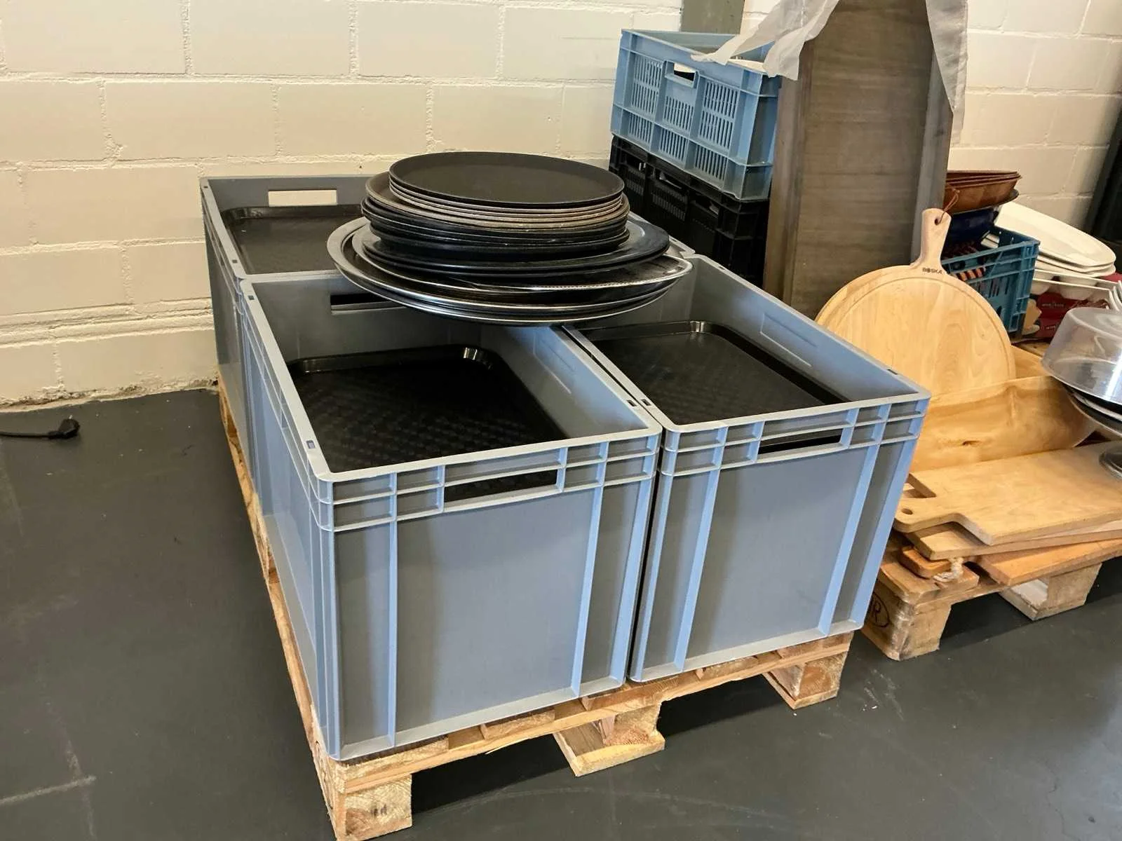 Voorzien van: diverse houten serveerplanken, diverse ovenschalen, diverse broodmandjes, diverse taart standaard, diverse aardewerk schalen, +/- 200 selfservice plateau Nee
