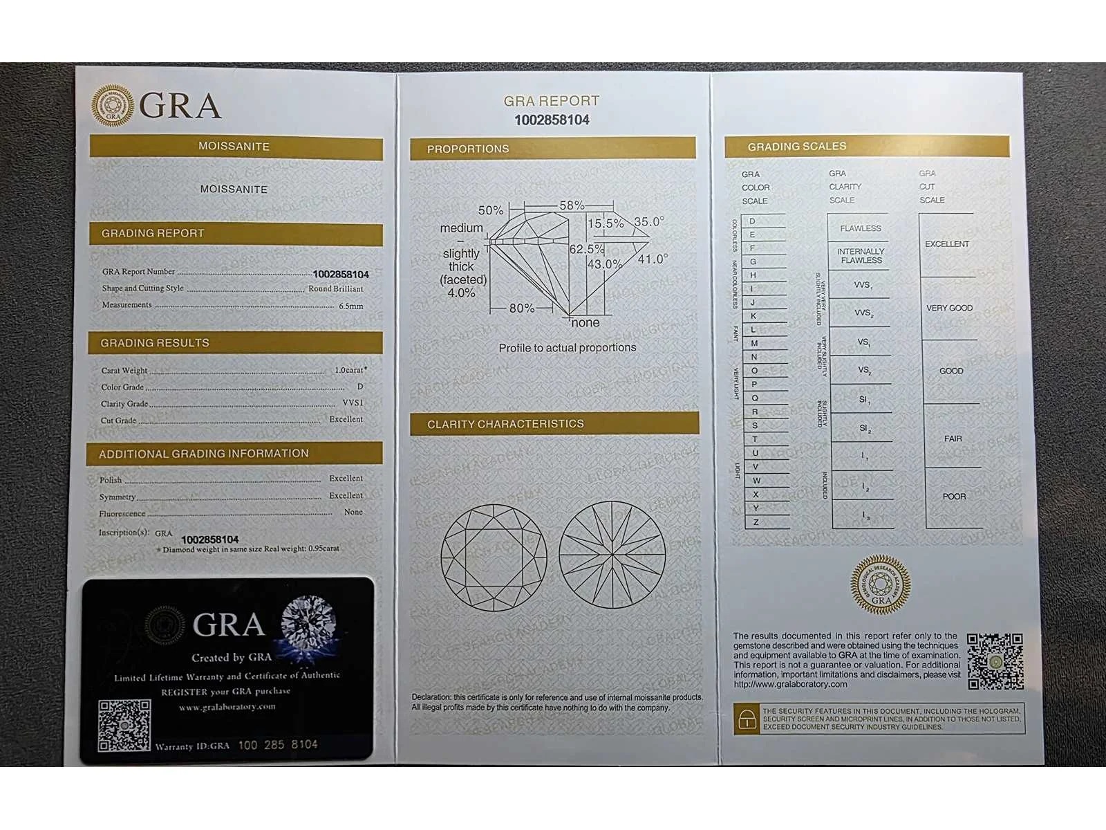 Diamant:(Lab-grown) Aantal: 1 stuk Slijpvorm: Moissanite Briljant Gewicht (carat): 1.00 carat Kleur: D Zuiverheid: VVS1 Polish: Excellent Certificaat: GRA Conditie: Nieuw Verpakking: Komt met een Edelsteendoos Toelichting: De kwaliteit is overgenomen van het rapport behorend bij item. Nee