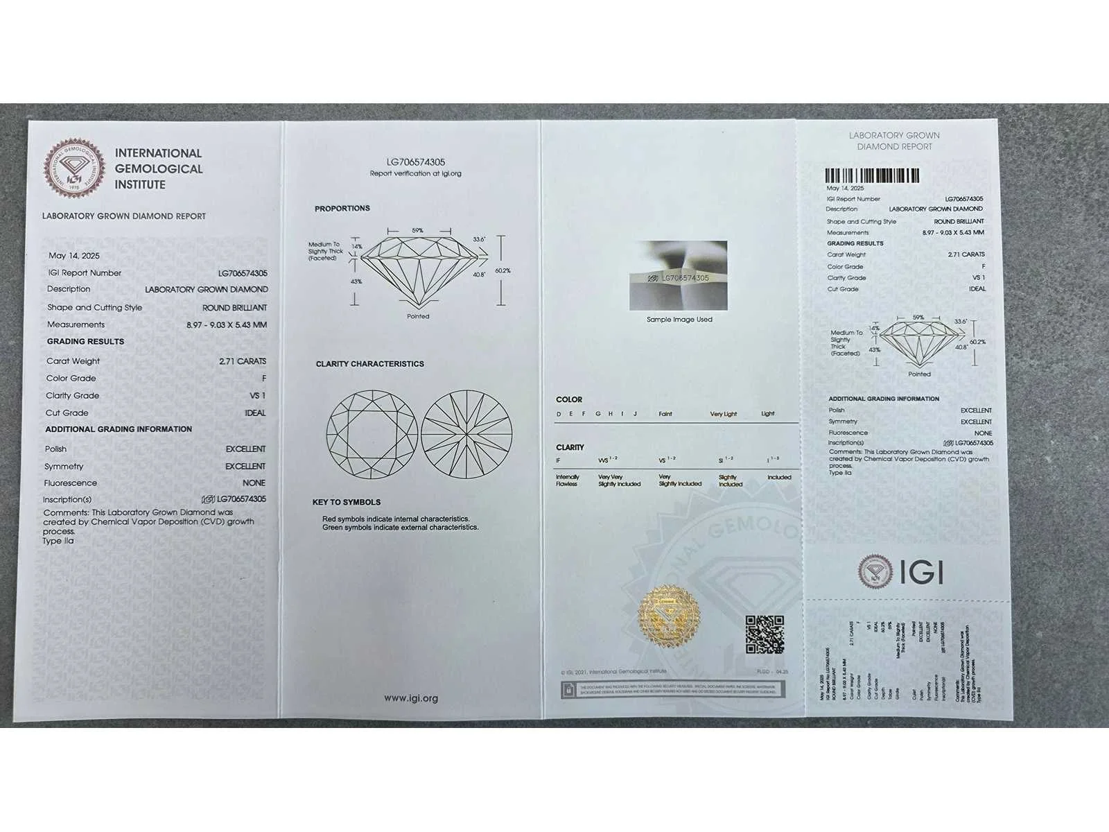 Diamant:(Lab-grown) Aantal: 1 stuk Slijpvorm: Briljant Gewicht (carat): 2.70 carat Kleur: F Zuiverheid: VS1 Polish: Excellent Certificaat: IGI Conditie: Nieuw Verpakking: Komt met een Edelsteendoos Toelichting: De kwaliteit is overgenomen van het rapport behorend bij item. ; De winkelwaarde die bij de sieraden en diamanten vermeld staat is de historische retailprijs. Dit is de prijs waarvoor het sieraad in het verleden of in sommige gevallen nog steeds bij de juwelier in de etalage heeft gelegen/ligt. Historische retailprijzen:€ 8011,- Nee