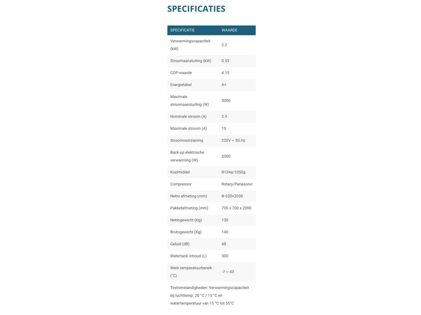 Te bedienen via Wifi, Verwarmingscapaciteit (kW) 2.2, Stroomaansluiting (kW) 0.53, COP-waarde 4.15, Energielabel A+, Maximale stroomaanslui9ng (W) 3000, Nominale stroom (A) 2.9, Maximale stroom (A) 15, Stroomvoorziening 220V ~ 50 Hz, Back-up elektrische verwarming (W) 2000, Koelmiddel R134a/1050g, Compressor Rotary/Panasonic, Netto afmeting (mm) Φ 620×2038, Pakketafmeting (mm) 700 x 700 x 2090, Nettogewicht (Kg) 130, Brutogewicht (Kg) 140, Geluid (dB) 48, Watertank inhoud (L) 300, Werk temperatuurbereik (°C) -7 ~ 43 Nee Merk: Technopump Product type: YT-300 TB1 Gewicht: 140kg Leveringsvoorwaarden: Heftruck aanwezig op locatie!