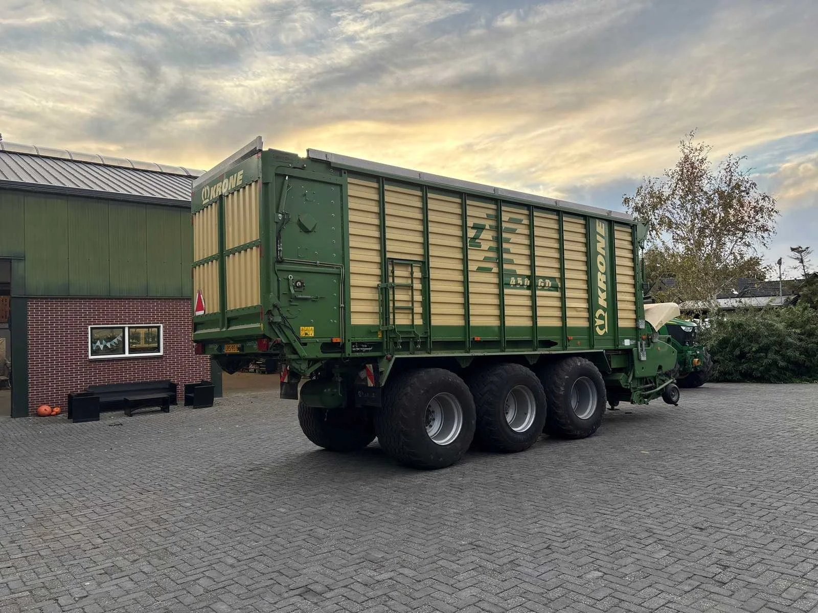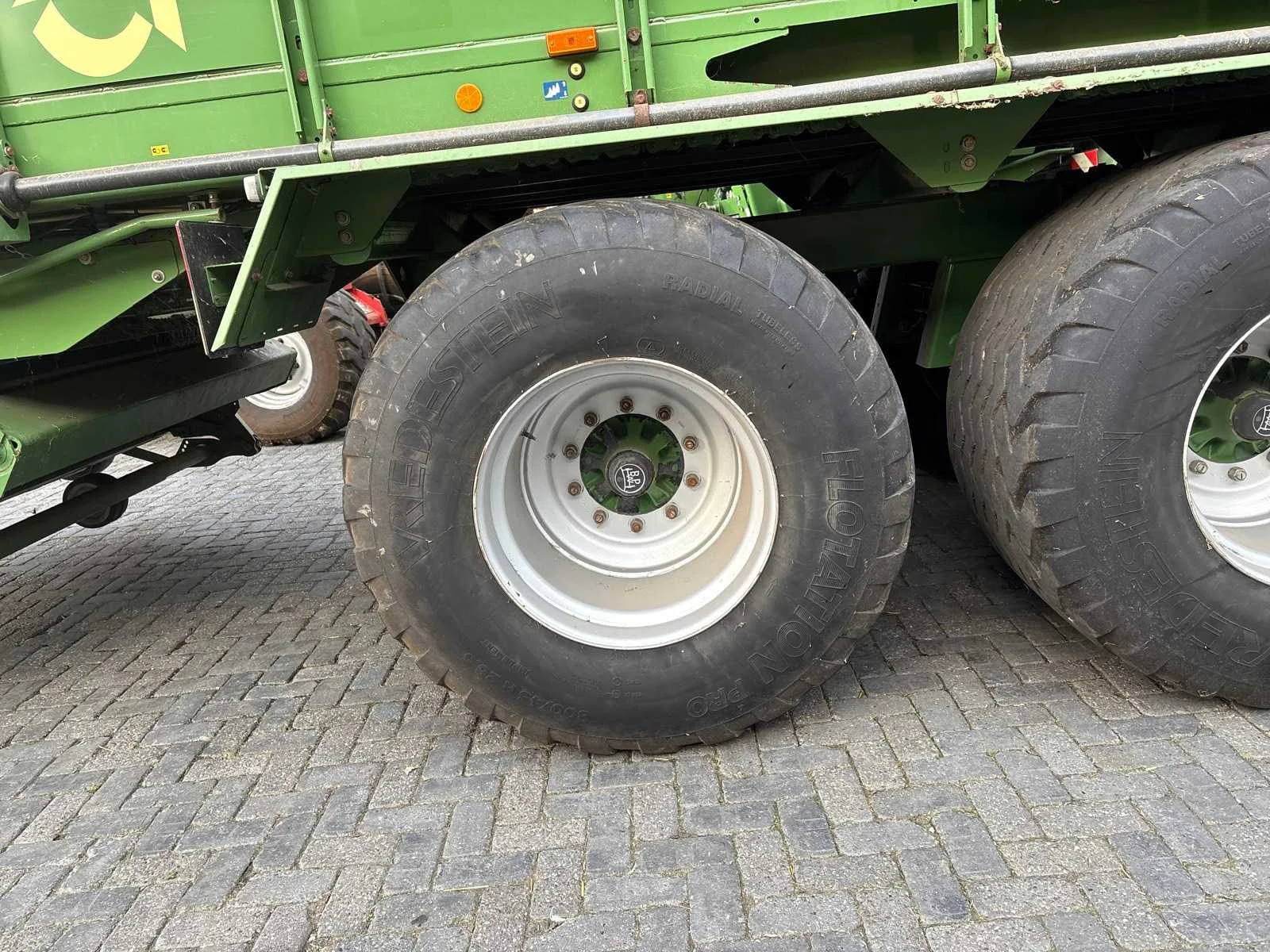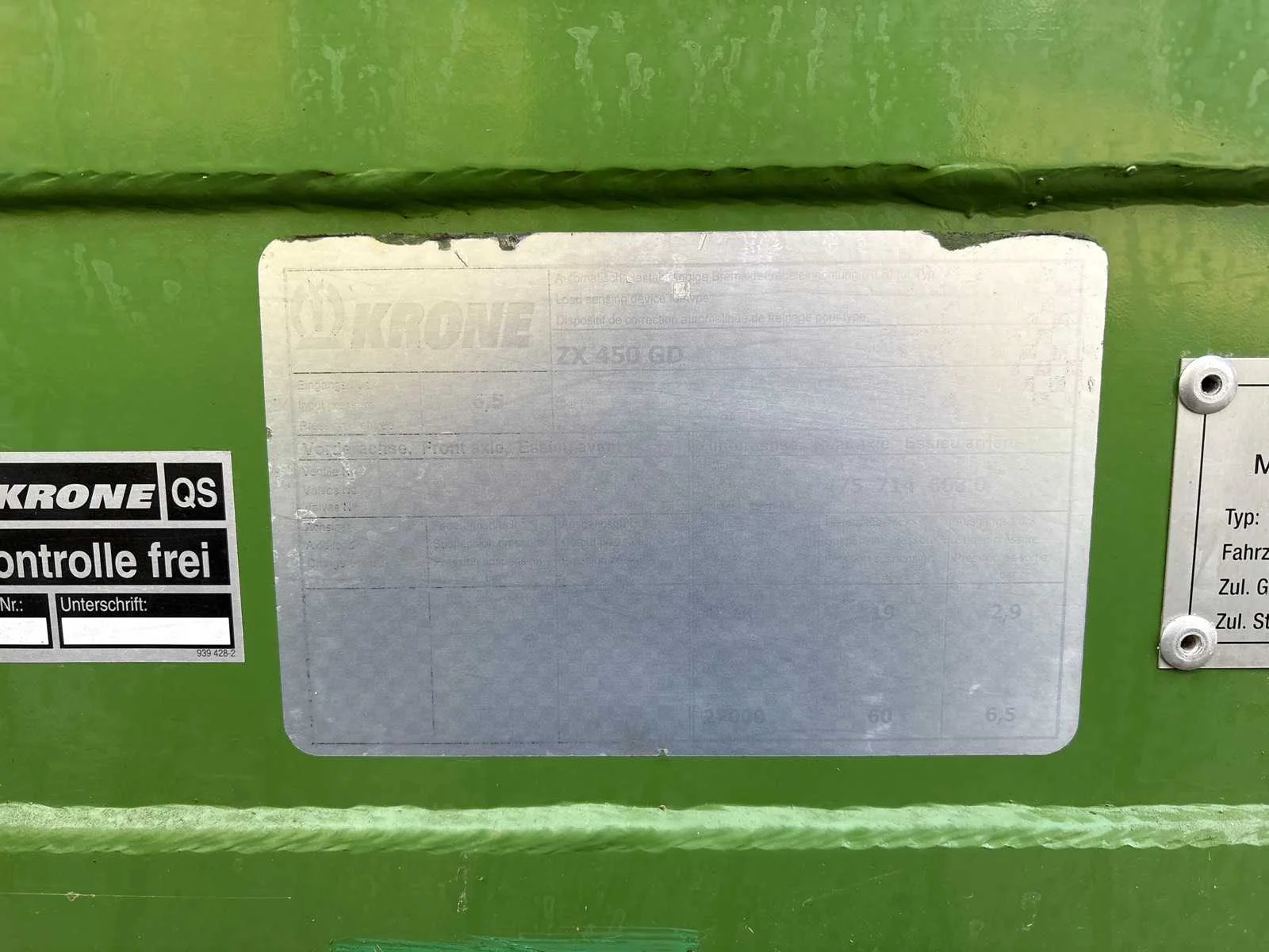 Deze Krone ZX 450 opraapwagen is uitgerust met een hydraulisch tridemstel (3-assig) met liftas en gedwongen besturing. De wagen staat op 800/45R26.5 banden en beschikt over een weeginrichting in combinatie met doseerwalsen. Verder is de machine voorzien van een Gamma bedienterminal, granulaat dosseerapparaat en wordt geleverd met Nederlands kenteken (LRS-95-B). De opraapwagen heeft een opslagcapaciteit van 27.000 liter en is voorzien van maximaal 46 messen. Het eigen gewicht bedraagt 28.500 kg. De totale afmetingen zijn 10.000 mm lengte, 3.000 mm breedte en 3.900 mm hoogte. Serienummer: ZX873071. Nee Merk: Krone Type: ZX 450 Bouwjaar: 2013 Serienummer: ZX873071 Kenteken: LRS-95-B Opslagcapaciteit: 27000 Met onderstel: true Bandenmaat: 800/45R26.5 Maximaal aantal messen: 46 Verdeelwals: true Doseerapparaat: true Eigen gewicht: 28500 Totale afmeting L: 10000 Totale afmeting Breedte: 3000 Totale afmeting Hoogte: 3900