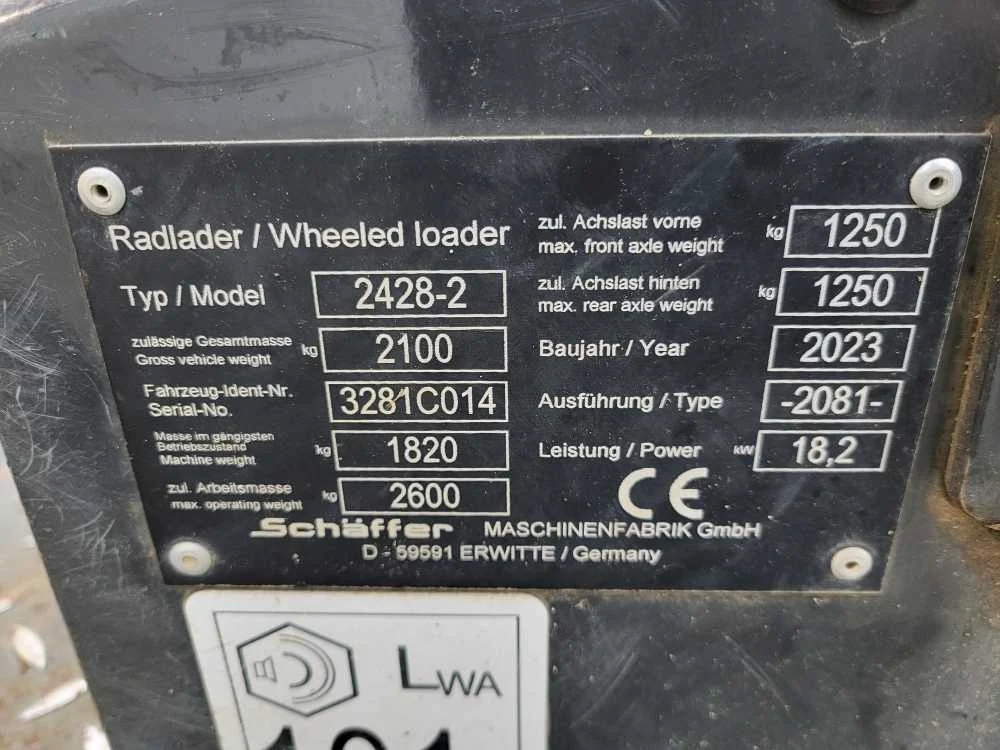 Voorzien van 3-Cil. “Kubota” Dieselmotor; extra hydraulische functie; inclusief grondbak; hydraulische snelwissel; trekhaak; Nee Merk: Schaffer Type: 2428 - 2 Bouwjaar: 2023 Serienummer: 3281C014 Merk motor: Kubota Kenteken: T-54-FRK Motorvermogen (kW): 18.2kW Aantal cilinders: 3 Brandstof: diesel Bedrijfsgewicht: 2100kg Bandenmaat: 300/60-12 Afgelezen urenstand: 1414