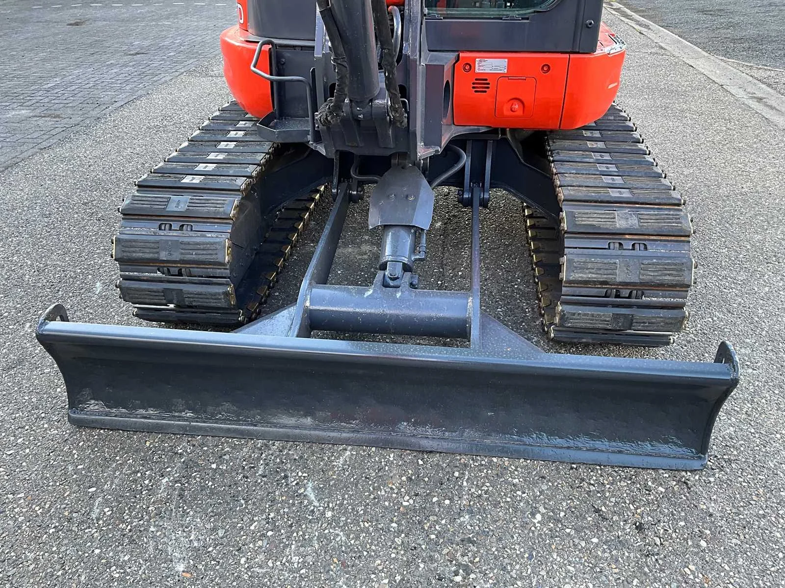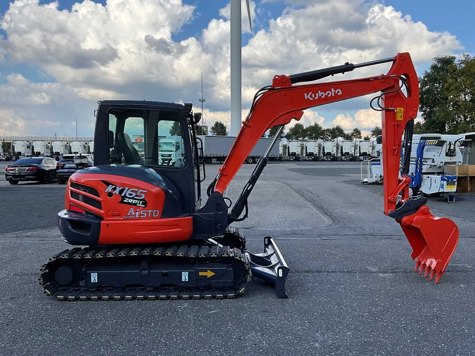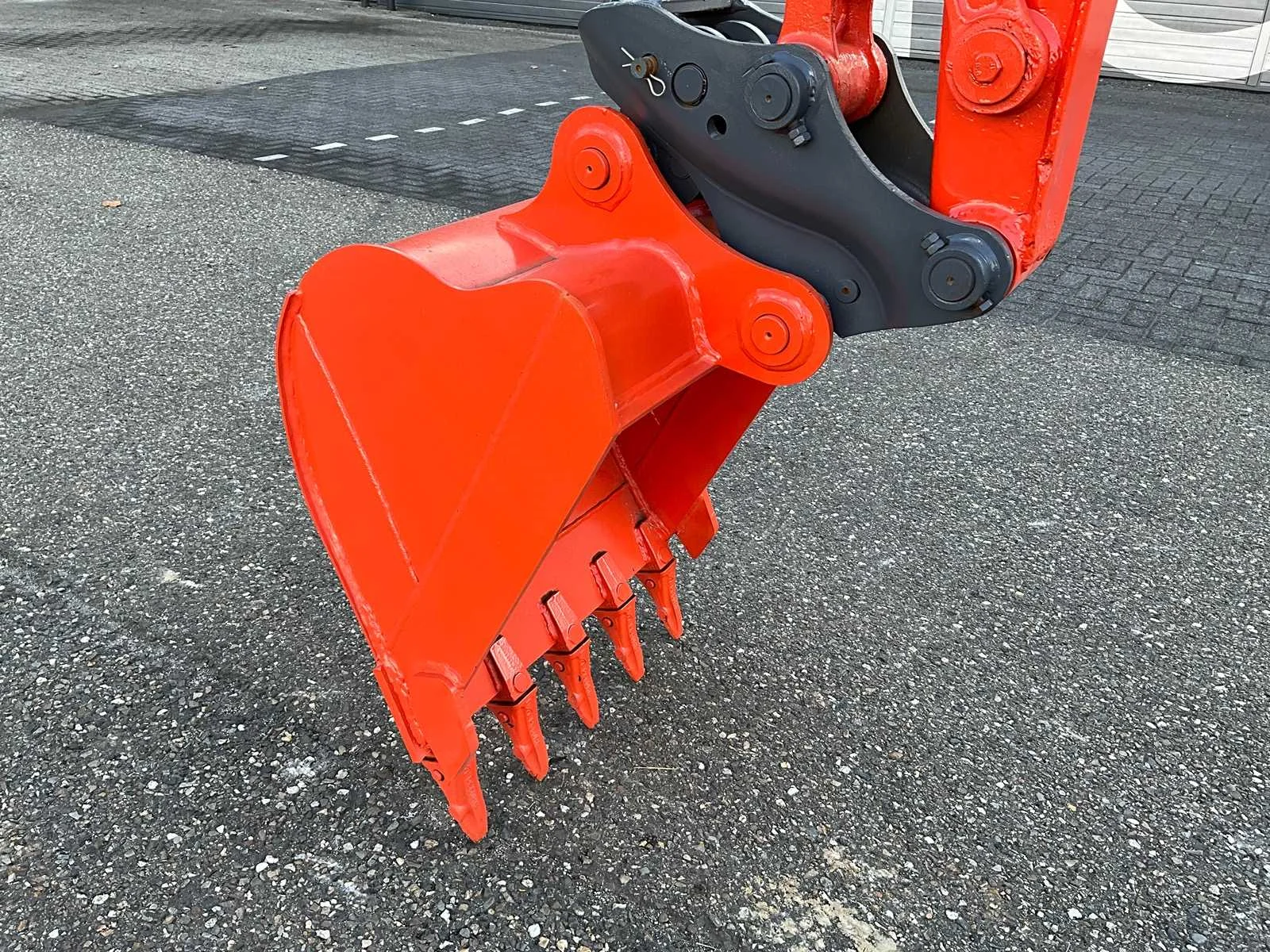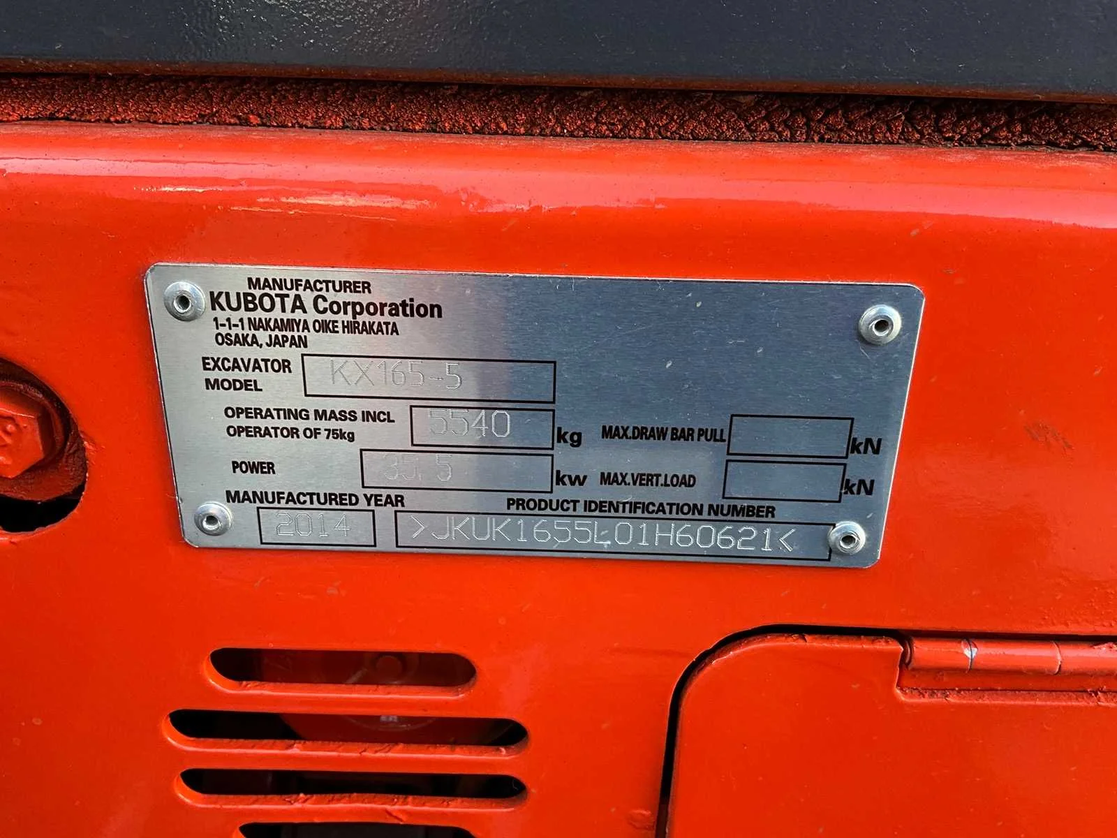 Dieplepelbak met tanden 700mm, mechanische snelwissel, extra hydraulische functie, schuifblad 1950mm, rubber pads op stalen rupsen, Auto Idle toert niet op, 2e rijsnelheid Nee Merk: Kubota Type: KX165-5 Bouwjaar: 2014 Serienummer: 60621 Merk motor: Kubota Motorvermogen (kW): 35.5kW Aantal cilinders: 4 Brandstof: diesel Bedrijfsgewicht: 5540kg Met graafbak: true Graafbak afm. b: 700mm Rups breedte: 400mm Cabine: true Afgelezen urenstand: 4326 Totale afmeting L: 5700mm Totale afmeting Breedte: 2000mm Totale afmeting Hoogte: 2600mm