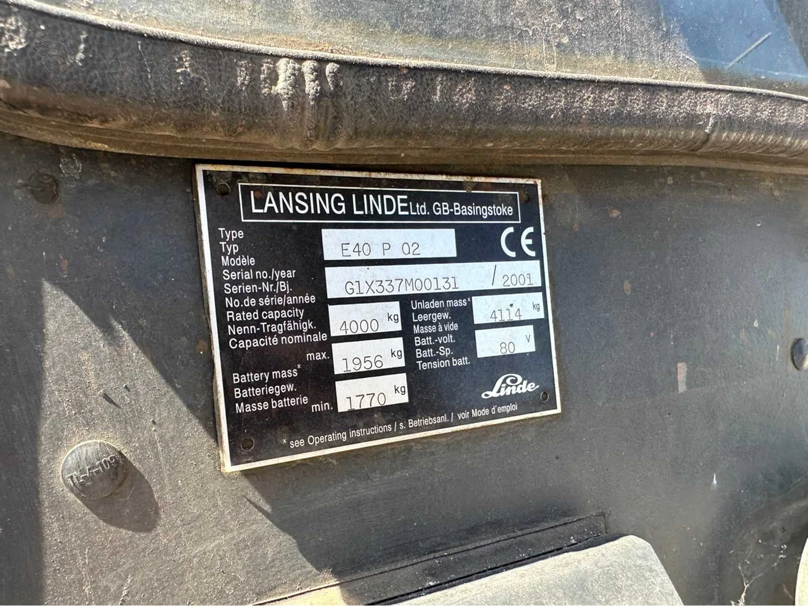 Aankoopbon nieuwe accu aanwezig, Gewicht: 6.870 kg, Wendcirkel: 2.52 m, Batterij: 80 V, 1.863 kg, Aandrijfmotor: 12,5 kW AC, Hefmotor: 15 kW AC, Banden: Superelastisch (SE), Stuurinrichting: Hydrostatisch Nee Merk: Linde Type: E40 P 02 Bouwjaar: 2001 Serienummer: G1X337M00131 Brandstof: Elektrisch Afgelezen urenstand: 94278 Accu lader: true Free-lift: true Duplex mast: true Hefvermogen: 4000kg Hefhoogte: 5500mm Luchtbanden: true Minimale doorrijhoogte: 2300mm Totale afmeting L: 2835mm Totale afmeting Breedte: 1350mm