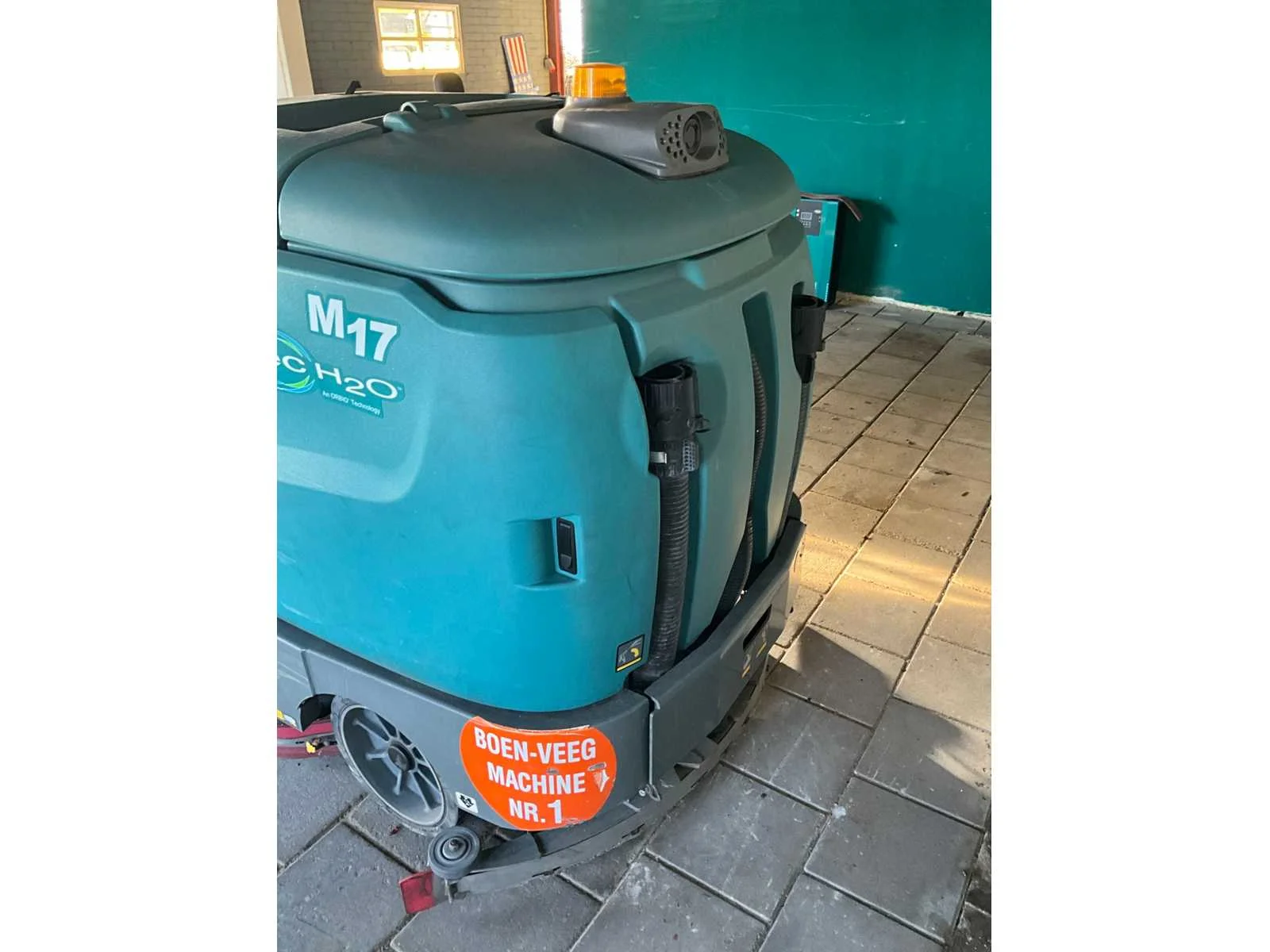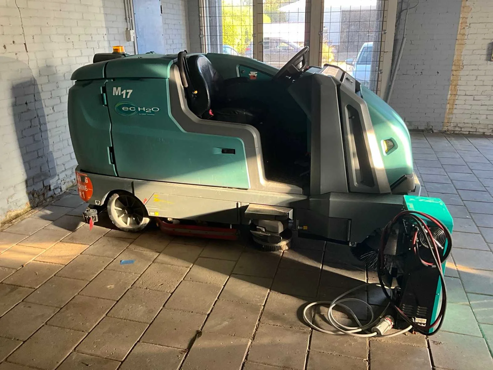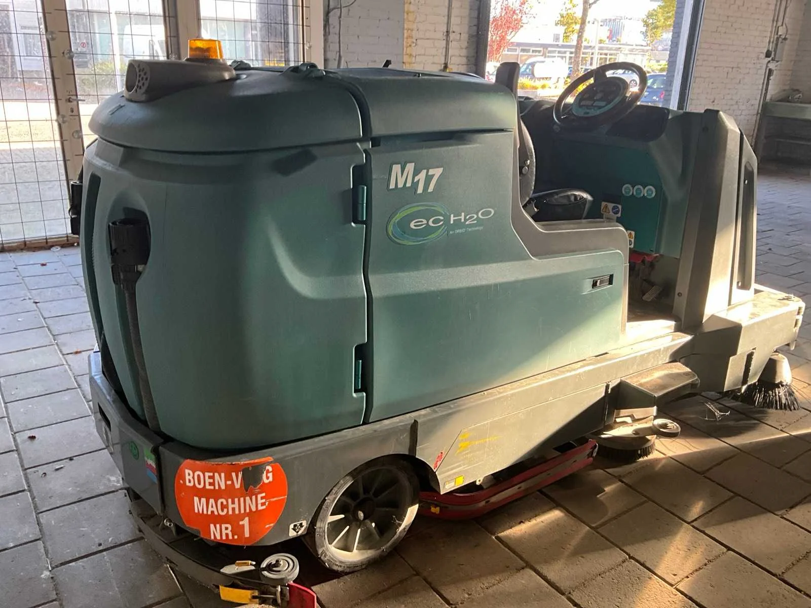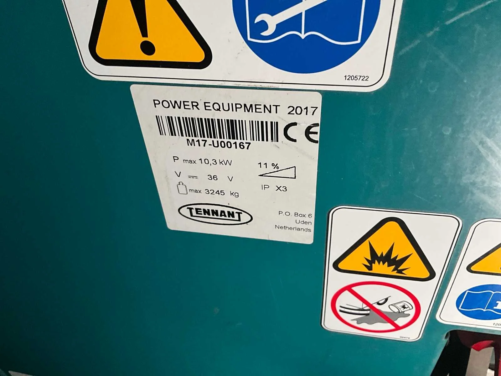 De Tennant M17 is een opzit veeg- en schrobmachine die in één werkgang vloeren veegt, schrobt en droogzuigt. Hij is ontworpen voor zware industriële en commerciële omgevingen en combineert hoge productiviteit met stof- en vuilopname in grote oppervlakken Model: Tennant M17 (opzit veeg-/schrobmachine) Bouwjaar: 2017 Serienummer: M17-U00167 Voeding: 36 V (accu) Max. vermogen: 10,3 kW Max. toegelaten gewicht (GVW): 3.245 kg Max. helling (gradeability): 11 % Beschermingsklasse: IP X3 (beschermd tegen spatwater) Reinigingsprestaties: Schrobbreedte (borsteldek): 1.015 mm (40 inch) Met 1 zijborstel (schrob): 1.220 mm (48 inch) Veegbreedte hoofdborstel: 915 mm (36 inch) Met 2 zijborstels (vegen): tot 1.700 mm (67 inch) Theoretische schrobcapaciteit: ~ 10.730 m²/uur Theoretische veegcapaciteit: ~ 14.980 m²/uur Tanks en opvang: Schoonwatertank (solution tank): 285 liter Vuilwatertank (recovery tank): 346 liter Demisting chamber: 61 liter Afvalcontainer (hopper): ~ 85 liter Hopper dumphoogte: 1.525 mm (60 inch), capaciteit 136 kg Aandrijving & motoren: Rijaandrijving: 36 V AC motor, 2,25 kW (3,0 hp) Max. transportsnelheid: 9 km/h Schrobsnelheid: ~ 6,5 km/h Achteruit: 5 km/h Hellingsvermogen: 20 % leeg / 11 % tijdens schrobben Borstels: Schijfborstels: 315 rpm, druk tot ~ 250 kg Cilindrische borstel (indien uitvoering): 500 rpm Vacuümmotoren: 2 × 0,6 kW, 14.500 rpm Nee Merk: Tennant Type: M17 Bouwjaar: 2017 Serienummer: M17-U00167 Afgelezen urenstand: 3789 Elektrisch aangedreven: true Brandstof: Elektrisch Met oplader: true Vermogen: 10,3kW Schoonwatertank: true Inhoud waterreservoir: 285l Inhoud vuilwatertank: 346l