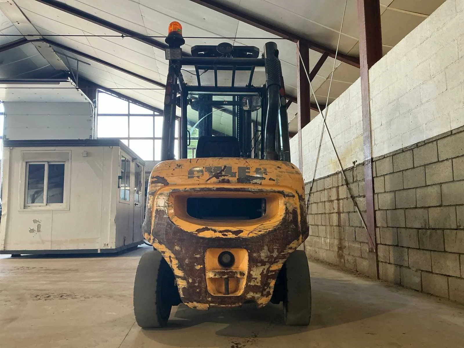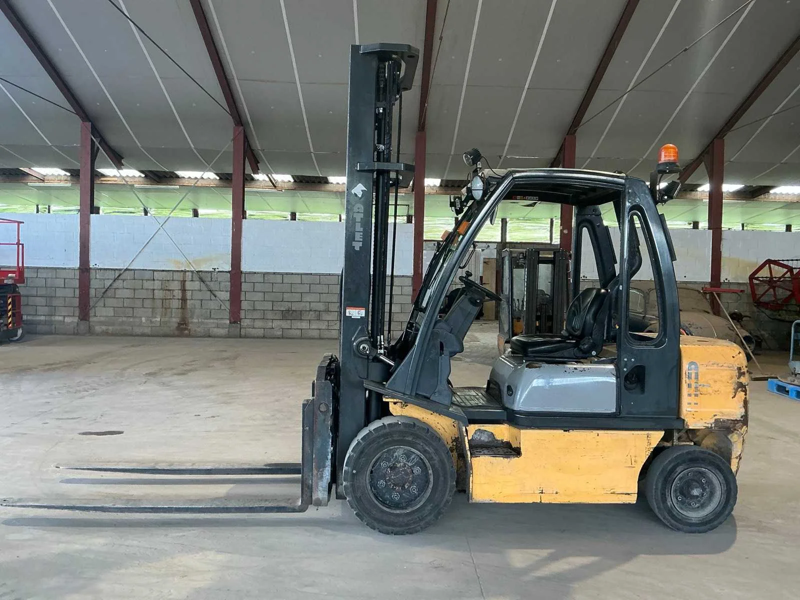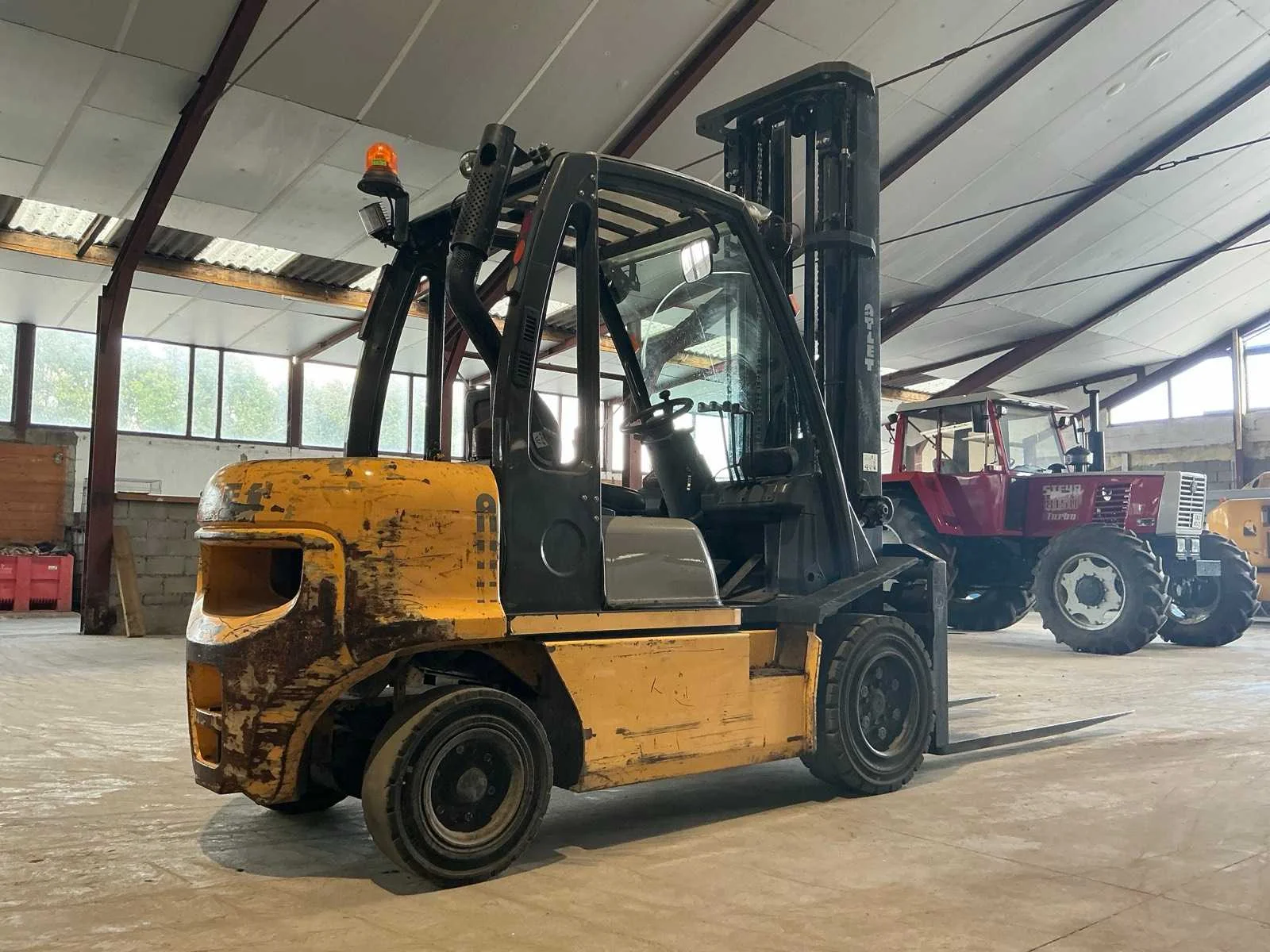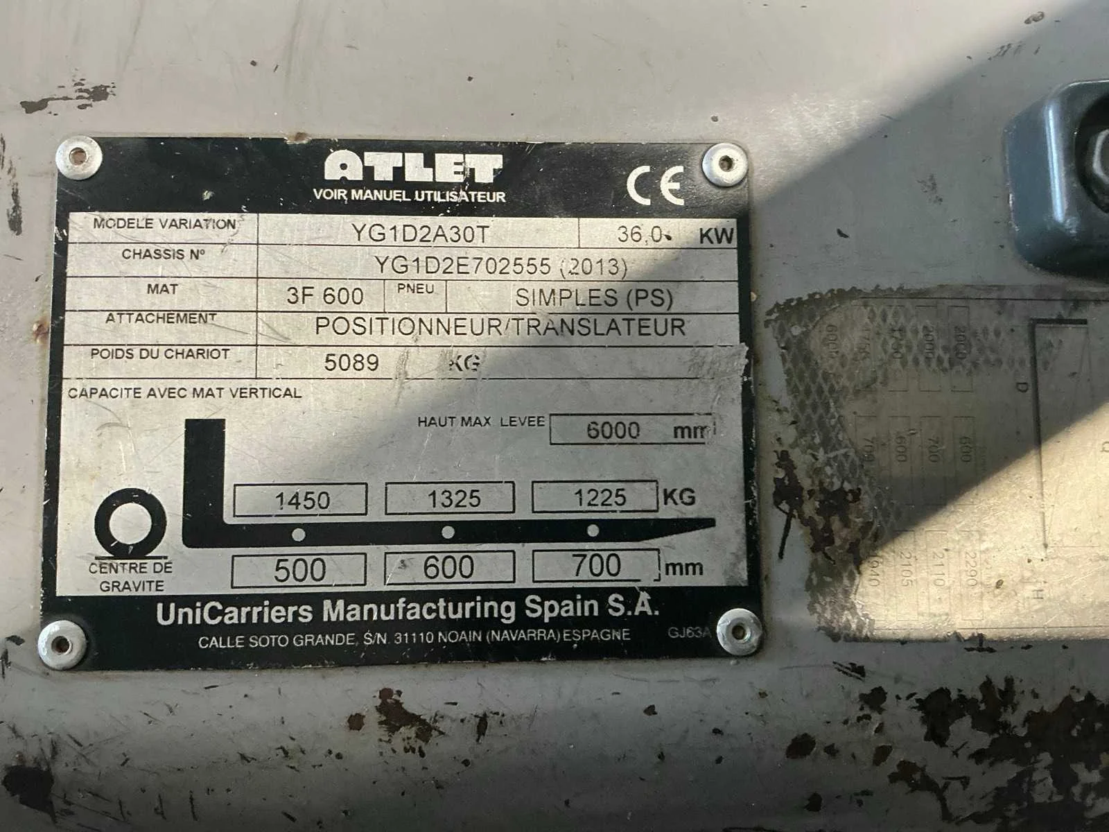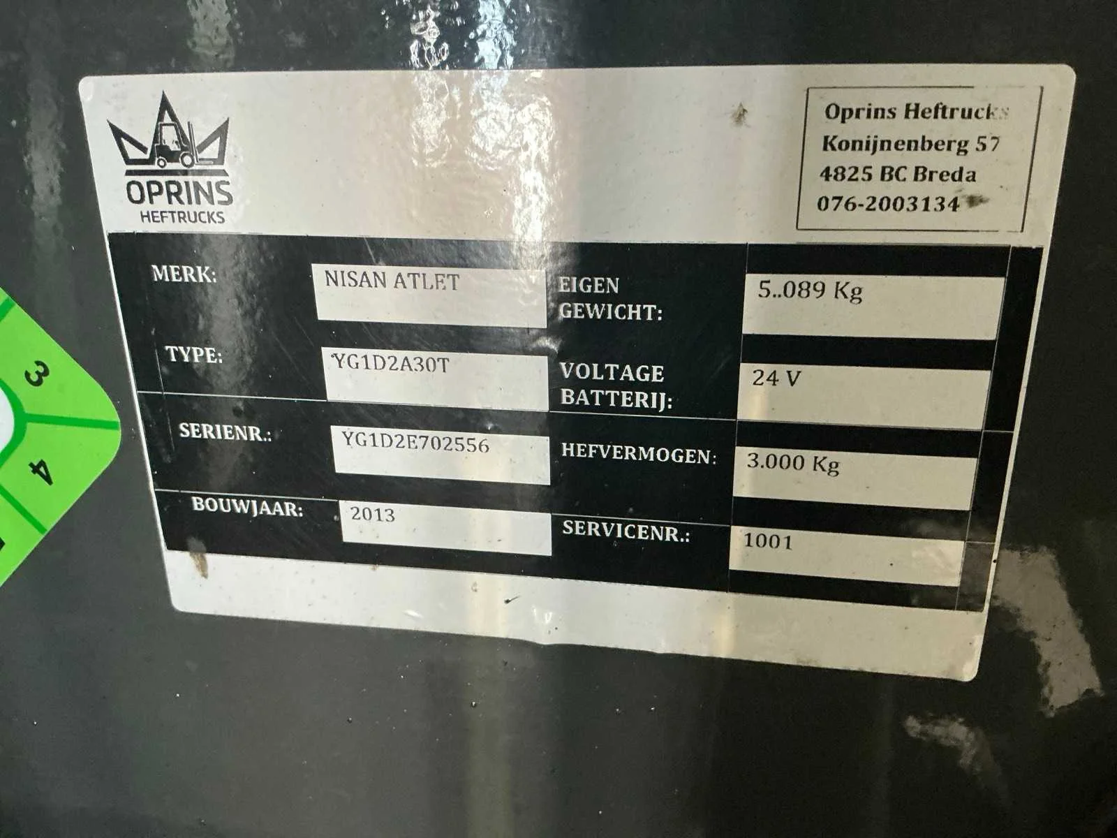 Voorzien van; Extra lange lepels, hydraulisch verstelbare lepels,triplex mast, zwaailamp, waarschuwingslamp voor en achter, werklampen led Nee Merk: Nissan Atlet Type: YG1D2A30T Bouwjaar: 2013 Serienummer: YG1D2E702556 Brandstof: Diesel Kenteken: T-51-BNX Mast: Triple Soort band: Volrubber banden Aantal wielen: 4 Afgelezen urenstand: 8200 Free-lift: true Side-shift: true Hydraulisch verstelbare lepels: true Triple mast: true Eigen gewicht: 5089kg Hefvermogen: 3000kg Lepellengte: 1800mm Max. hefhoogte: 6000mm Vol rubber banden: true Minimale doorrijhoogte: 2850mm Totale afmeting L: 2800mm Totale afmeting Breedte: 1200mm Totale afmeting Hoogte: 2850mm Diesel: true