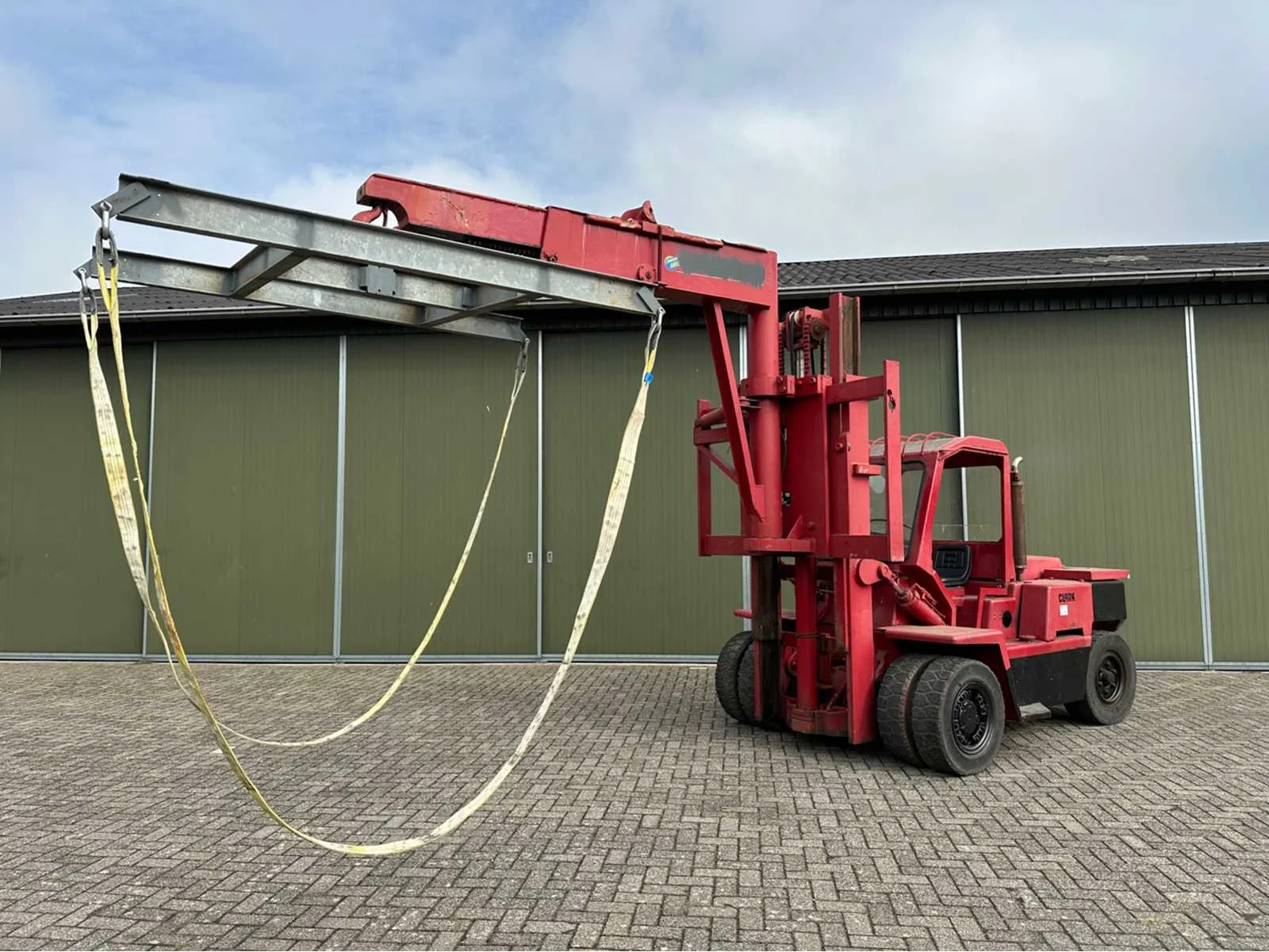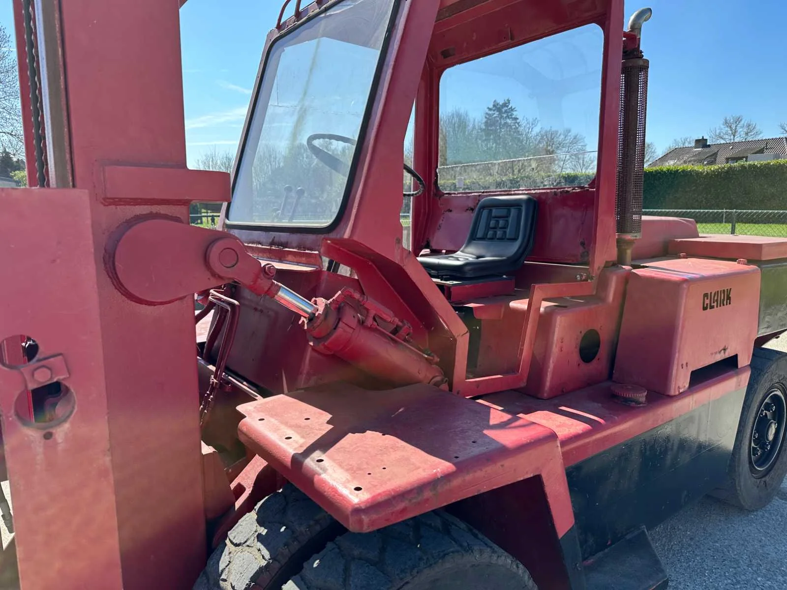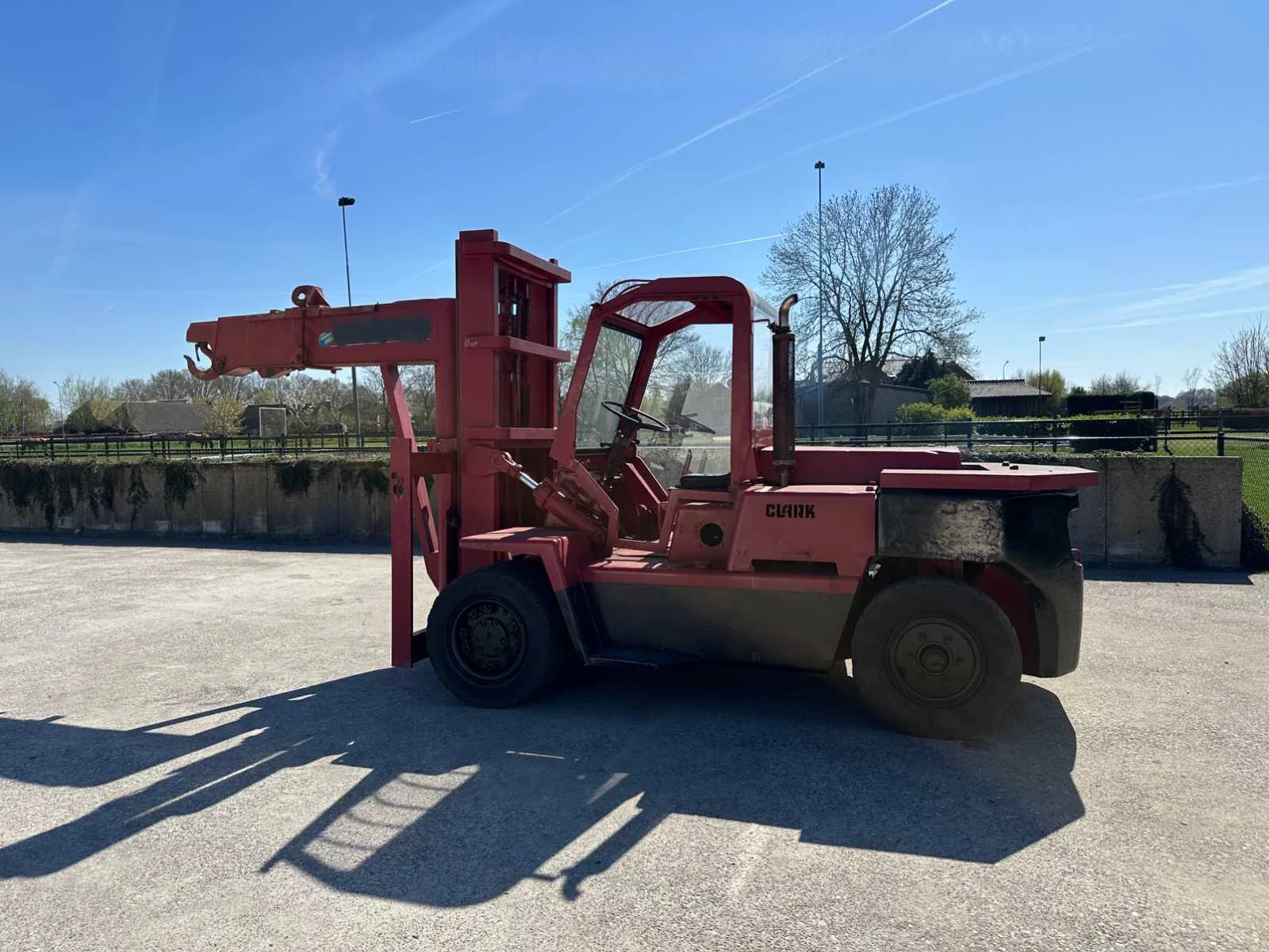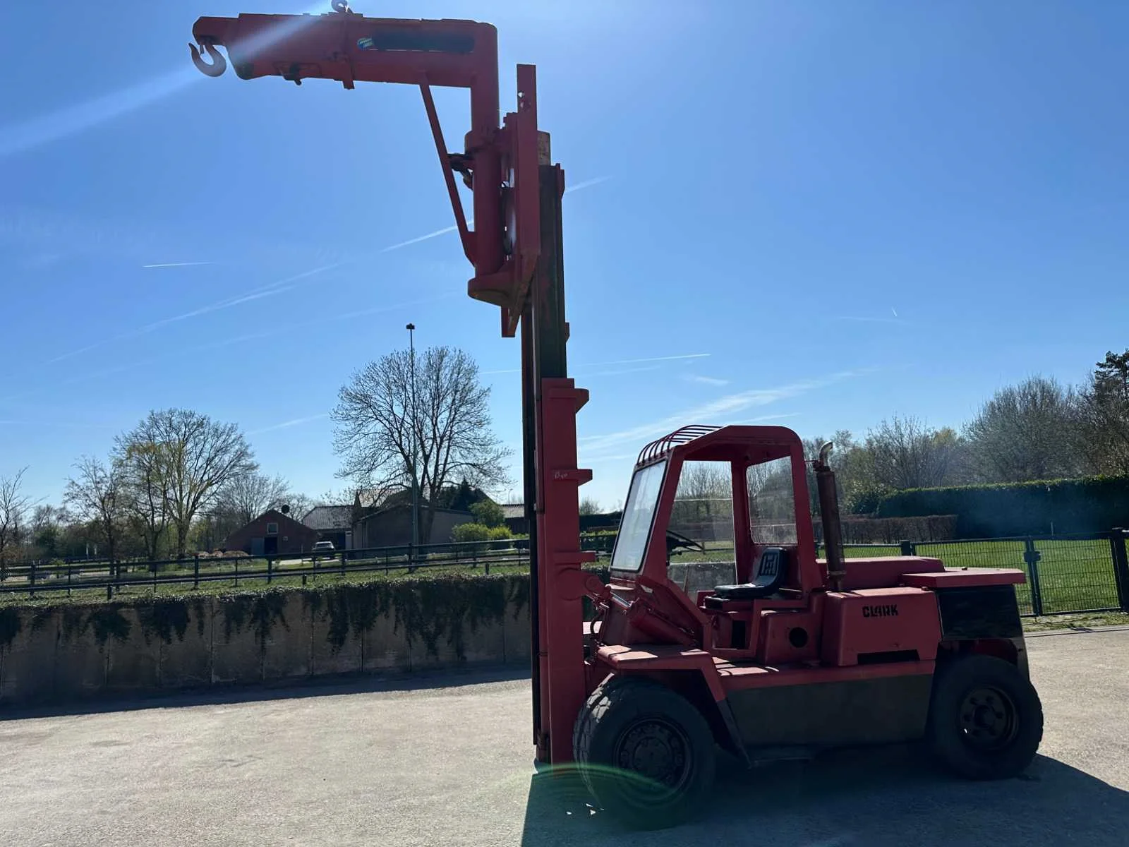 Voorzien van: uitschuifbare mast met zwenkfunctie, inclusief rek en stroppen voor boten laden en lossen; start, rijdt heft en daalt; Nee Merk: Clark Brandstof: Diesel Aantal wielen: 6 Afgelezen urenstand: 7992 Roterend vorkenbord: true Eigen gewicht: 11500kg Hefvermogen: 7000kg Vol rubber banden: true Diesel: true