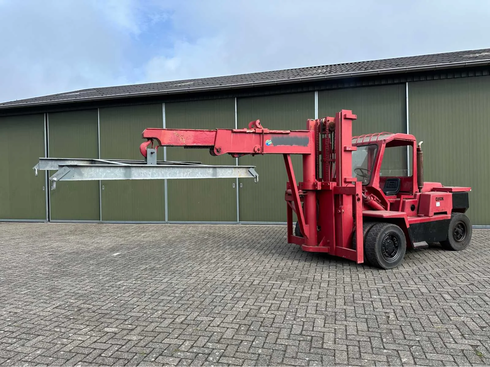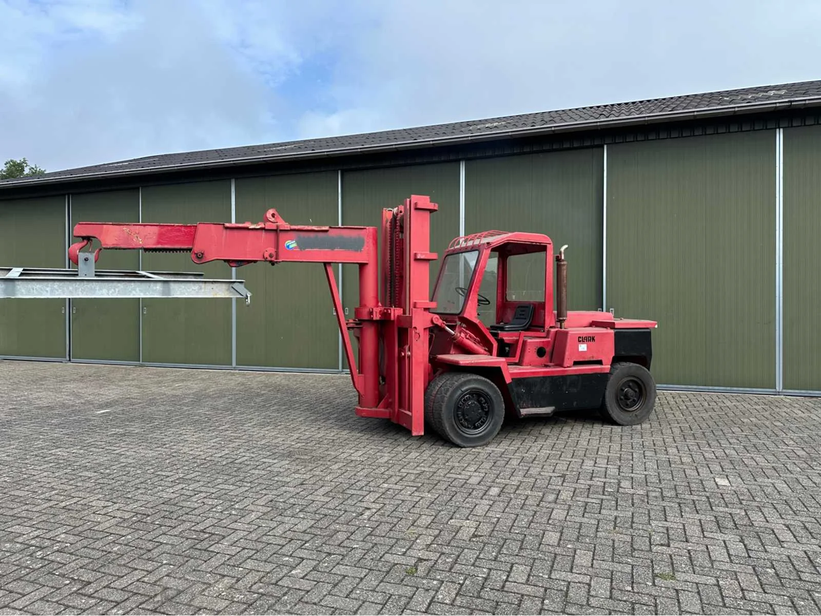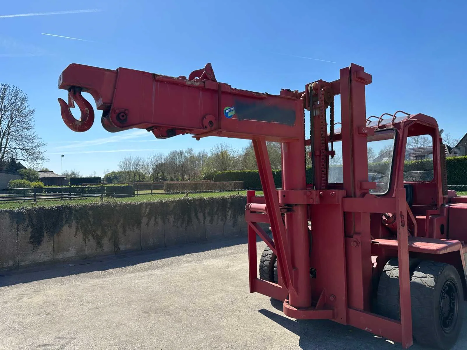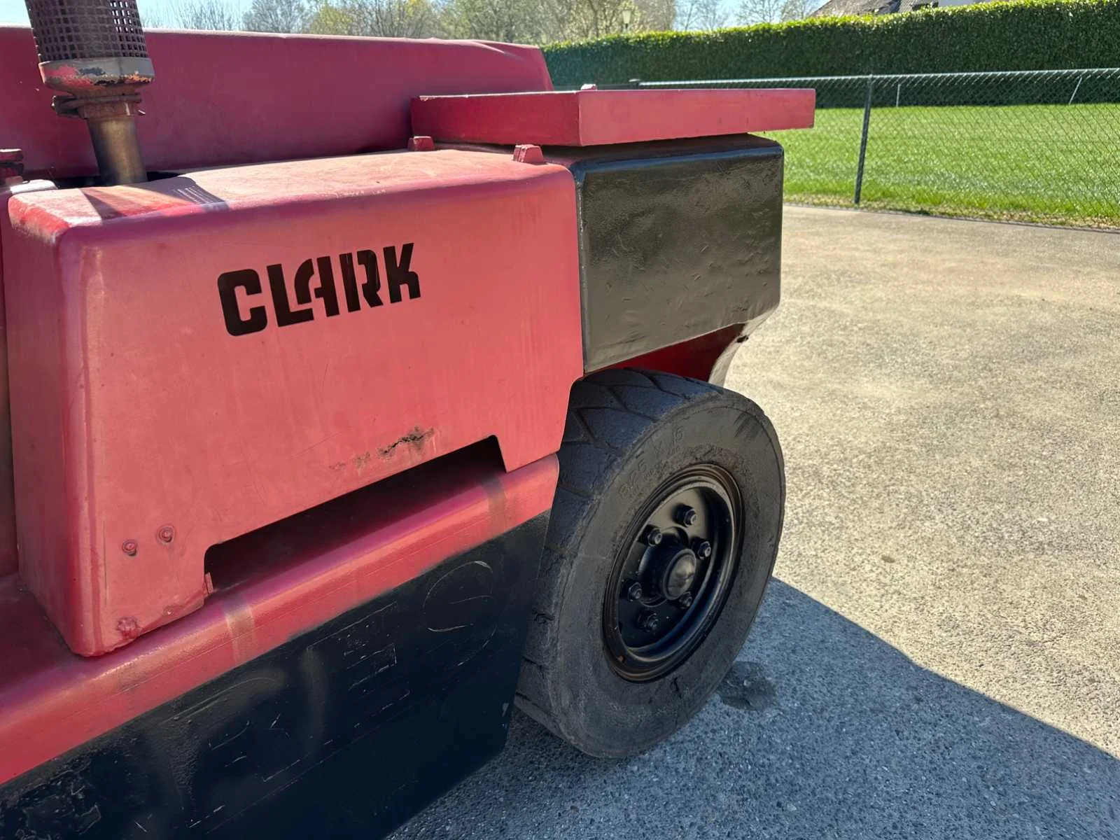 Voorzien van: uitschuifbare mast met zwenkfunctie, inclusief rek en stroppen voor boten laden en lossen; start, rijdt heft en daalt; Nee Merk: Clark Brandstof: Diesel Aantal wielen: 6 Afgelezen urenstand: 7992 Roterend vorkenbord: true Eigen gewicht: 11500kg Hefvermogen: 7000kg Vol rubber banden: true Diesel: true