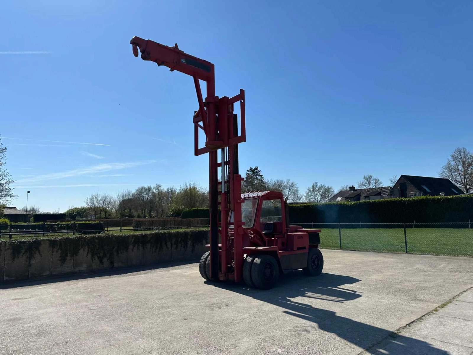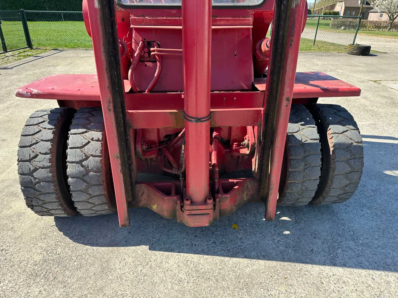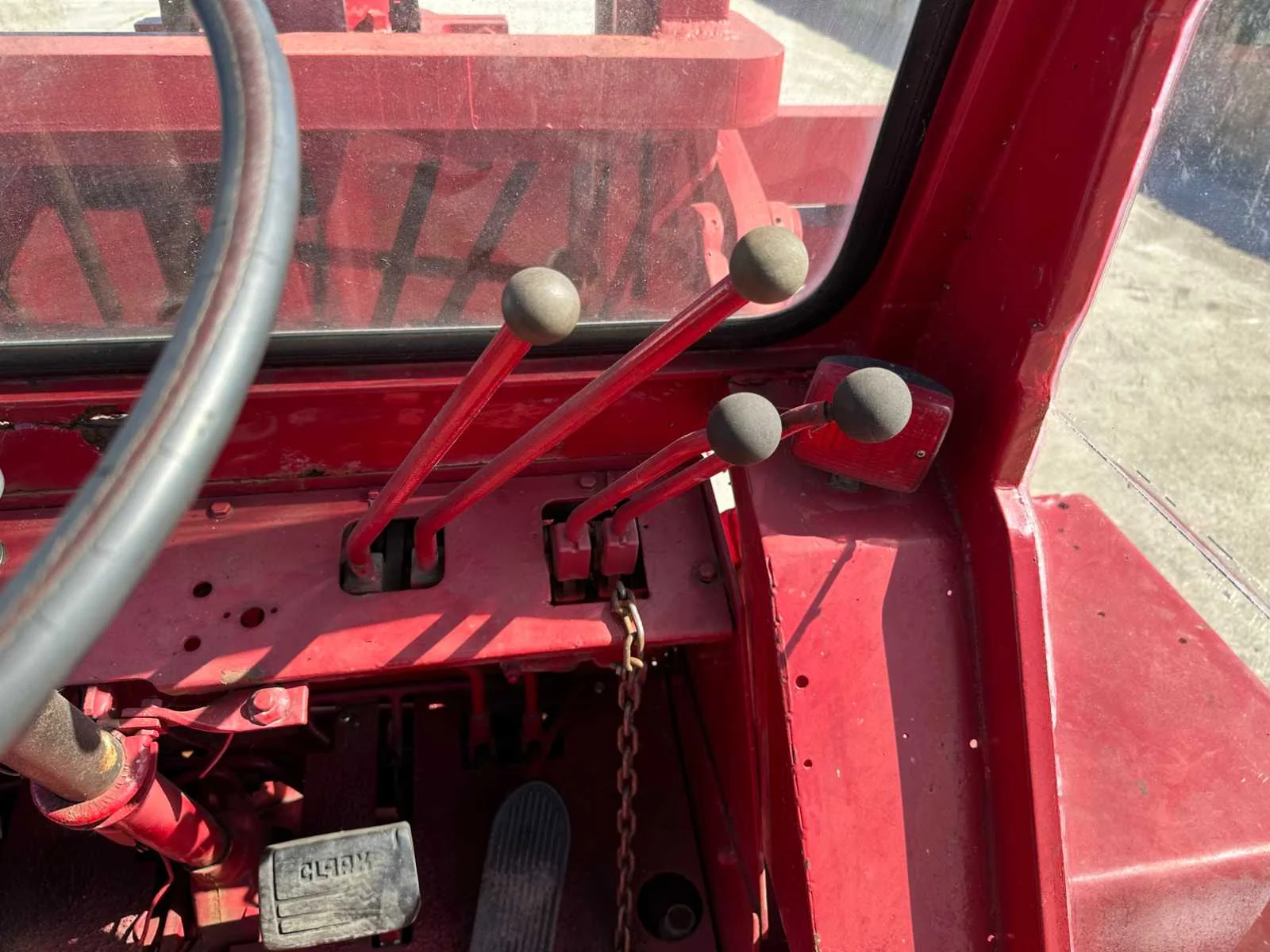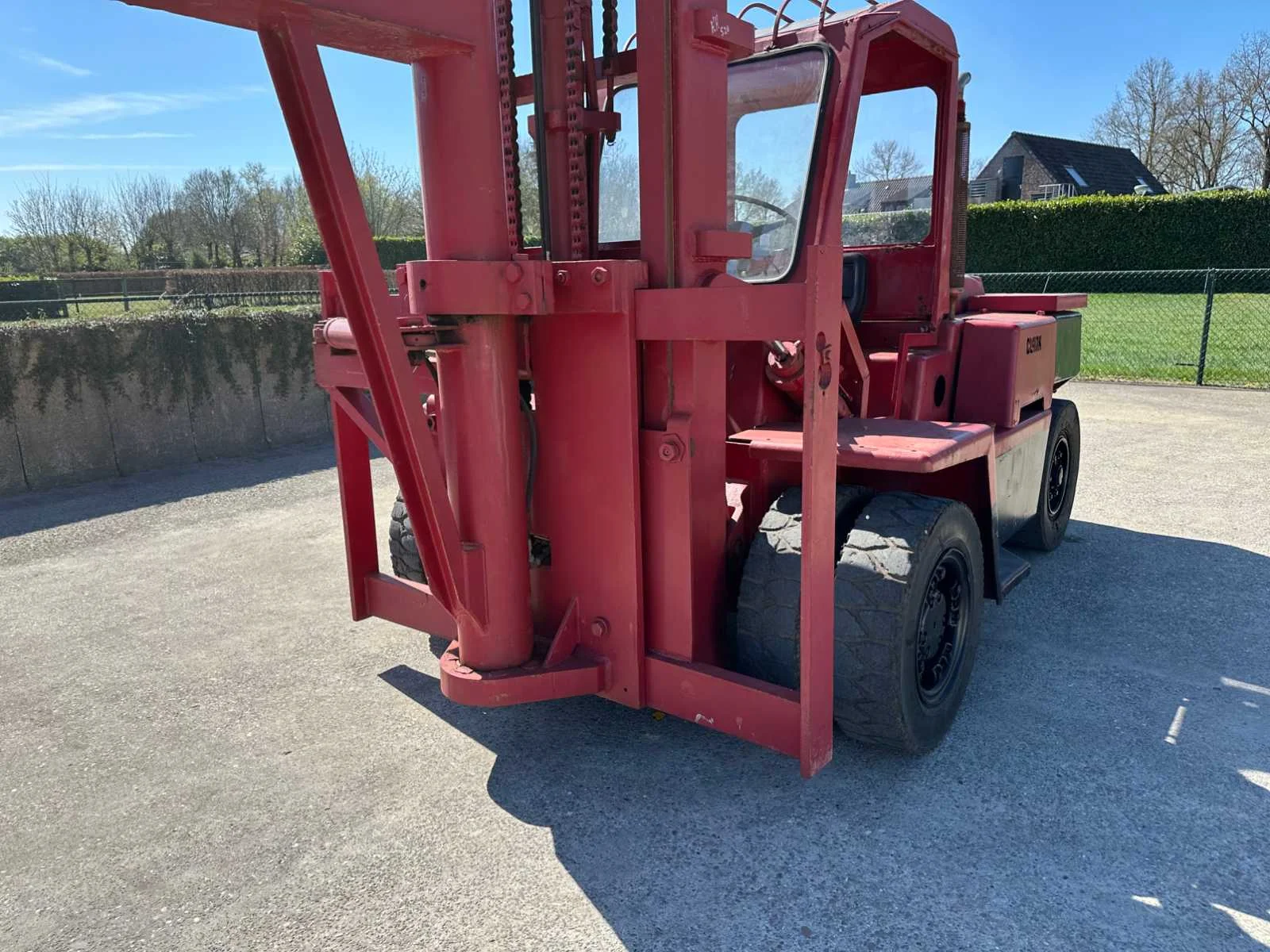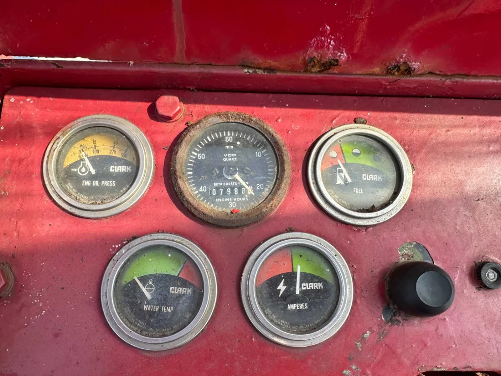 Voorzien van: uitschuifbare mast met zwenkfunctie, inclusief rek en stroppen voor boten laden en lossen; start, rijdt heft en daalt; Nee Merk: Clark Brandstof: Diesel Aantal wielen: 6 Afgelezen urenstand: 7992 Roterend vorkenbord: true Eigen gewicht: 11500kg Hefvermogen: 7000kg Vol rubber banden: true Diesel: true
