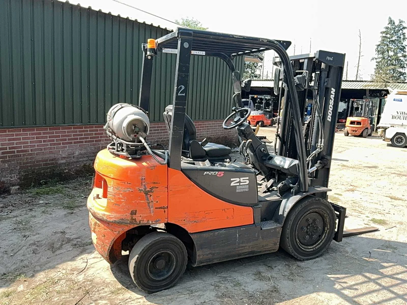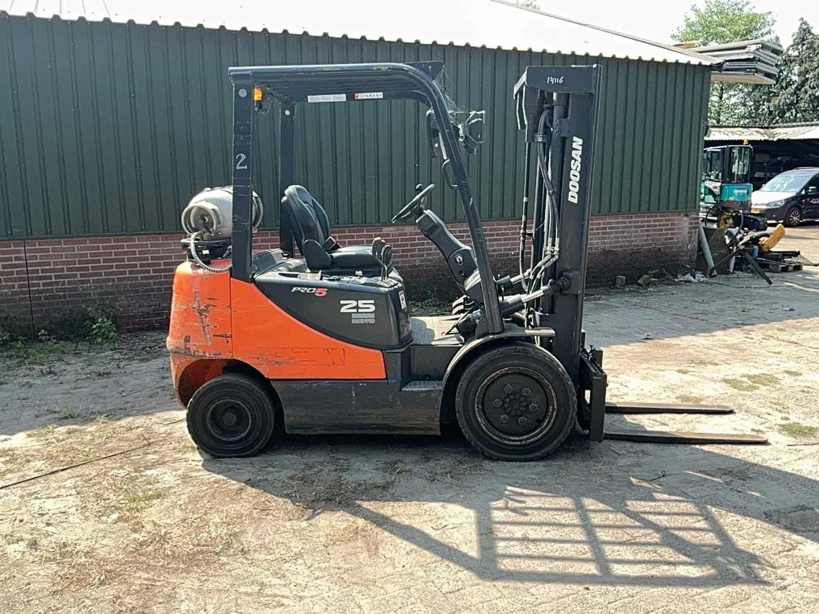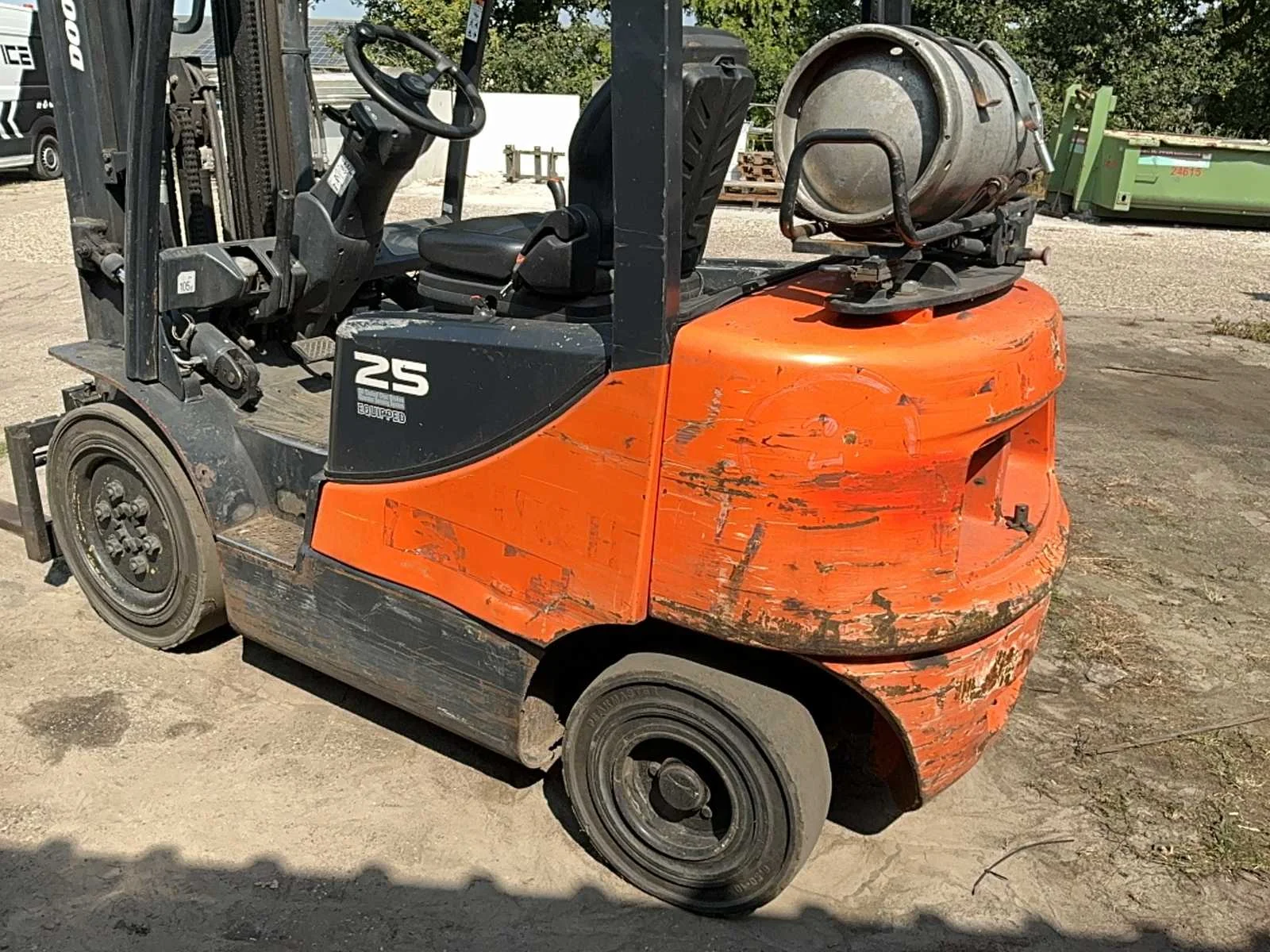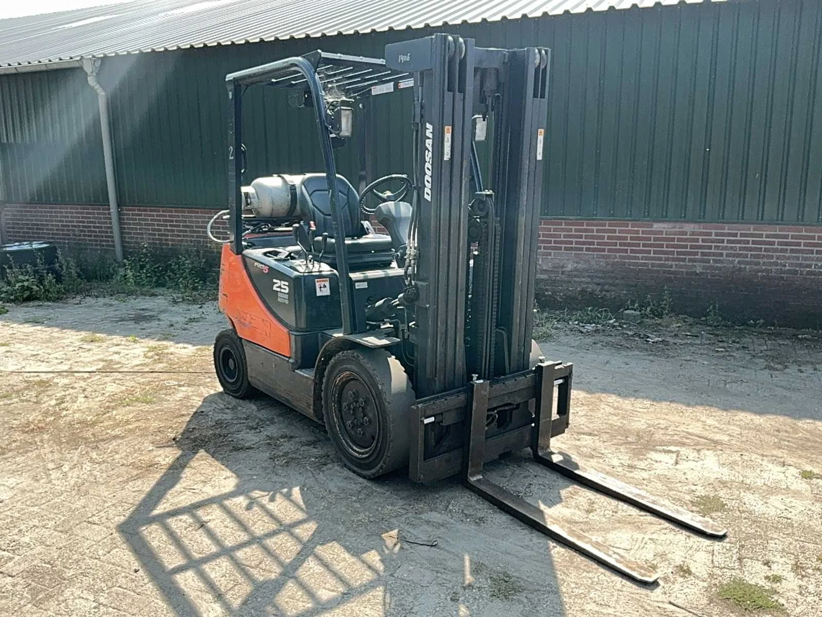 Voorzien van: werkverlichting, hydraulische aansluiting Nee Merk: Doosan Type: LP / G25E-5 Bouwjaar: 2015 Serienummer: FGA08-1710-06434 Brandstof: LPG Mast: Triple Soort band: Volrubber banden Aantal wielen: 4 Afgelezen urenstand: 7869 Eigen gewicht: 4122kg Hefvermogen: 2500kg Lepellengte: 1000mm Max. hefhoogte: 3230mm Vol rubber banden: true Totale afmeting L: 3600mm Totale afmeting Breedte: 1160mm Totale afmeting Hoogte: 2180mm
