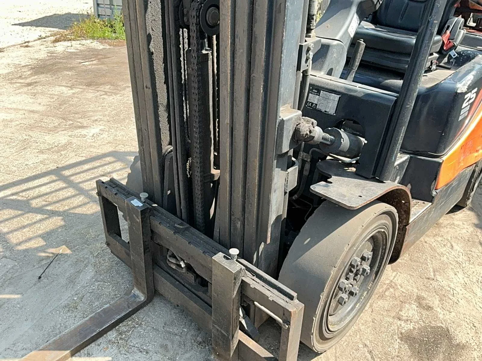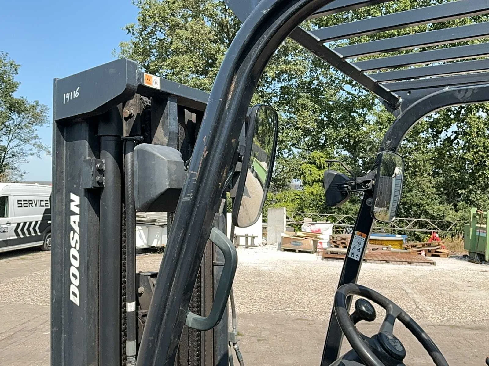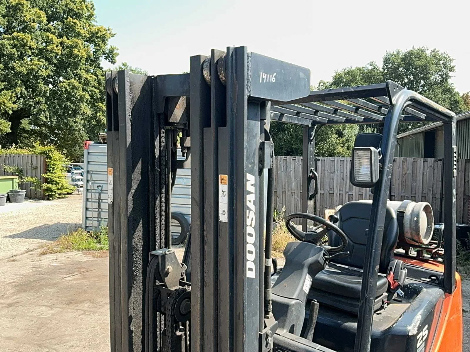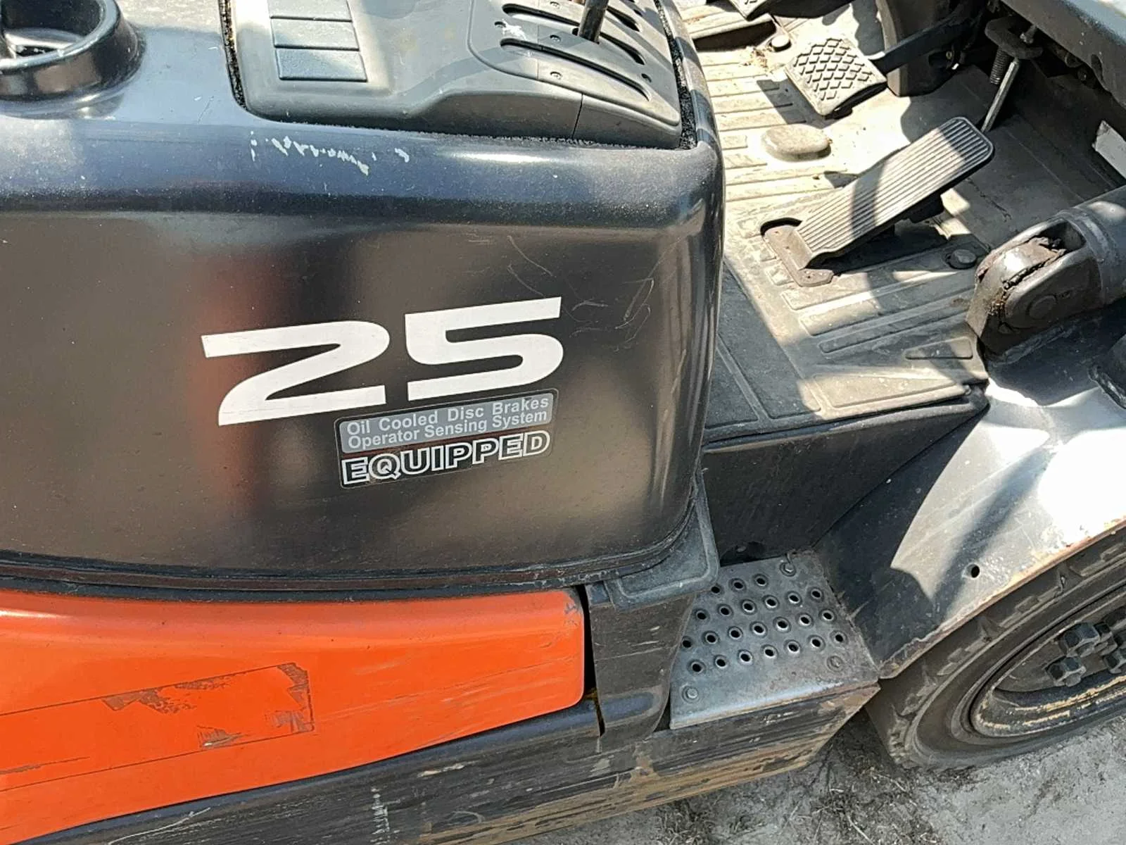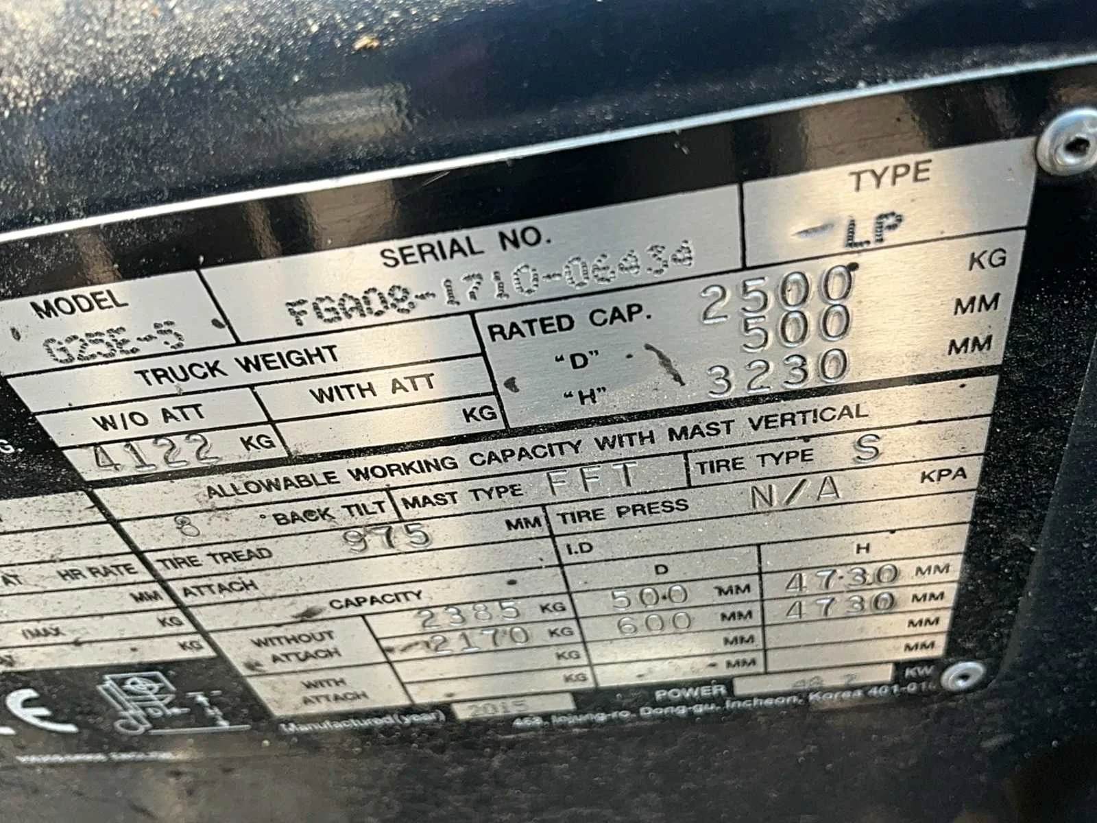 Voorzien van: werkverlichting, hydraulische aansluiting Nee Merk: Doosan Type: LP / G25E-5 Bouwjaar: 2015 Serienummer: FGA08-1710-06434 Brandstof: LPG Mast: Triple Soort band: Volrubber banden Aantal wielen: 4 Afgelezen urenstand: 7869 Eigen gewicht: 4122kg Hefvermogen: 2500kg Lepellengte: 1000mm Max. hefhoogte: 3230mm Vol rubber banden: true Totale afmeting L: 3600mm Totale afmeting Breedte: 1160mm Totale afmeting Hoogte: 2180mm