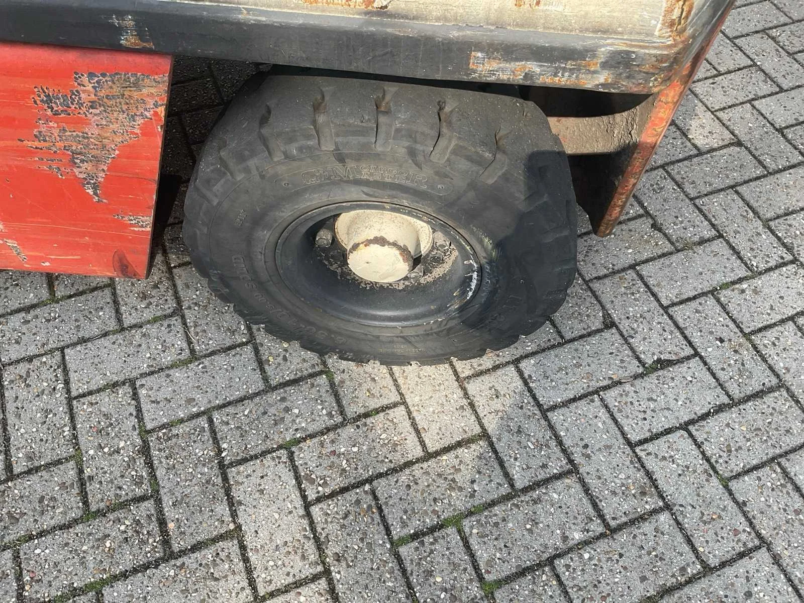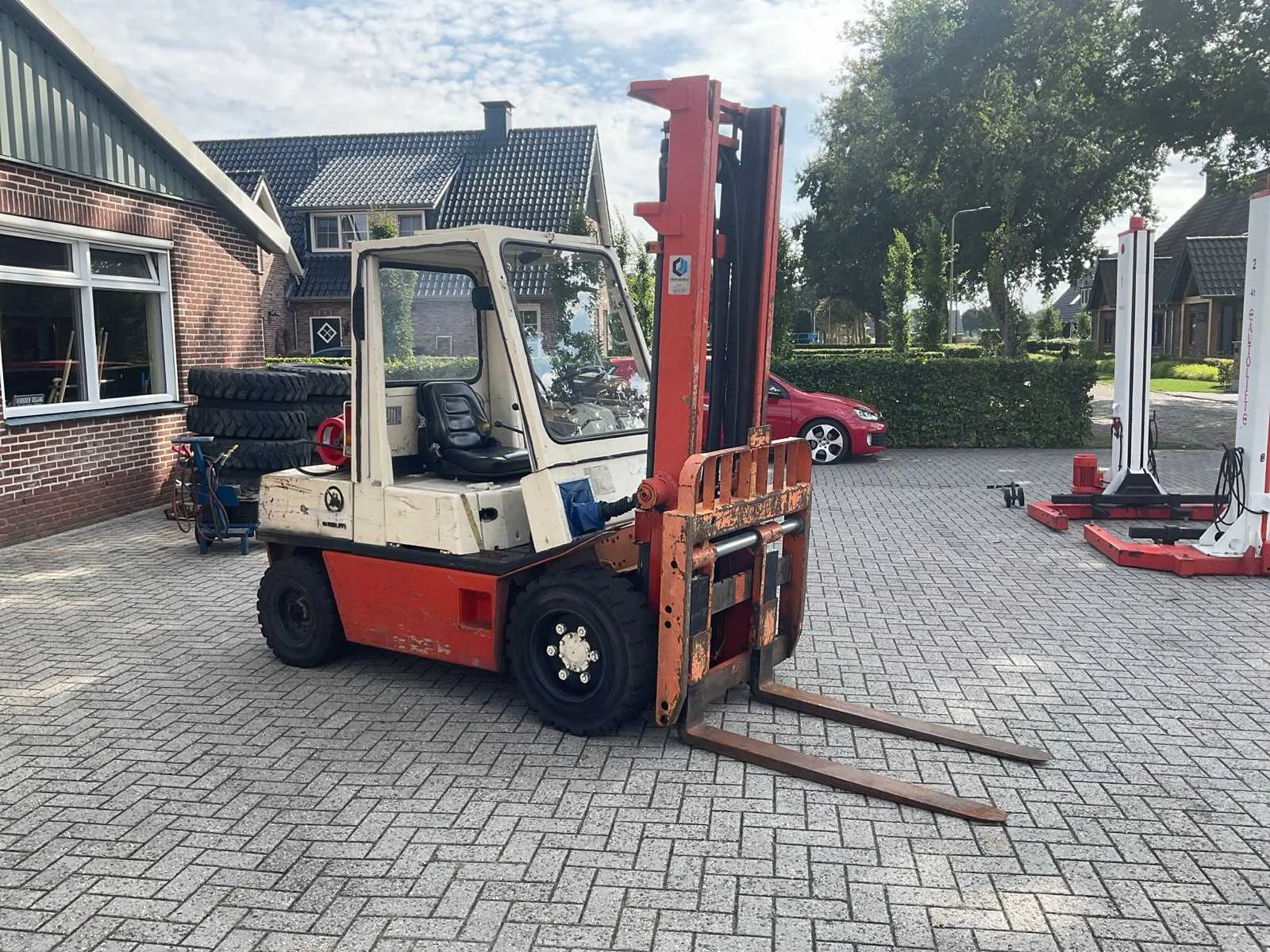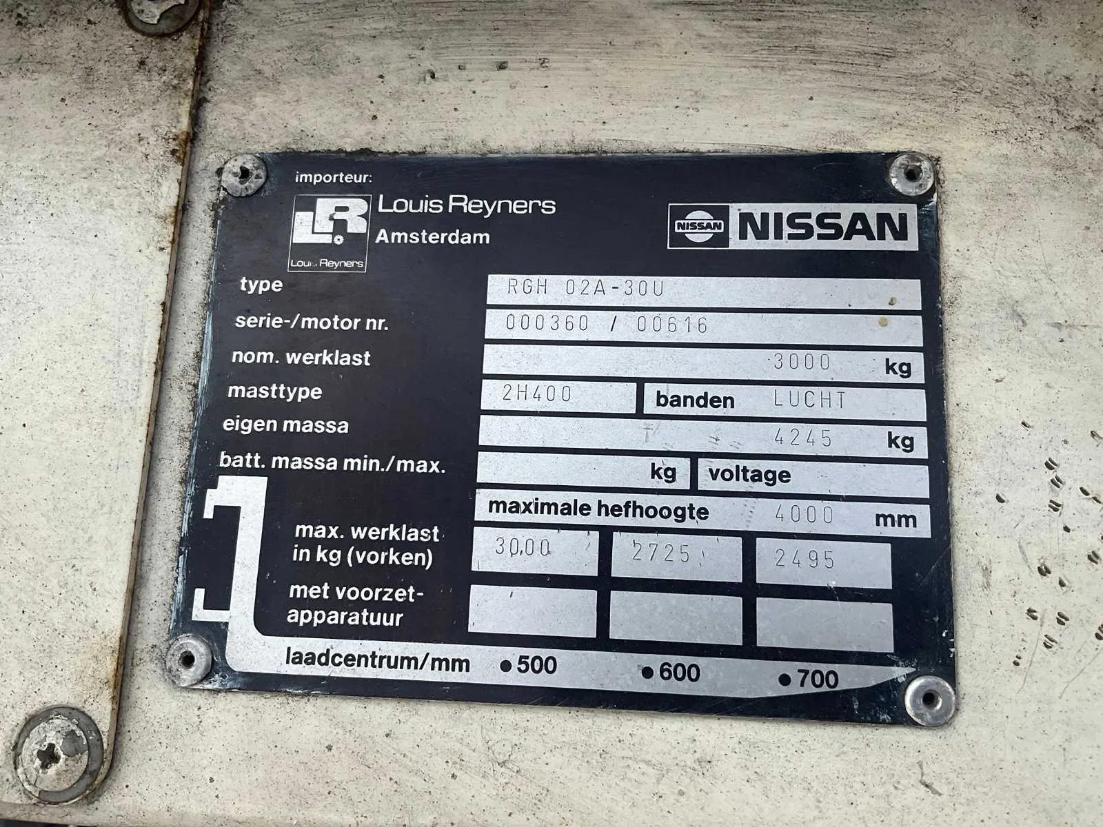 Nee Merk: Nissan Type: RGH 02A-30U Serienummer: 000360 Brandstof: Diesel Mast: Duplex Soort band: Volrubber banden Aantal wielen: 4 Afgelezen urenstand: 7625 Duplex mast: true Eigen gewicht: 4245kg Hefvermogen: 3000kg Lepellengte: 1200mm Min. hefhoogte: 2600mm Hefhoogte: 4000mm Vol rubber banden: true Totale afmeting L: 2600mm Totale afmeting Breedte: 1200mm Totale afmeting Hoogte: 2600mm LPG: true