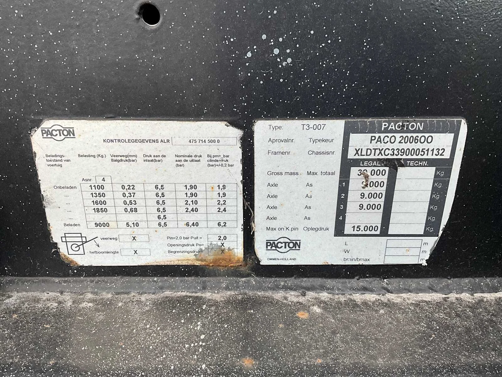 3x 9T SAF as, trommelremmen, opbergkist No Merk: Pacton Type: T3-007 Bouwjaar: 2005 Chassisnummer VIN: XLDTXC33900051132 Kenteken: OH-30-TS Datum eerste toelating (NL): 2005-03-10 Datum eerste toelating: 2005-03-10 APK vervaldatum: 2024-06-30 Aantal assen: 3 Laadvermogen: 33500kg Eigen gewicht: 5500kg