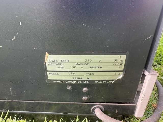 The Minolta Regma LR6 microfilm reader/printer offers various technical specifications, including: Magnification: Typically features a range of interchangeable lenses for different magnification levels, such as 18x, 24x, 30x, and 42x, allowing for viewing of various microfilm formats. Print Speed: Capable of producing prints at a rate of approximately 8 to 10 copies per minute. Print Sizes: Supports multiple print sizes, commonly A4 and A3, allowing for flexibility in output. Microfilm Formats: Designed to handle various microfilm formats, including 16mm and 35mm roll film, microfiche, and aperture cards. Features: Often includes automatic exposure control, image rotation, and focus adjustments for optimal viewing and printing quality. No Merk: Minolta Model: Regma Type: LR6