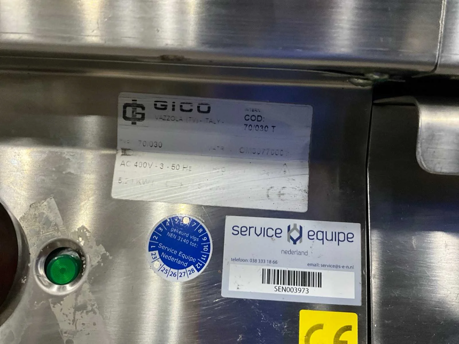 400 volt.; 5,2 kw. Nee Merk: Gico Model: 70/030 Materiaal: rvs Totale afmeting Breedte: 800mm Totale afmeting L: 720mm Totale afmeting Hoogte: 900mm