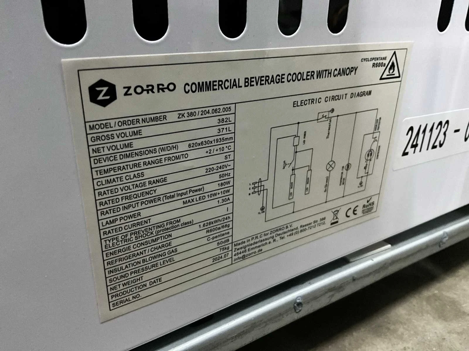 2024 zorro zk 380 glasdeur koelkast