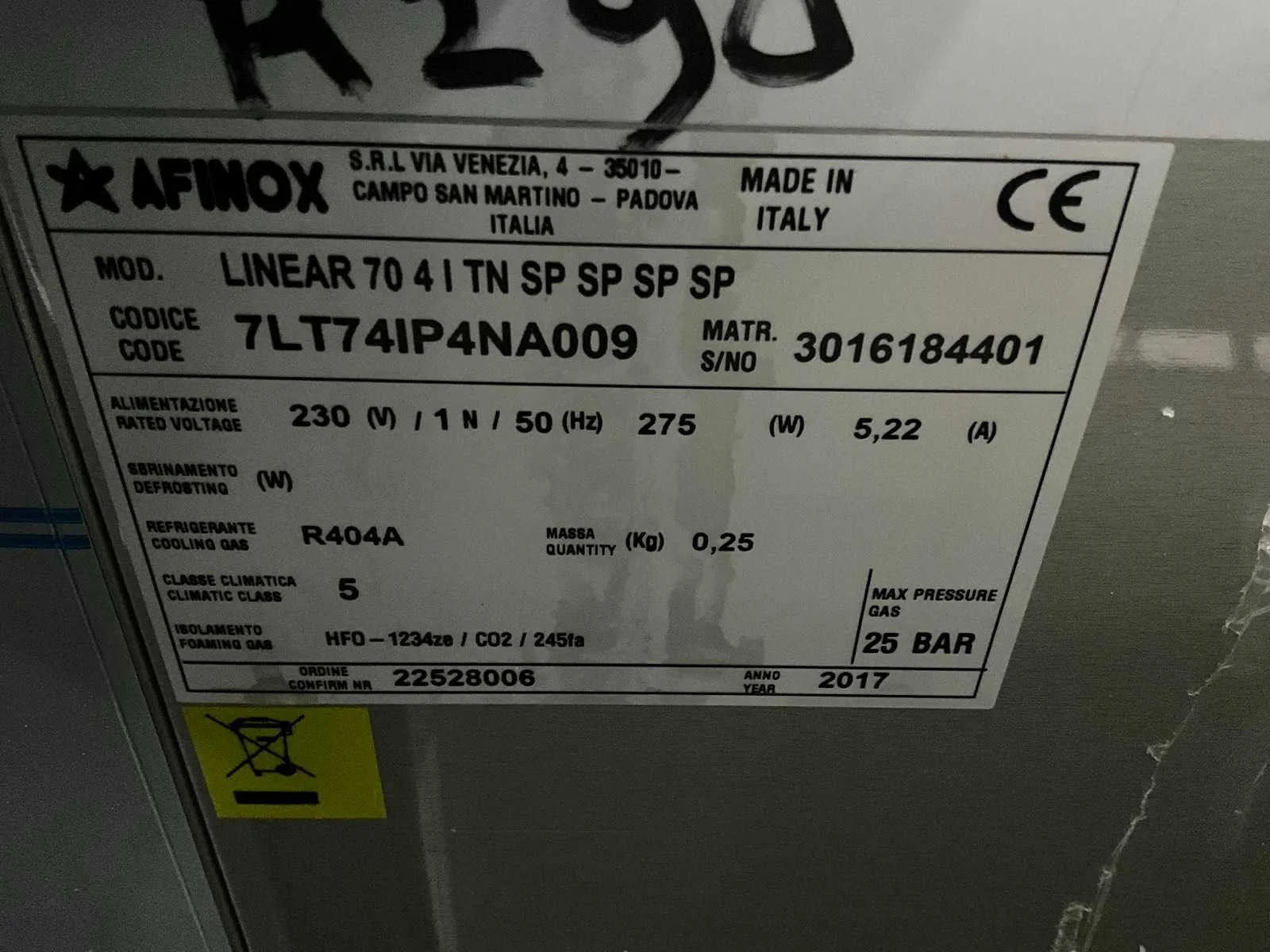 275 watt. Nee Merk: Afinox Type: Linear 70 4 I TN Totale afmeting L: 225cm Totale afmeting Breedte: 70cm Totale afmeting Hoogte: 90cm Ingebouwde koelcompressor: true Rvs: true Aansluiting: 230V Aantal laden: 8pcs