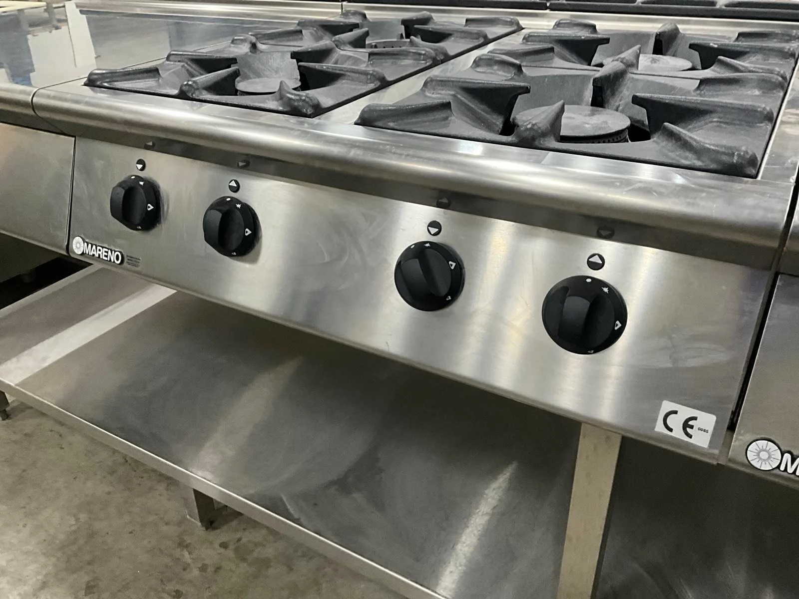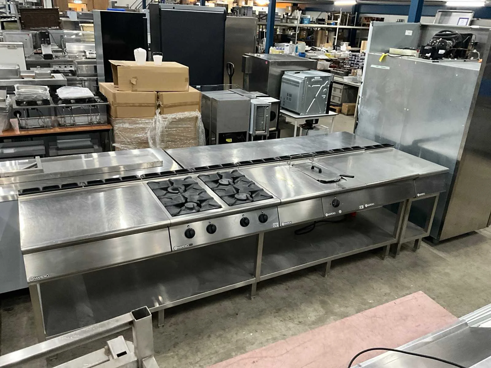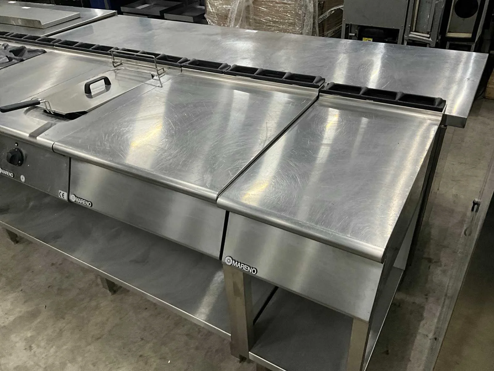 Voorzien van 4-pits gasfornuis en enkele elektrische friteuse; 4 x neutrale unit met lade. No Merk: Mareno Model: 07859 Materiaal: rvs Totale afmeting Breedte: 3410mm Totale afmeting L: 750mm Totale afmeting Hoogte: 900mm