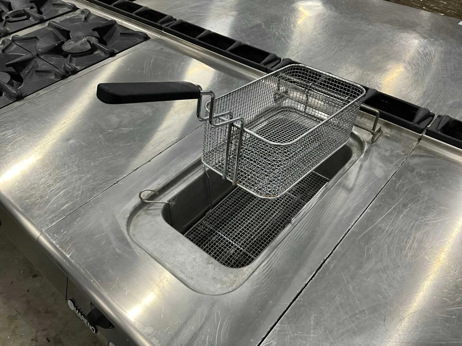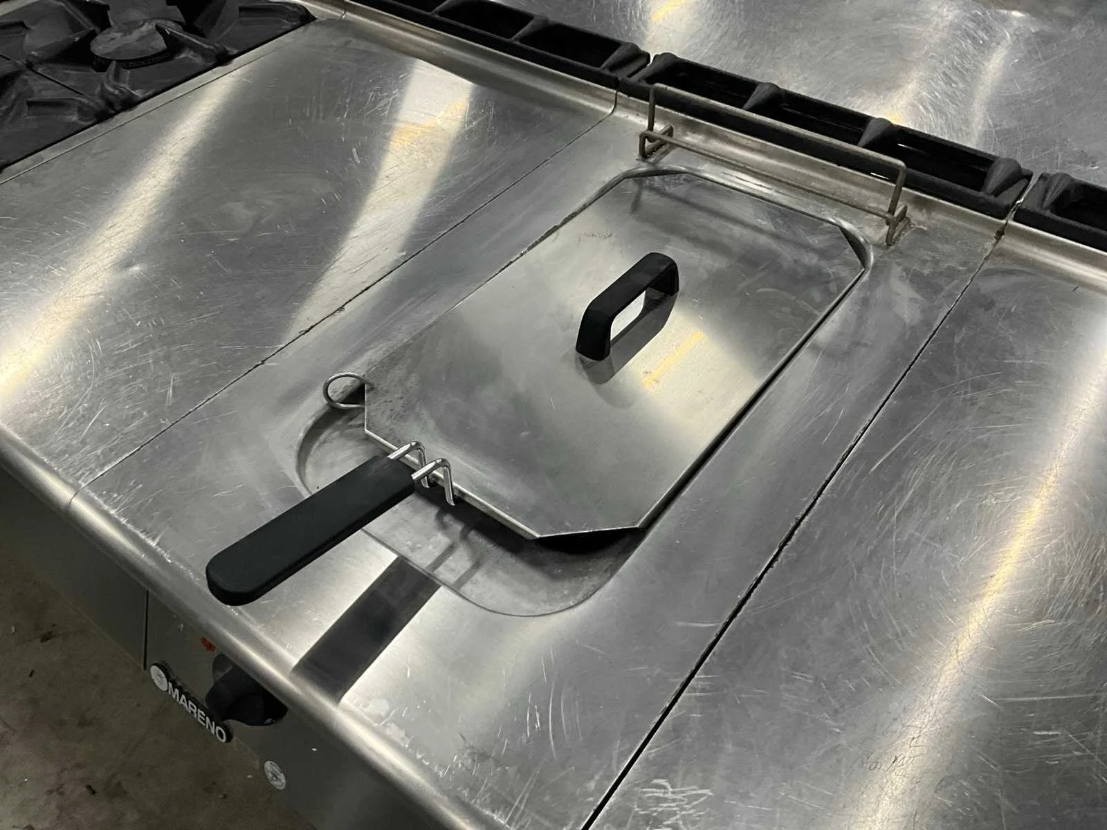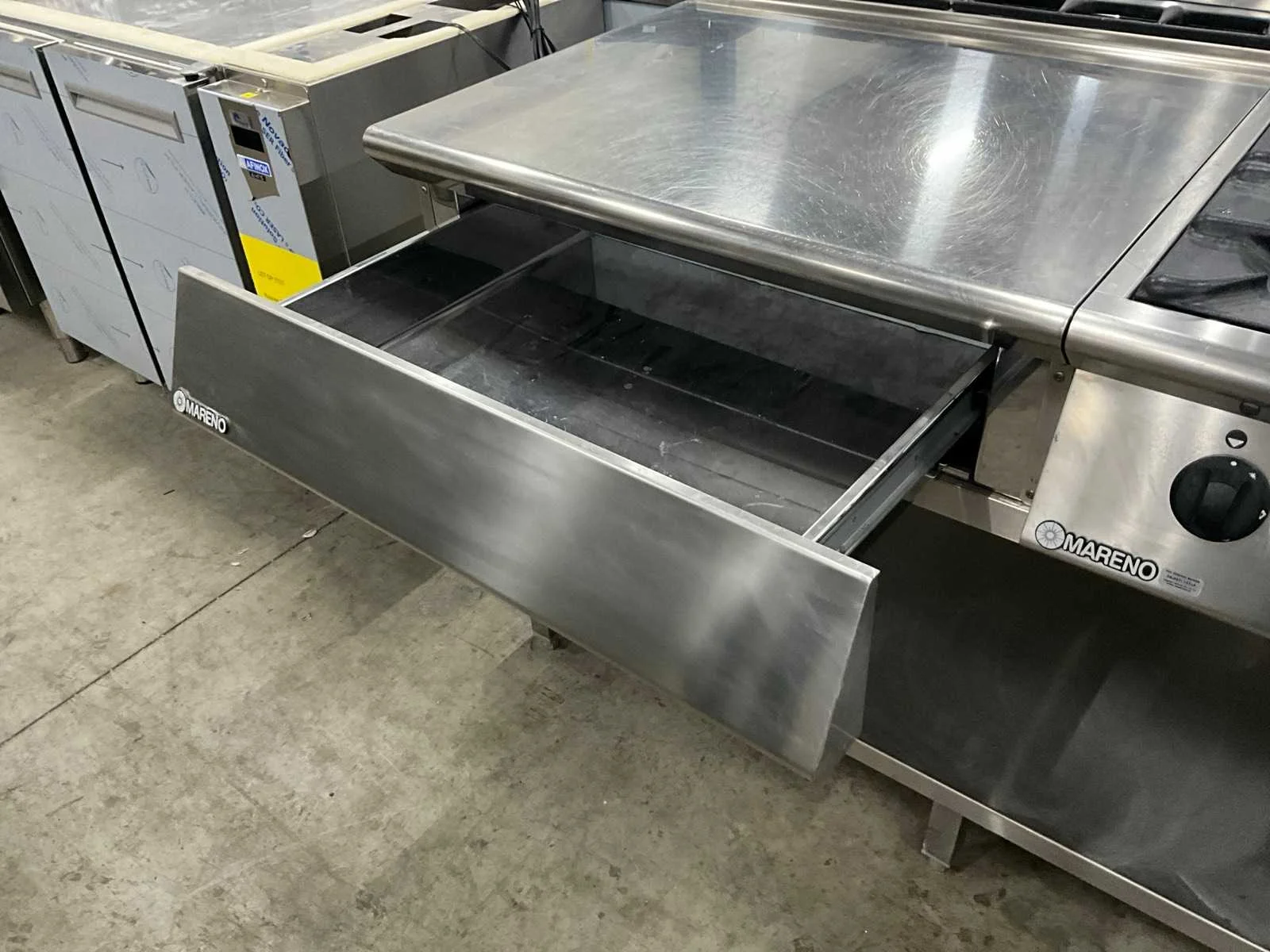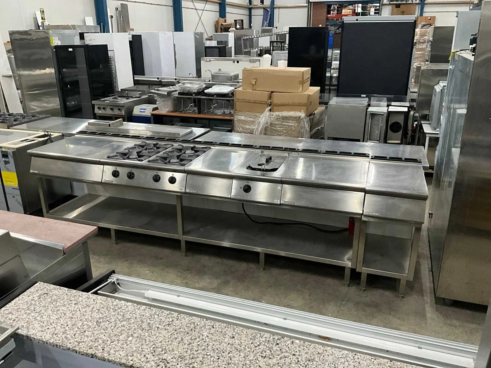 Voorzien van 4-pits gasfornuis en enkele elektrische friteuse; 4 x neutrale unit met lade. No Merk: Mareno Model: 07859 Materiaal: rvs Totale afmeting Breedte: 3410mm Totale afmeting L: 750mm Totale afmeting Hoogte: 900mm