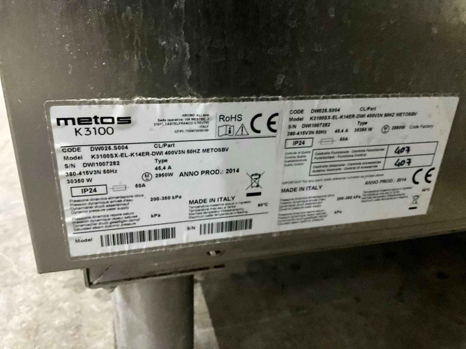 No Merk: Metos Type: K 3100 Rvs: true Vermogen: 30.35kW Aansluiting: 400V Korf afmeting l: 50cm Korf afmeting b: 50cm Totale afmeting L: 2400mm Totale afmeting Breedte: 750mm Totale afmeting Hoogte: 2000mm