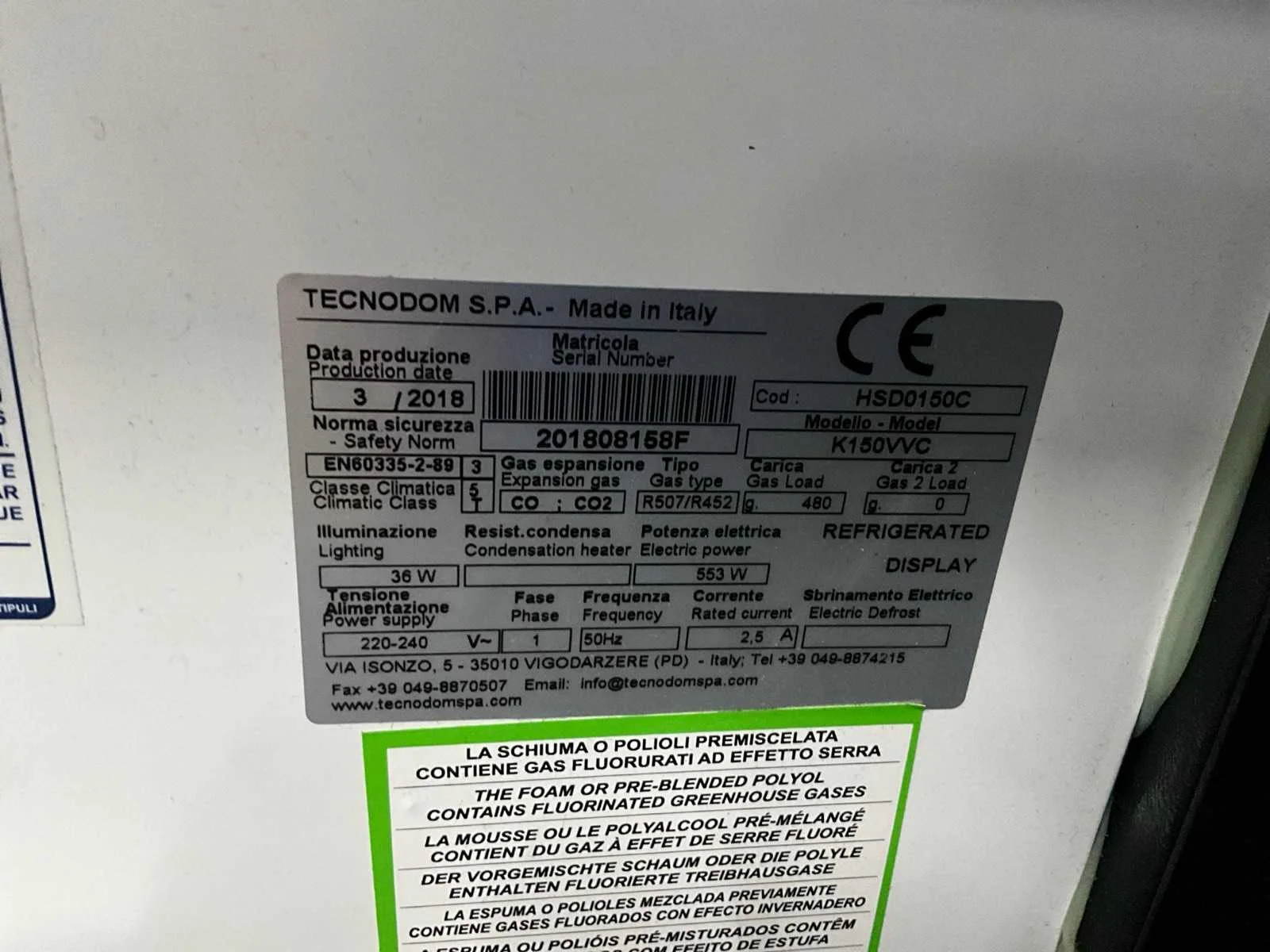 553 watt.; voorzien van glasopbouw. Nee Merk: Tecnodome Type: HSD0150C Bouwjaar: 2018 Ingebouwde koelcompressor: true Aansluiting: 230V Totale afmeting L: 1450mm Totale afmeting Breedte: 900mm Totale afmeting Hoogte: 1300mm