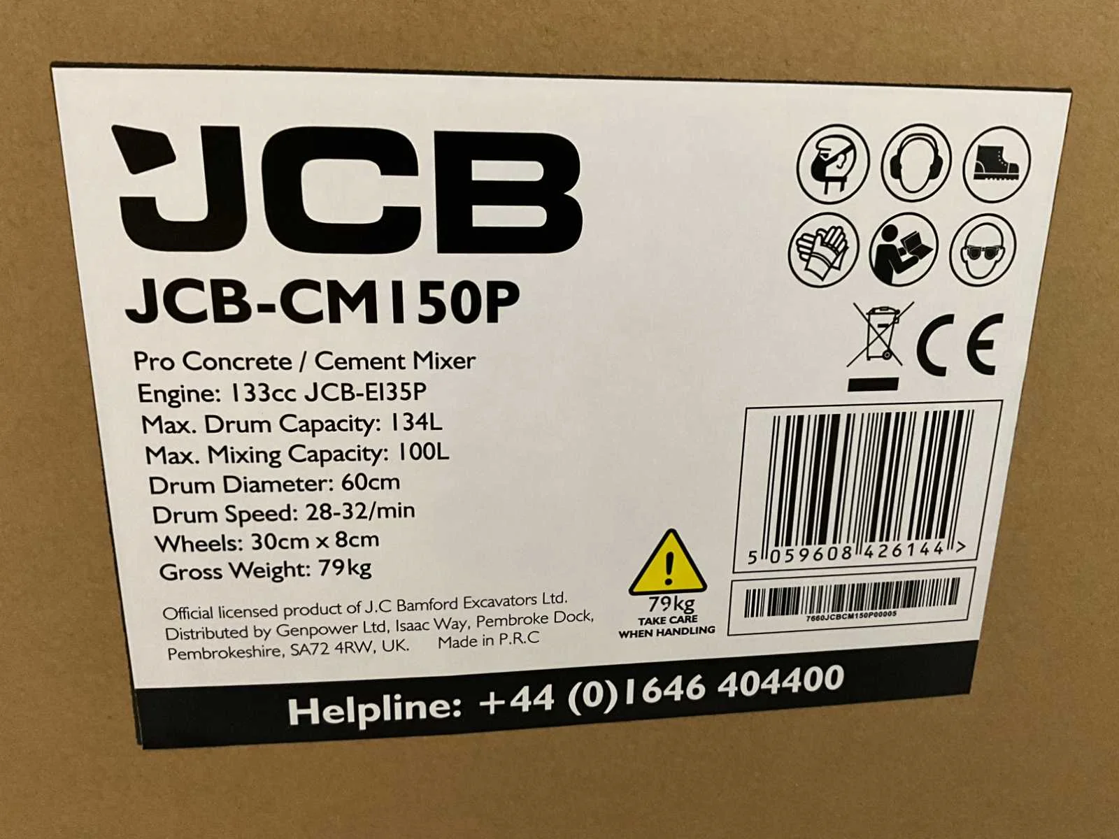 Ongebruikt Specificaties: Model JCB-CM150P Startmethode Terugslagstart Maximaal motorvermogen (kW) 2.4 Motorinhoud (cc) 133 Snelheid (RPM) 3200 Peddels 2 Gelast Trommelsnelheid (rpm) 28-32 Trommelinhoud (L) 134 Mengcapaciteit (L) 100 Tandwieltype Tandwielreductie + riem Chassismateriaal Staal Trommeldiameter (mm) 600 Trommelhoogte (mm) 604 Trommelmond (mm) 373 Trommeldikte (mm) 1.5 Kantelinrichting Ja Wieldiameter (cm) 30×8 Wielmateriaal Samengesteld Geluidsniveau (db) 96.32 Brutogewicht (kg) 79 Nettogewicht (met standaard) (kg) 72 Nettogewicht (zonder standaard) (kg) 60.8 Afmetingen volledig gemonteerd (H x B x L) (mm) 1430x1300x735 Pakket afmetingen (H x B x L) (mm) 960x655x915 Brandstof/energiebron Benzine Brandstofcapaciteit (L) 2.5 Motorolie capaciteit (L) 0,6 Producttype Cementmolen Model-EAN 5059608426144 Nee Merk: JCB Model: CM150P Gewicht: 79 Lengte: 143cm Breedte: 130cm Hoogte: 73cm